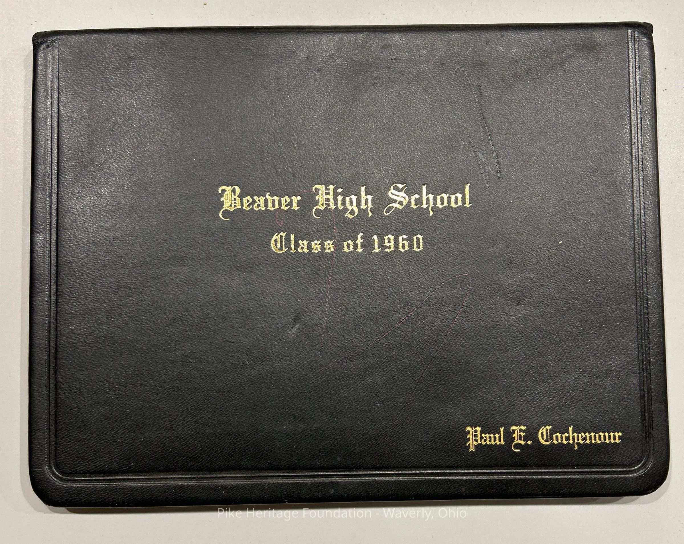 1960 high school diploma for Paul E. Cochenour, a graduate of Beaver High School. The diploma is placed within a cover and is signed by the schools principal C. E. Nunley, County Superintendent J. E Way, President of the Board of Education Martin Vulgamore, and Board of Education Clerk Carl Hartley.Collection