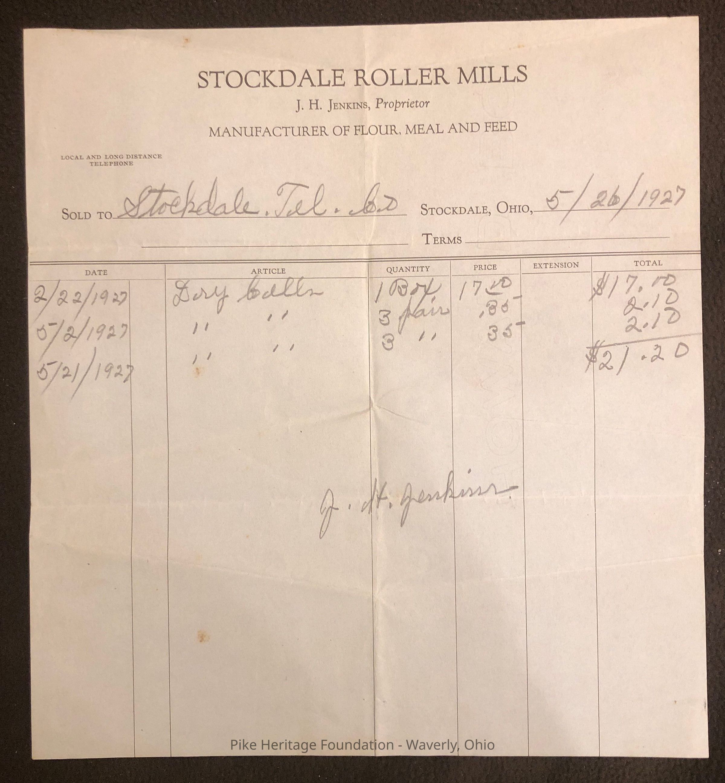 One or two receipts from the Stockdale Roller Mills located in Stockdale, Ohio. The Stockdale Roller Mills was operated by J. H. Jenkins in the Village of Stockdale in Marion Township.Collection