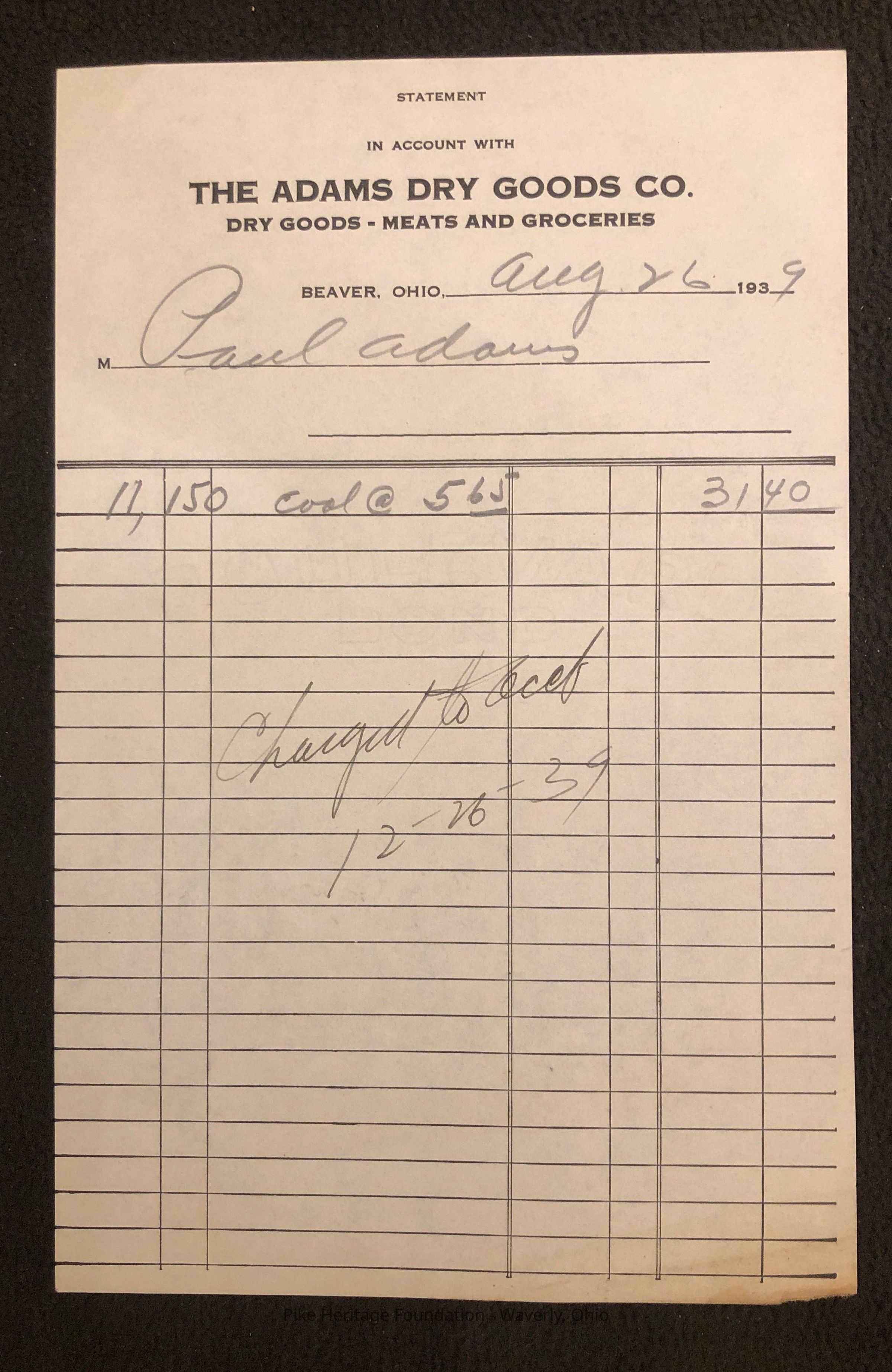 Adams Dry Goods Company Receipt – 1939Entry/Object ID