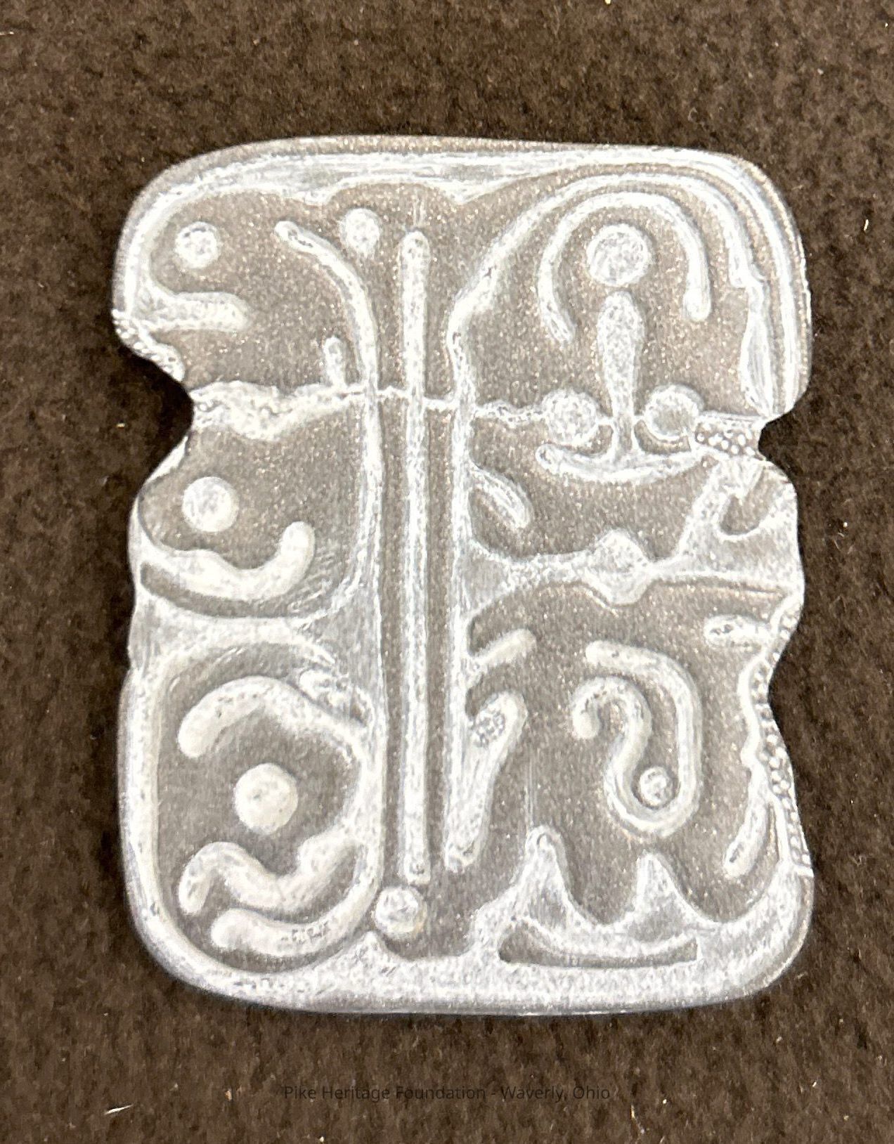 The Waverly tablet, represented by this replica, was found in Pike County, Ohio. It was made between 2000 and 3000 years ago by the Woodland Indians, also called the Adena people, who created graphic, artifacts and stone, clay, shell, and bone. They lived in the Ohio Valley from Western Pennsylvania to the Mississippi River. This tablet is carved in shell or siltstone and measures 3 3/8“ x 2 5/8“ x 5/16“. The original is on exhibit at the Cincinnati Art Museum. The artist that created the replica is Carol Shelton, who lives in Columbus, Ohio.Acquisition