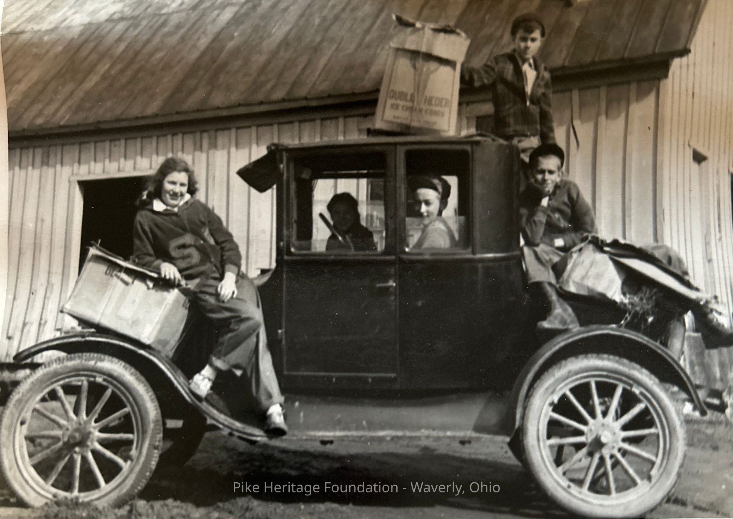Photograph of Stockdale youth participating in a World War Two Waste Paper Recycling Drive for Boy Scout Troop 89. Pictured are Jimmie Kuhn and his Model T Ford, Dora Jane Ezell, Bill Jenkins, and Jack Brunner (top).Acquisition