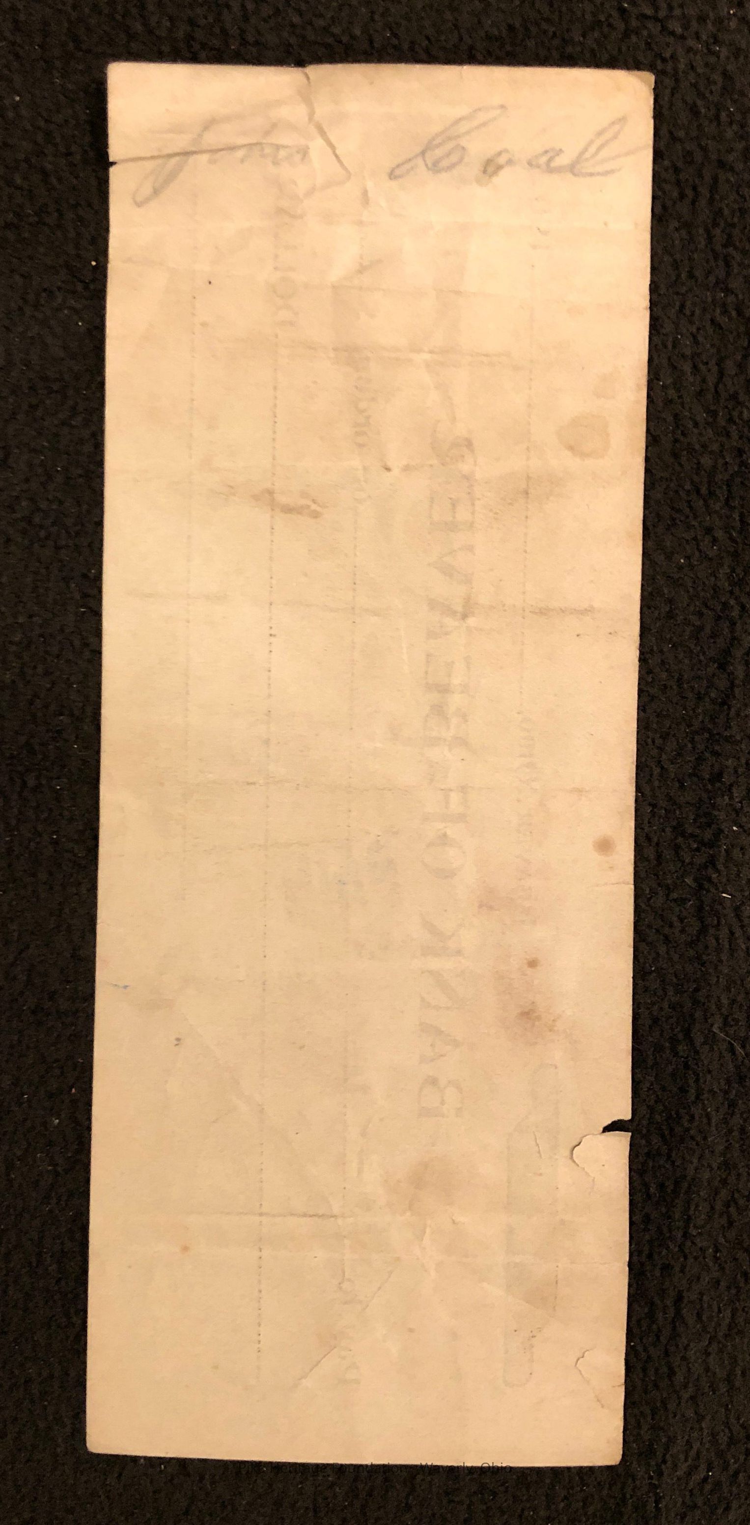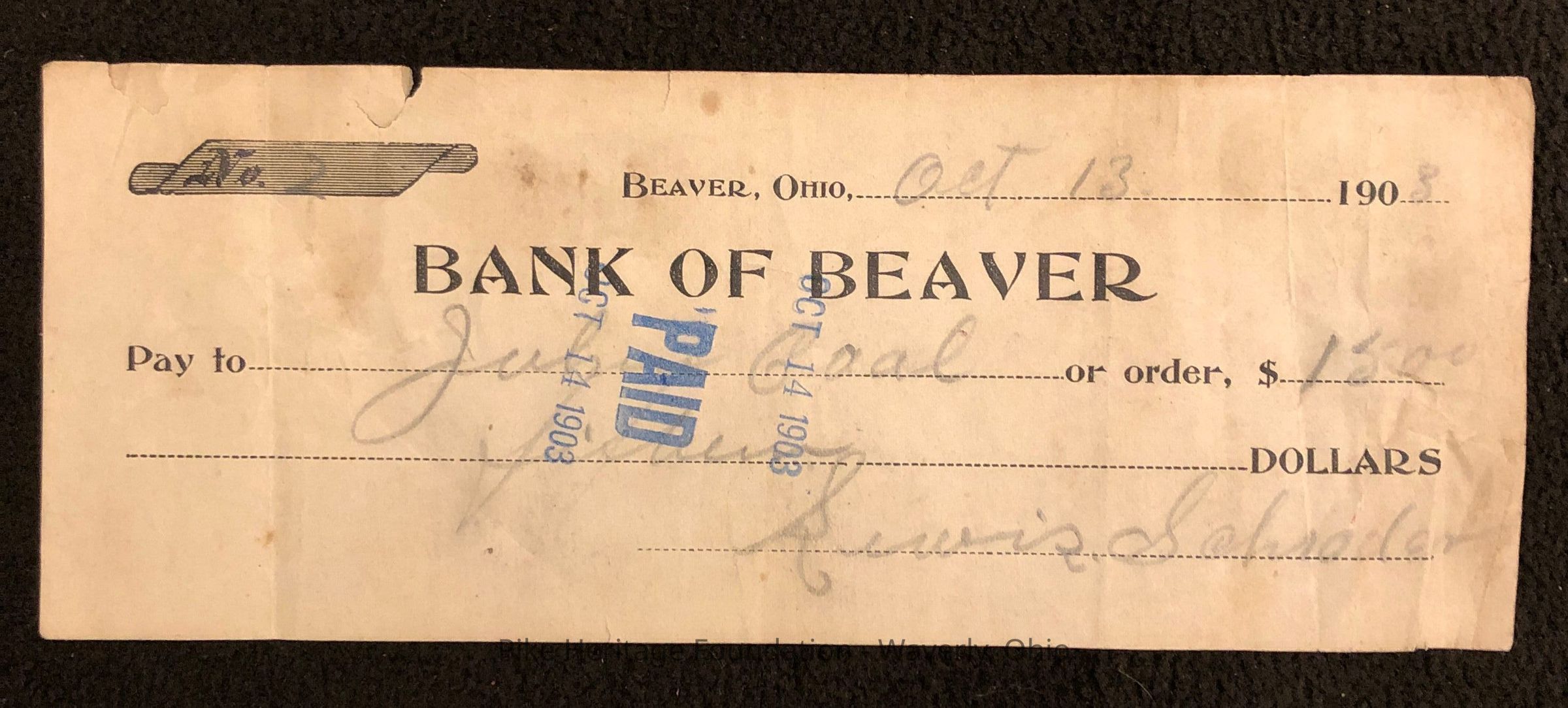 Personal check written by Lewis Schaefer on October 13, 1903 from the Bank of Beaver.Collection