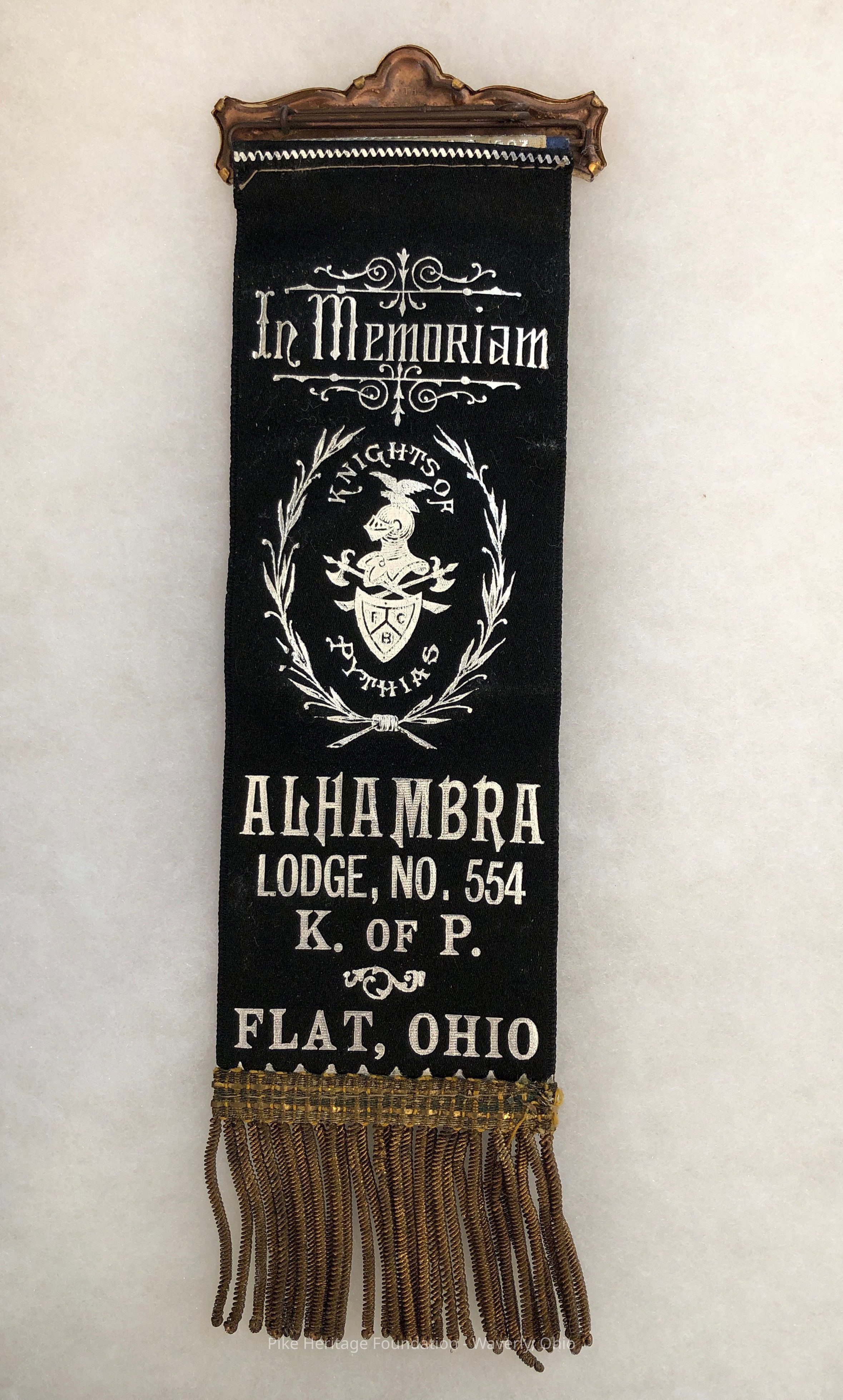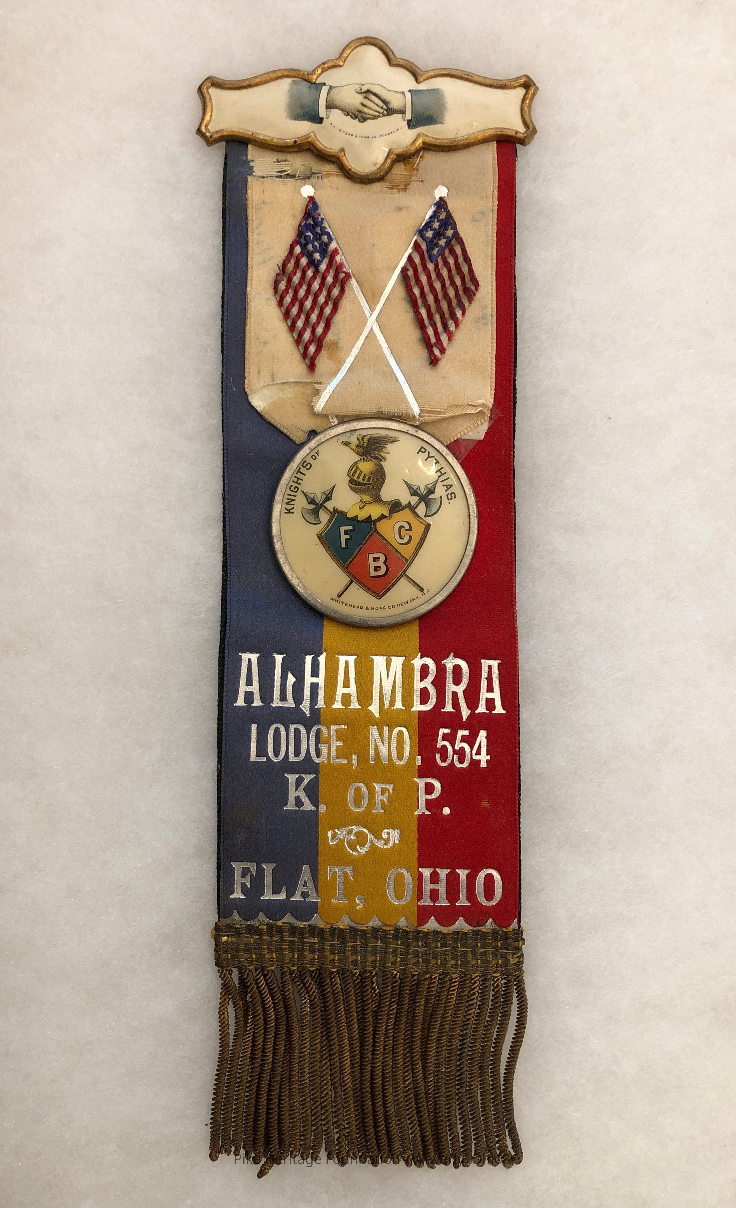 Membership ribbon worn by members of the Flat, Ohio Alhambra Lodge No. 554 Knights of Pythias. Dates to the 1890’s prior to the community changing it’s name to Stockdale.Collection