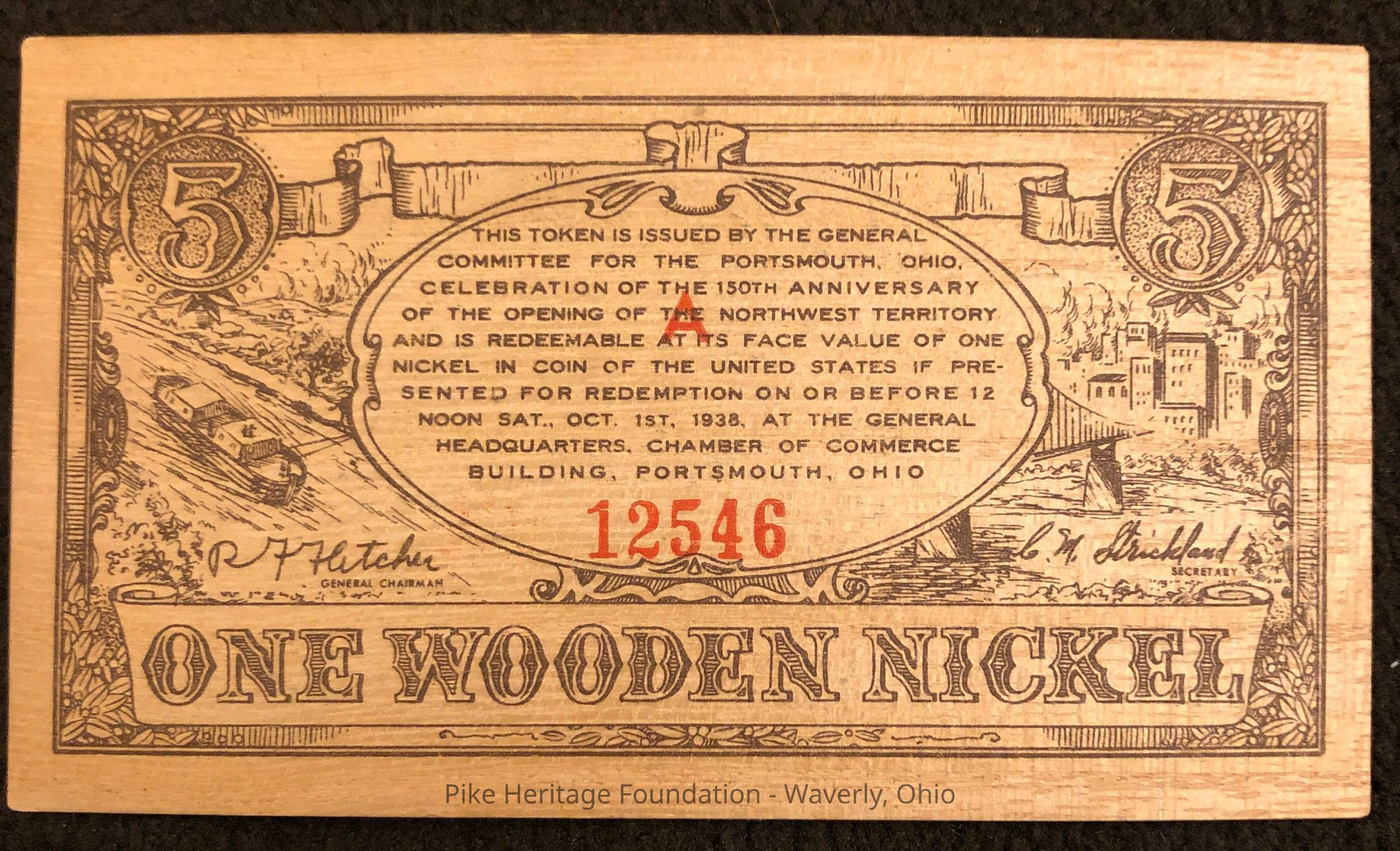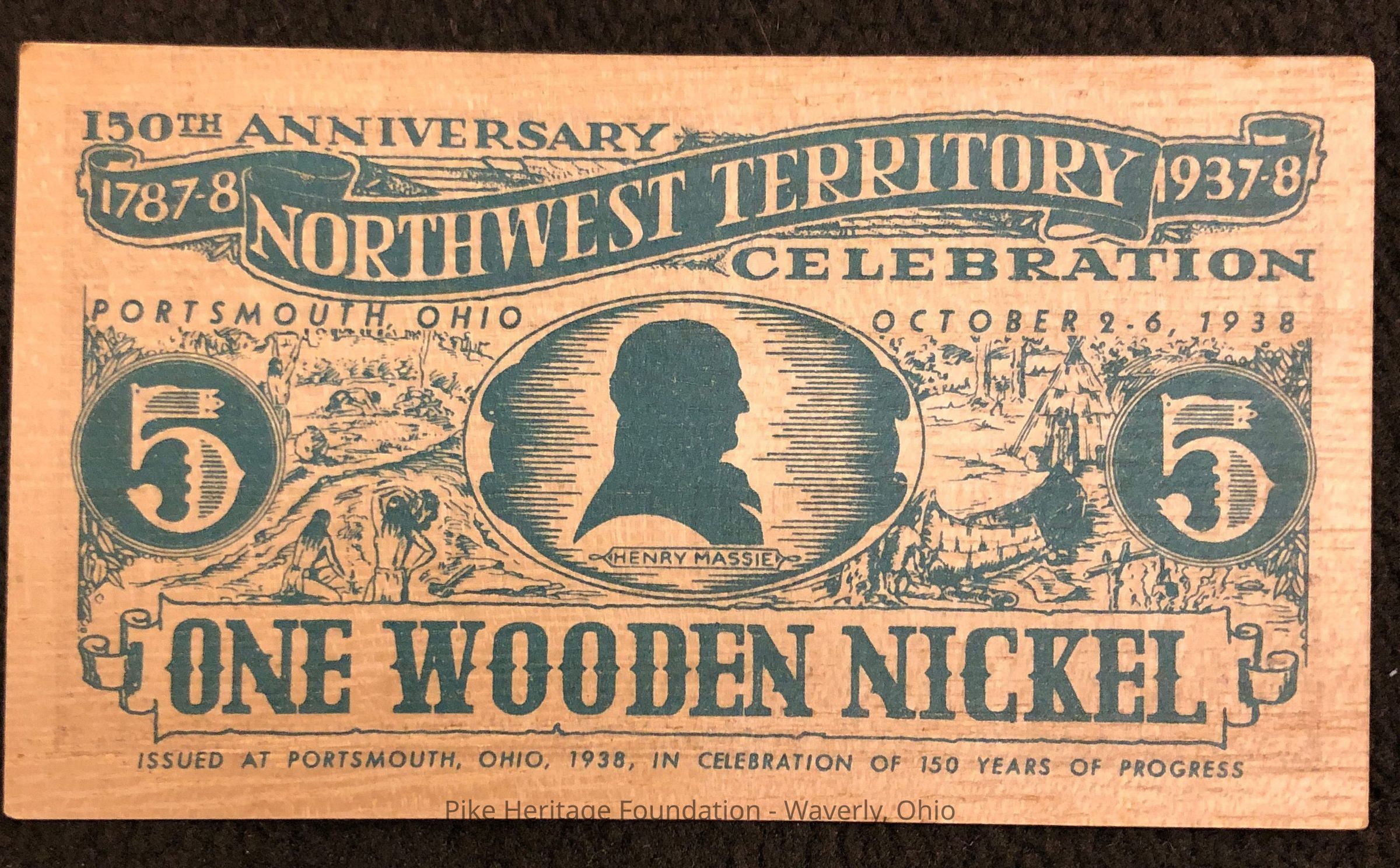 Wooden nickel printed in Portsmouth, Ohio in 1938 to celebrate the 150th anniversary of the purchase of the Northwest Territory.Collection