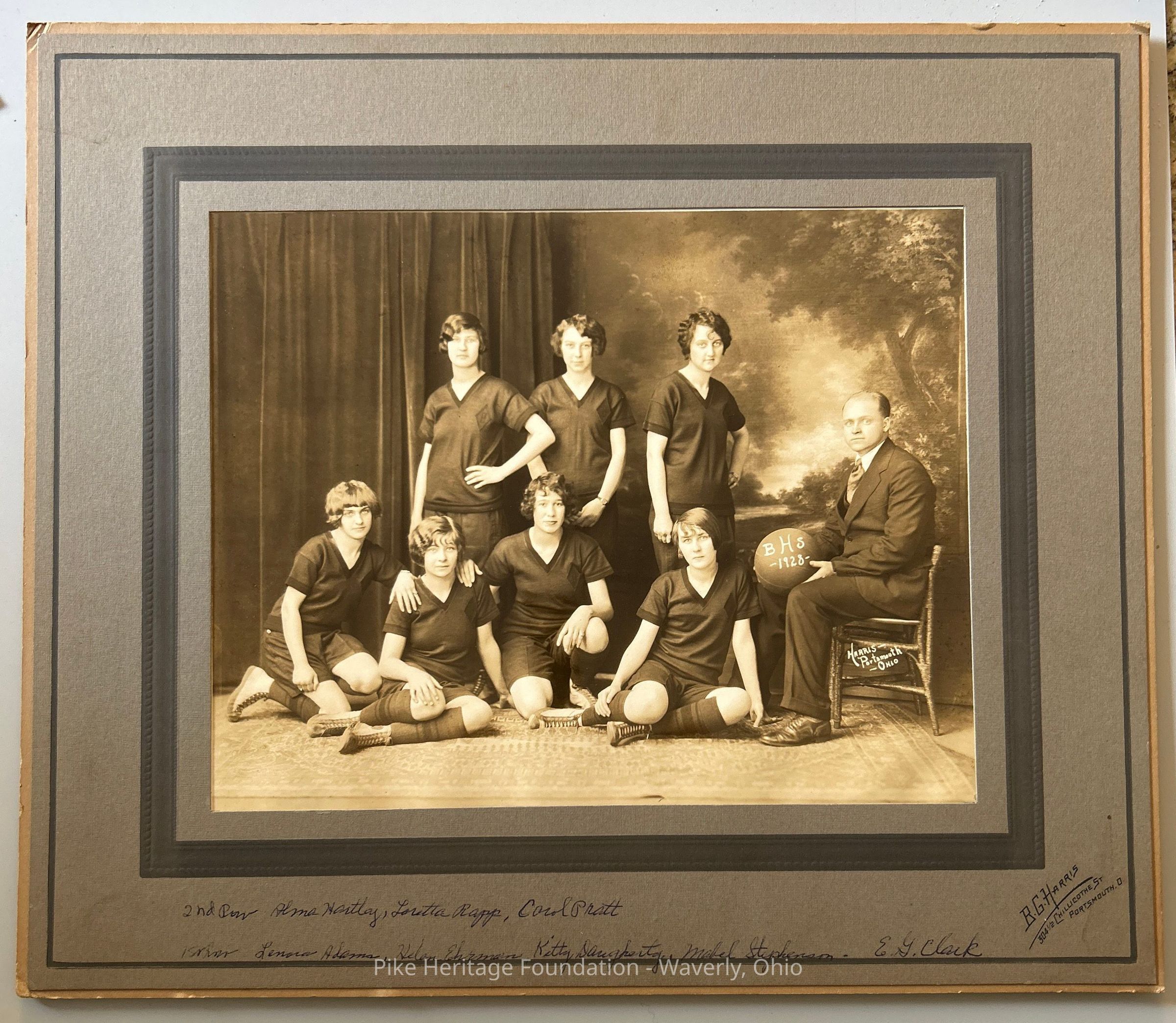 1928 Beaver high school girls basketball team. First row left to right: Lenora Adams, Helen Ehrman, Kitty Daughtery, Mabel Stephenson, and E. G. Clark. Second row, Alma Hartley, Loretta Rapp, and Carol Pratt.Collection