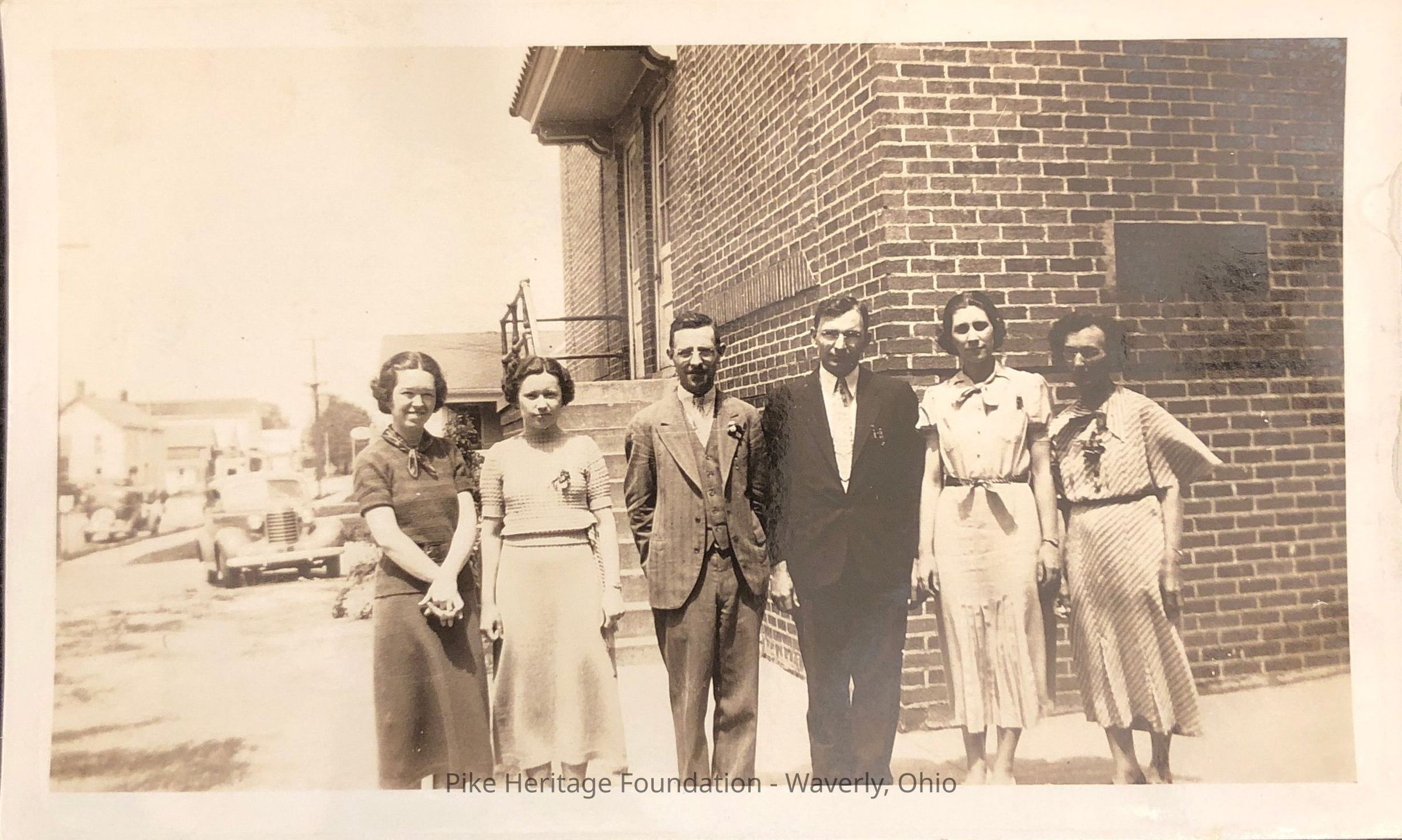 Teaching staff posing in front of Beaver High School. Persons include Mildred Lahm, Robert Lahm, and Guy Brammer.Collection