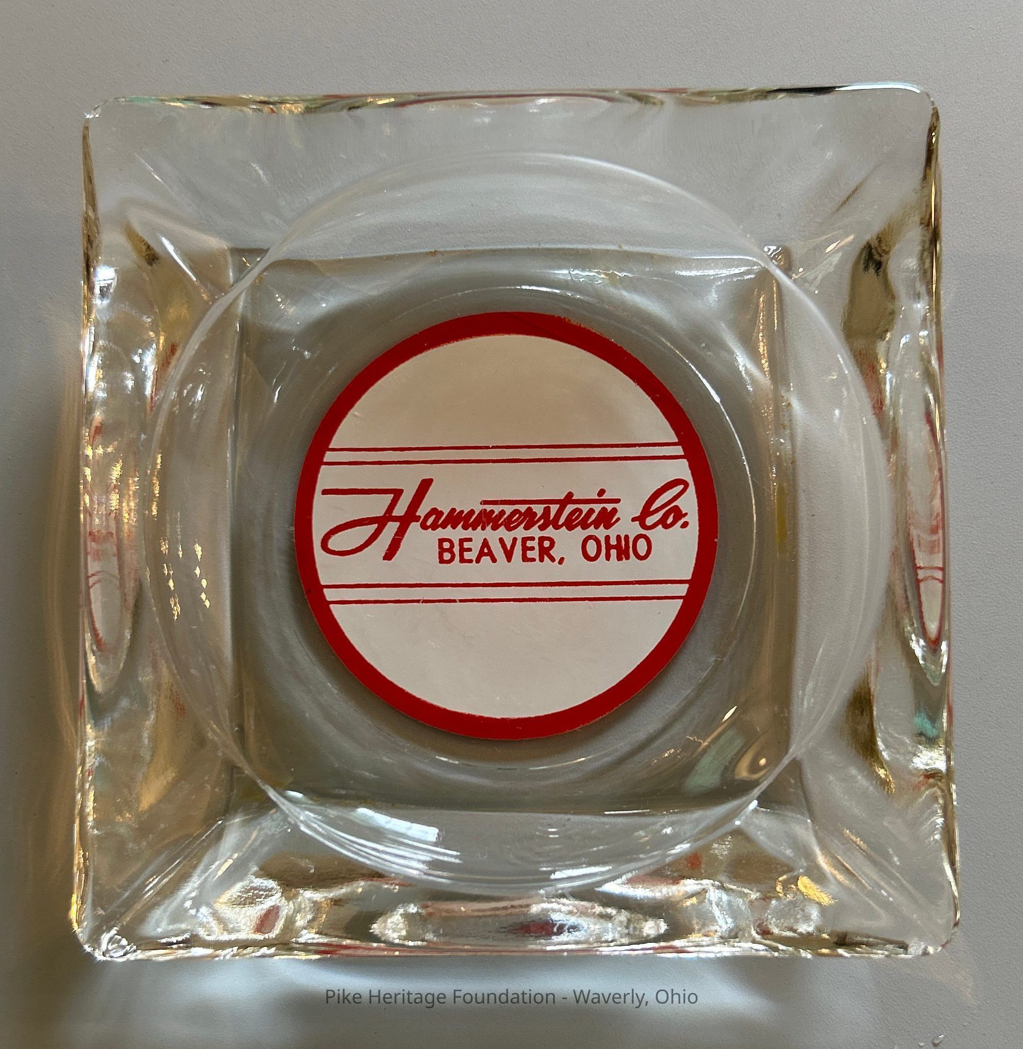 Cigarette ashtray produced by the Hammerstein Company of Beaver, Ohio. The Hammerstein Company was an undertaking establishment and furniture store located in Beaver, Ohio and Pike County, Ohio.Collection