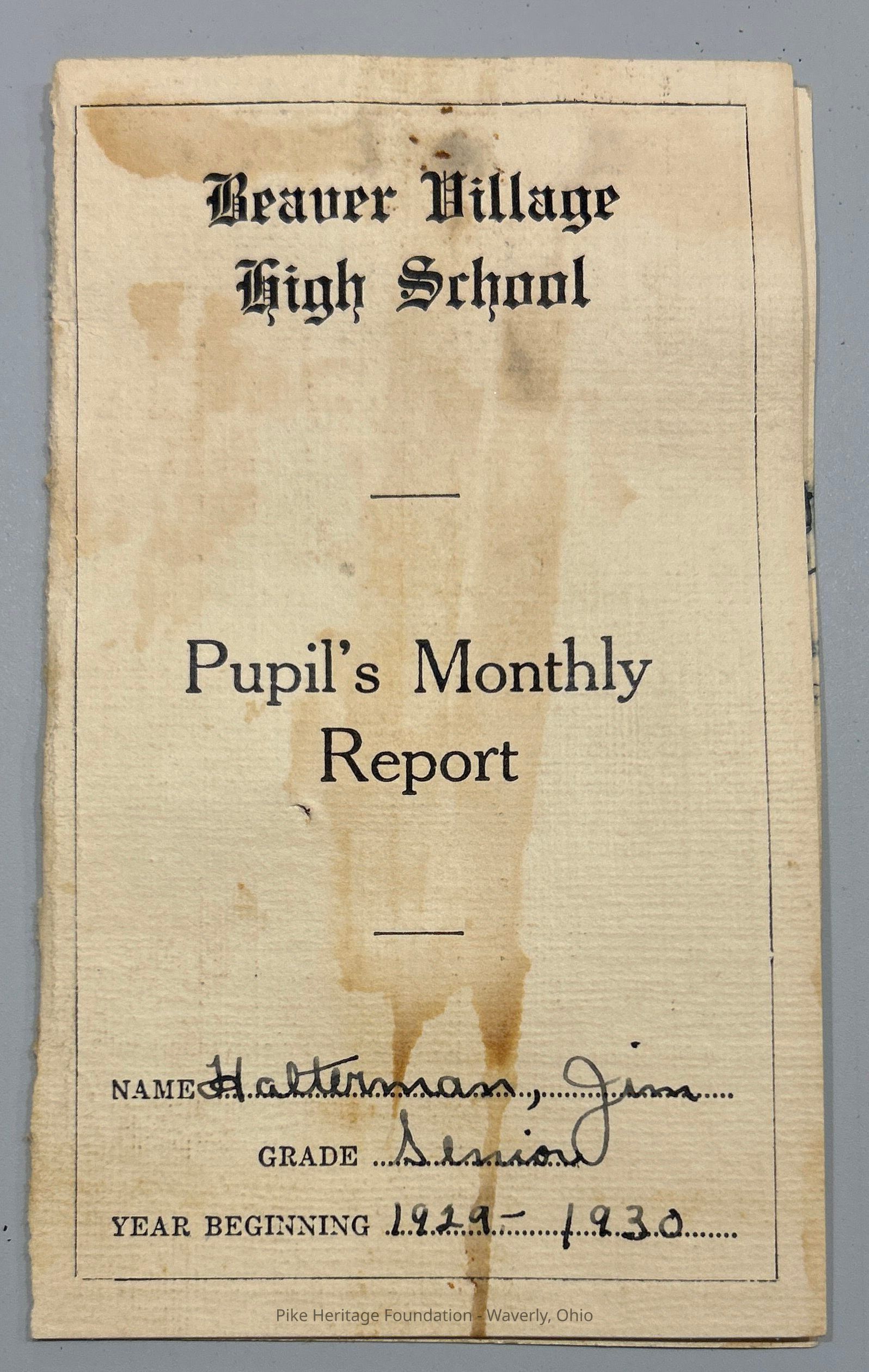 Beaver Village High School Report Card - 1930Entry/Object ID