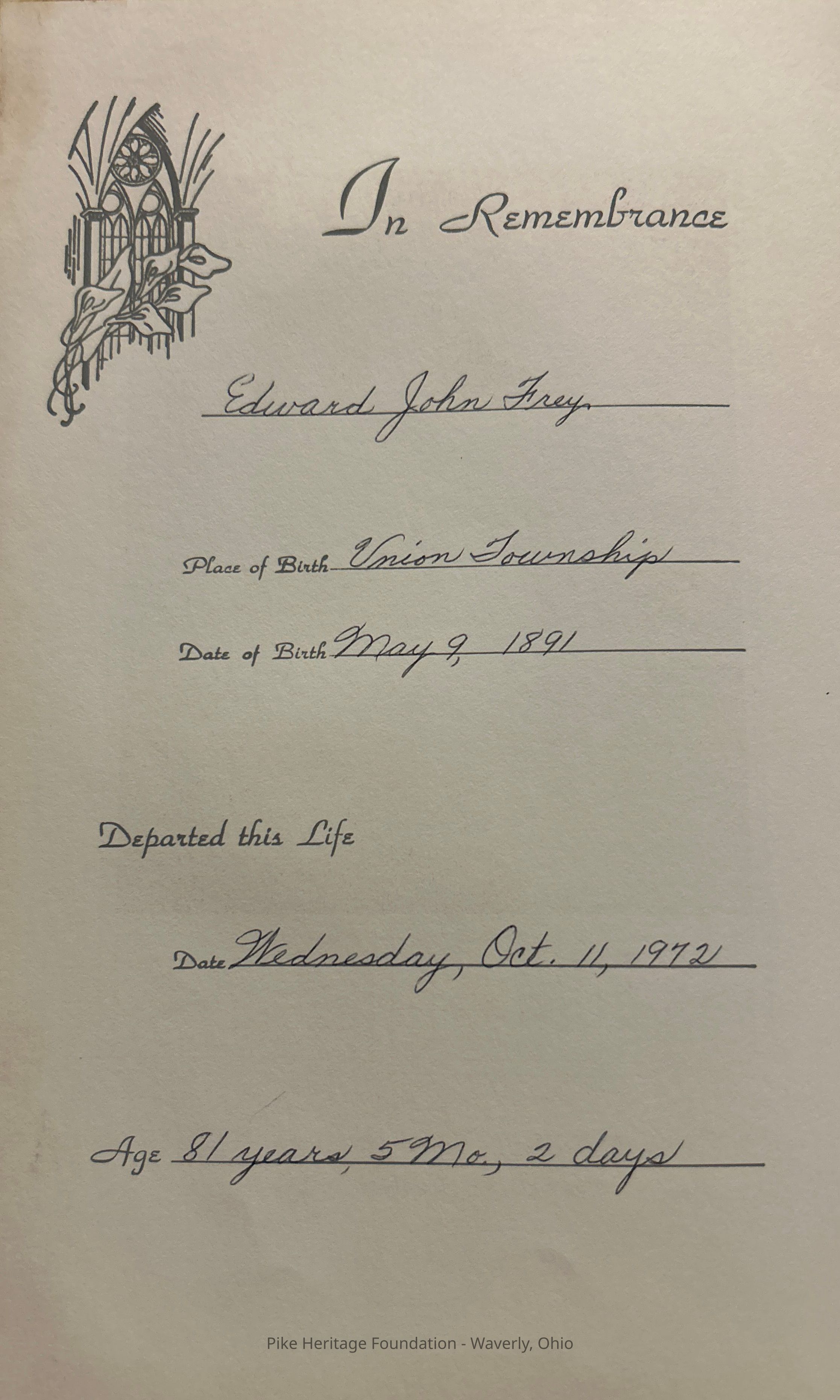 Memorial book for Edward John Fry, who was born in Union Township, Pike County on May 9, 1891 and died October 11, 1972 at the age of 81.Collection