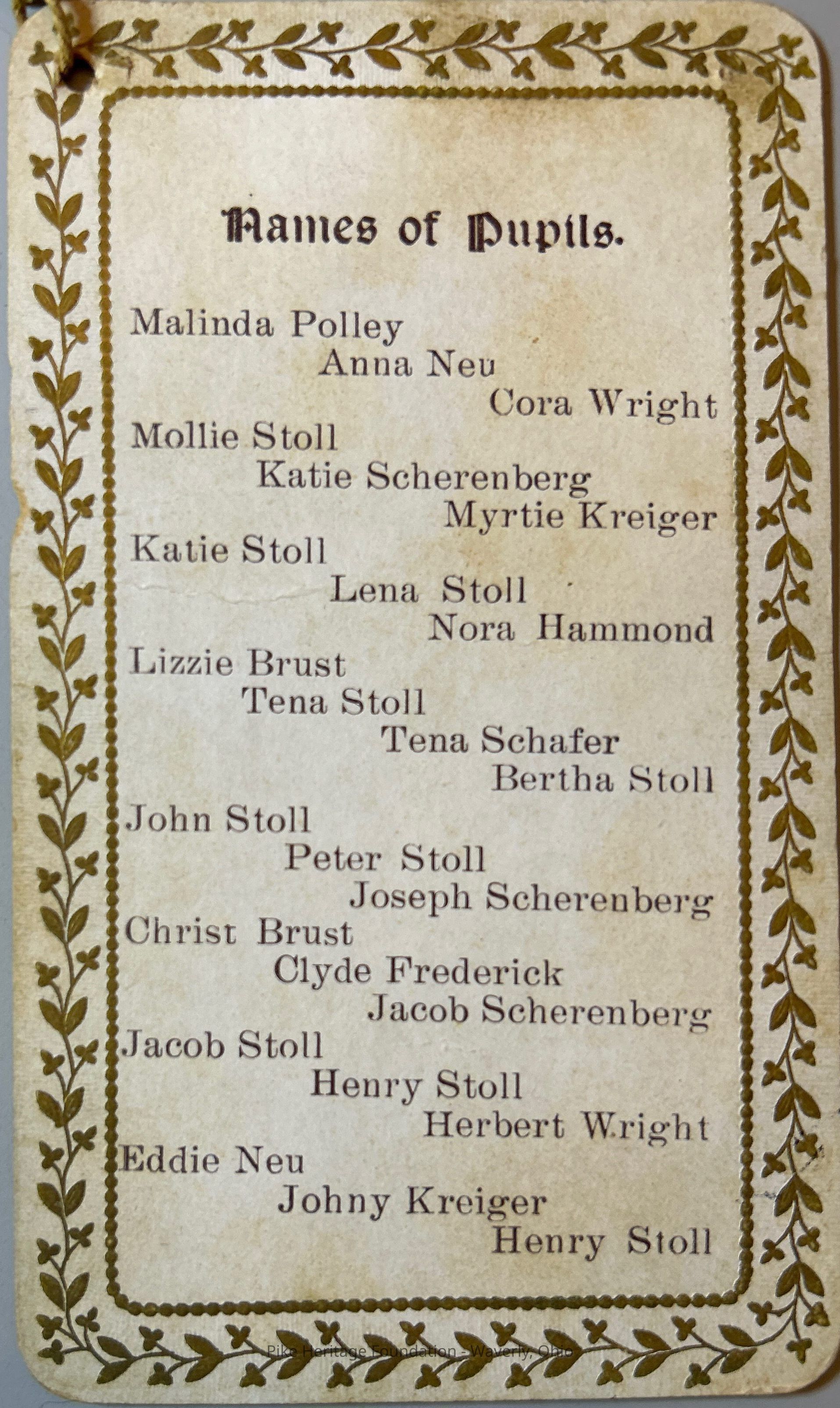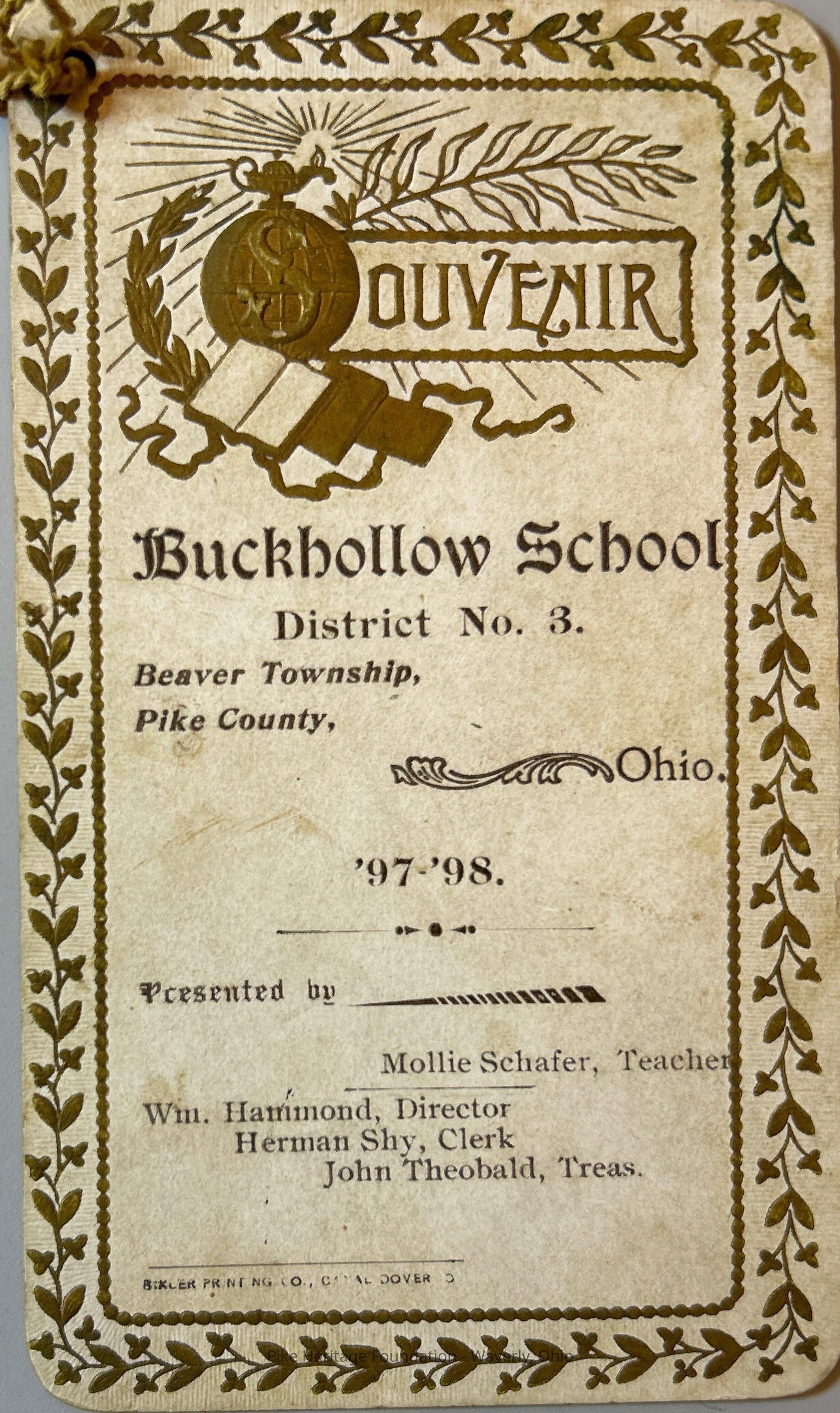 Commemorative card printed in 1898 for the Buck Hollow school Beaver Township School District No. 3 identifying all of the pupils as well as the teacher, the school board director, the school board clerk and the school board treasure.Collection