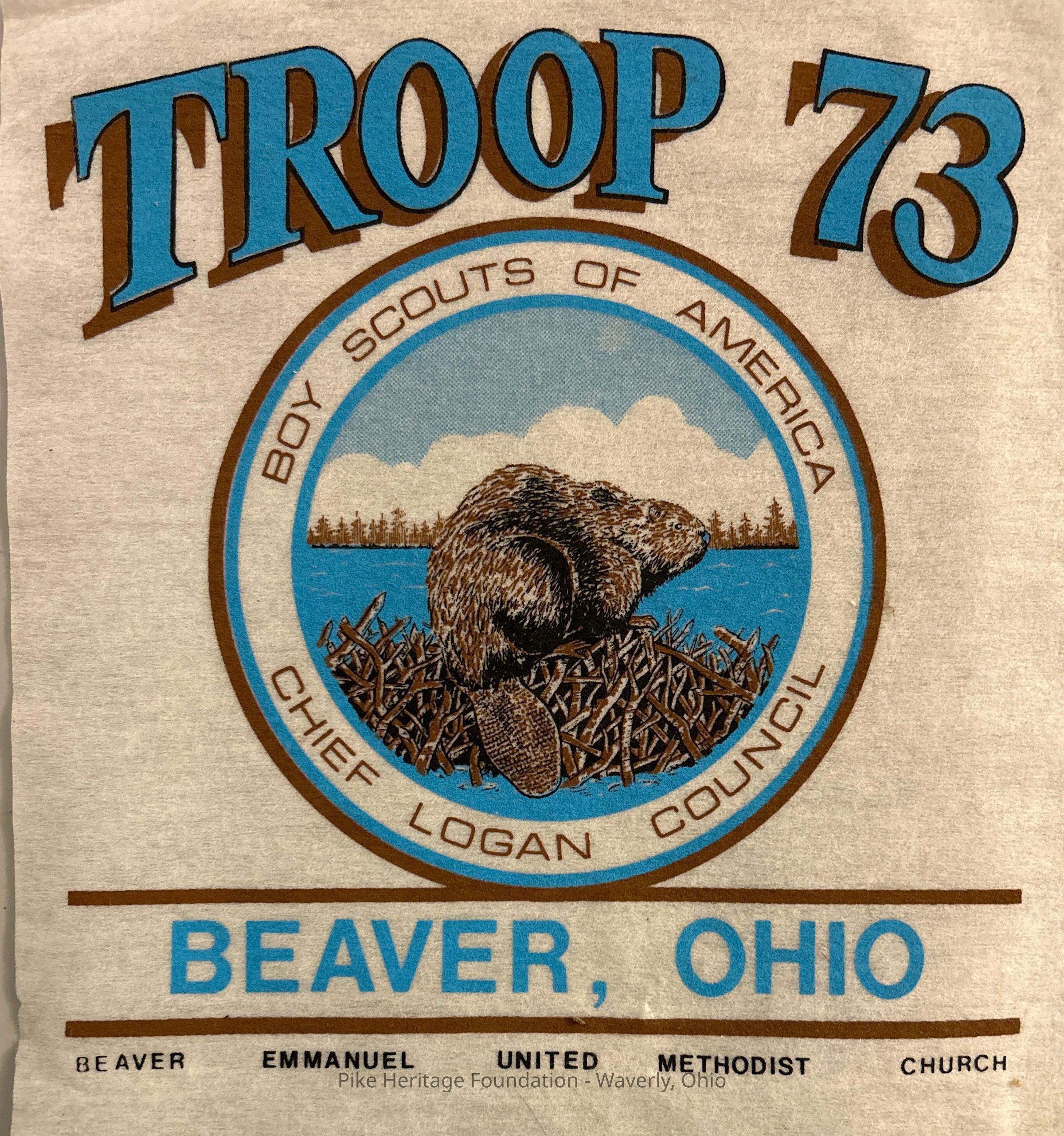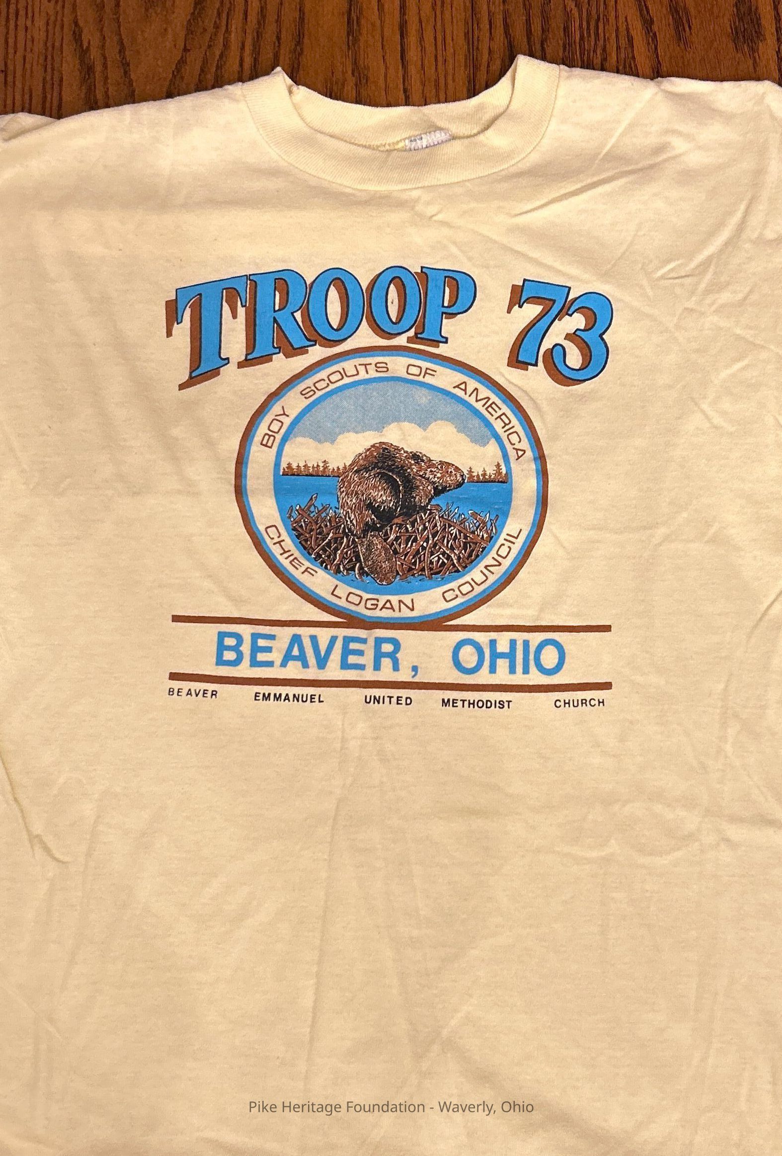 T-shirt worn by members of Boy Scout Troop 73 located in Beaver, Ohio. Includes impression of design printed on fabric for initial imprint.Collection