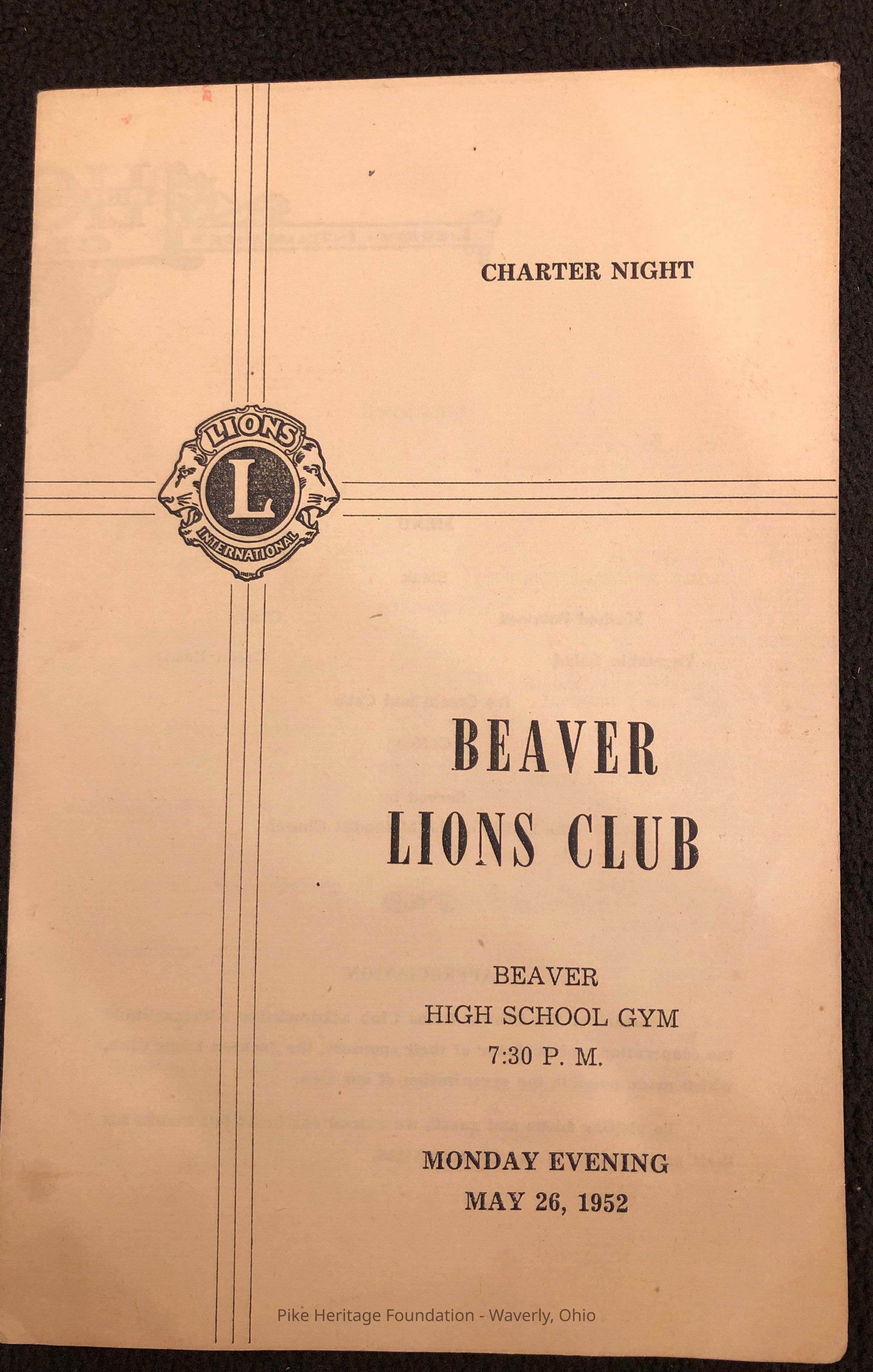 Paper program commemorating the night the BeaverLions Club was chartered on May 26, 1952.Collection