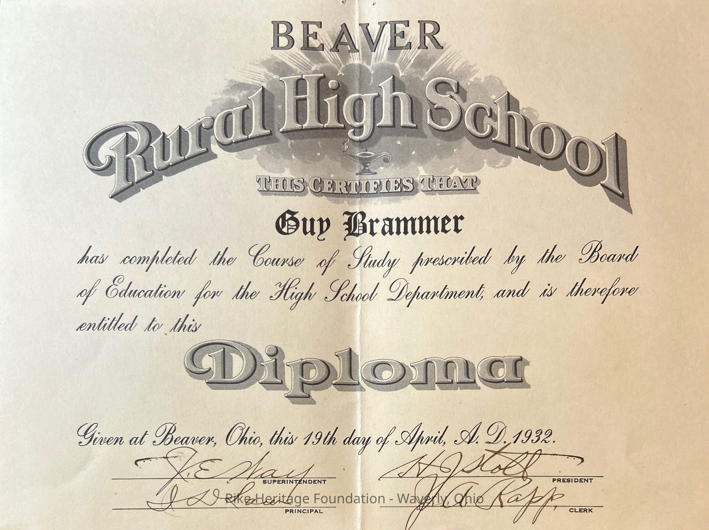 1932 Beaver High School diploma and folder awarded to Guy Bramner.Collection