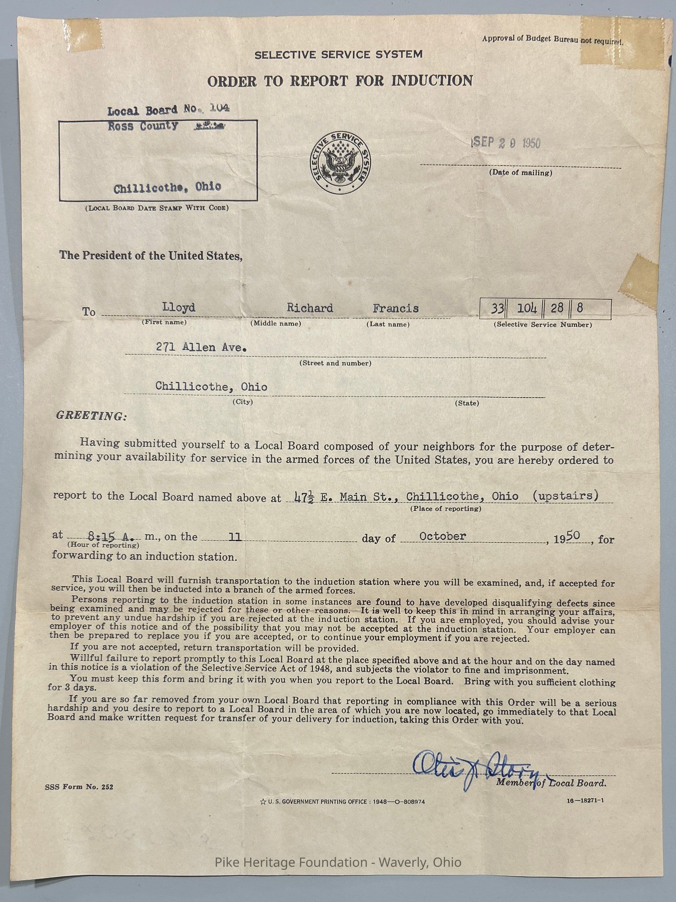 Selective Service System order to report for induction for Lloyd Richard Francis dated October 1950.Collection