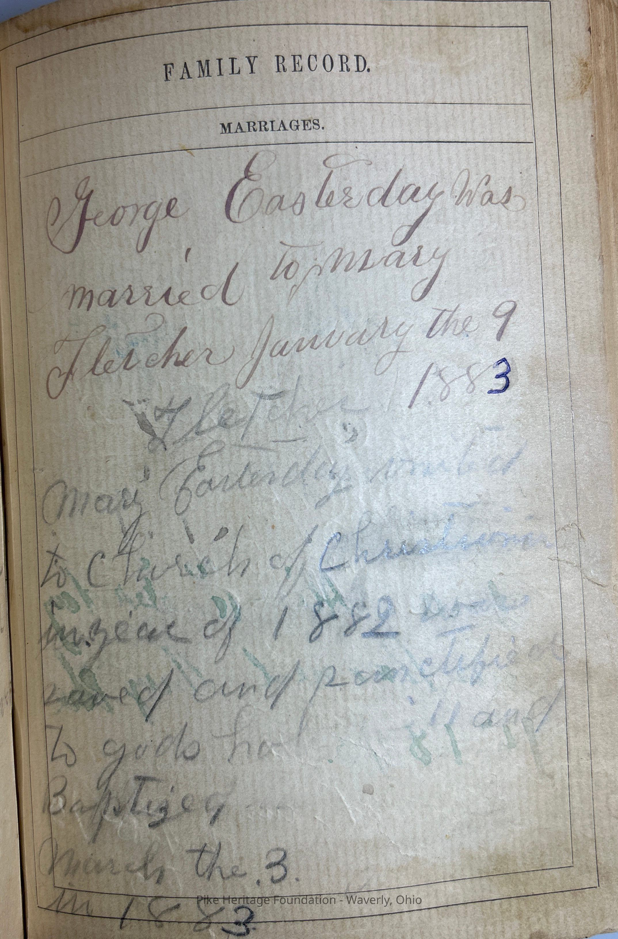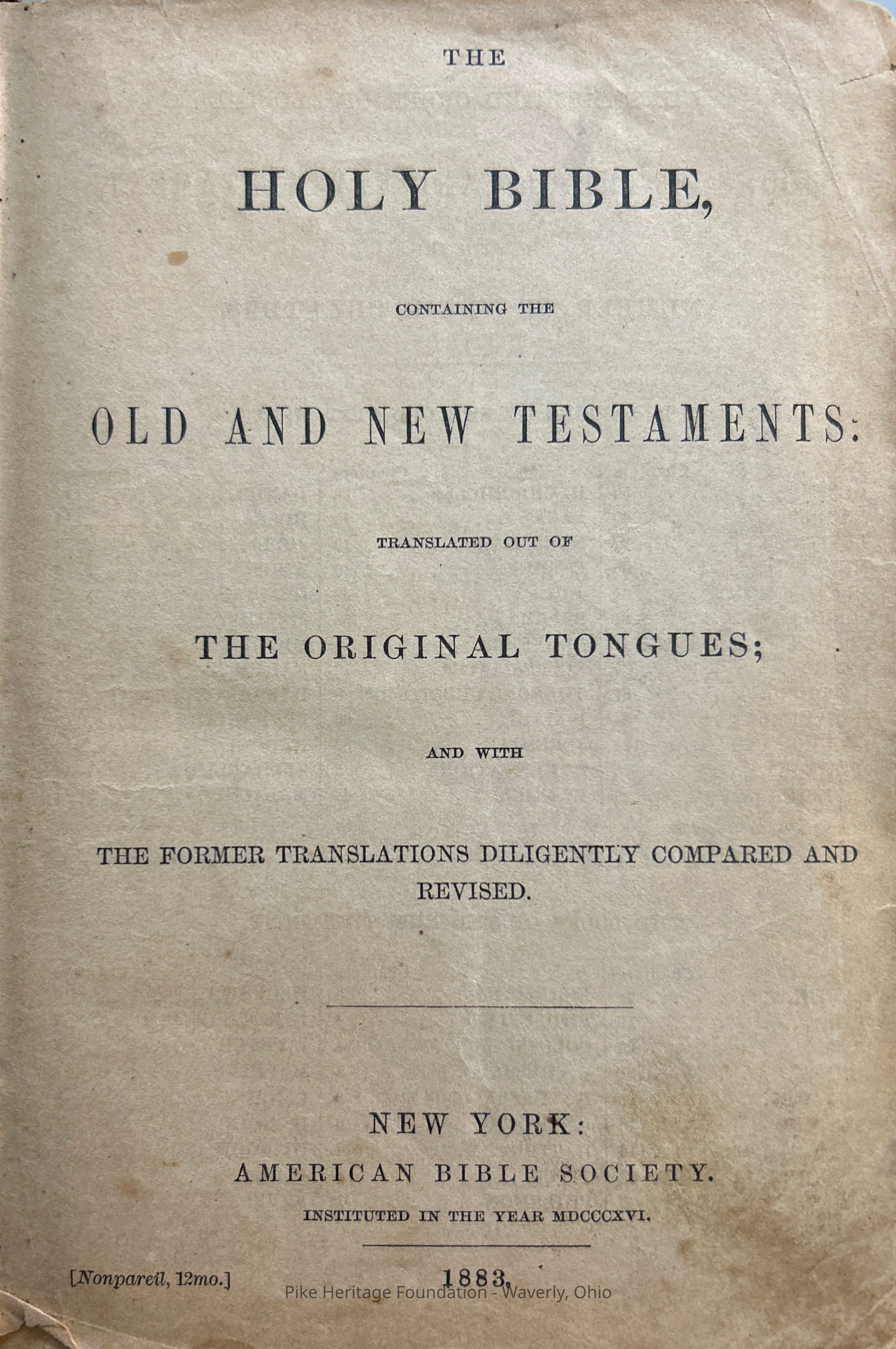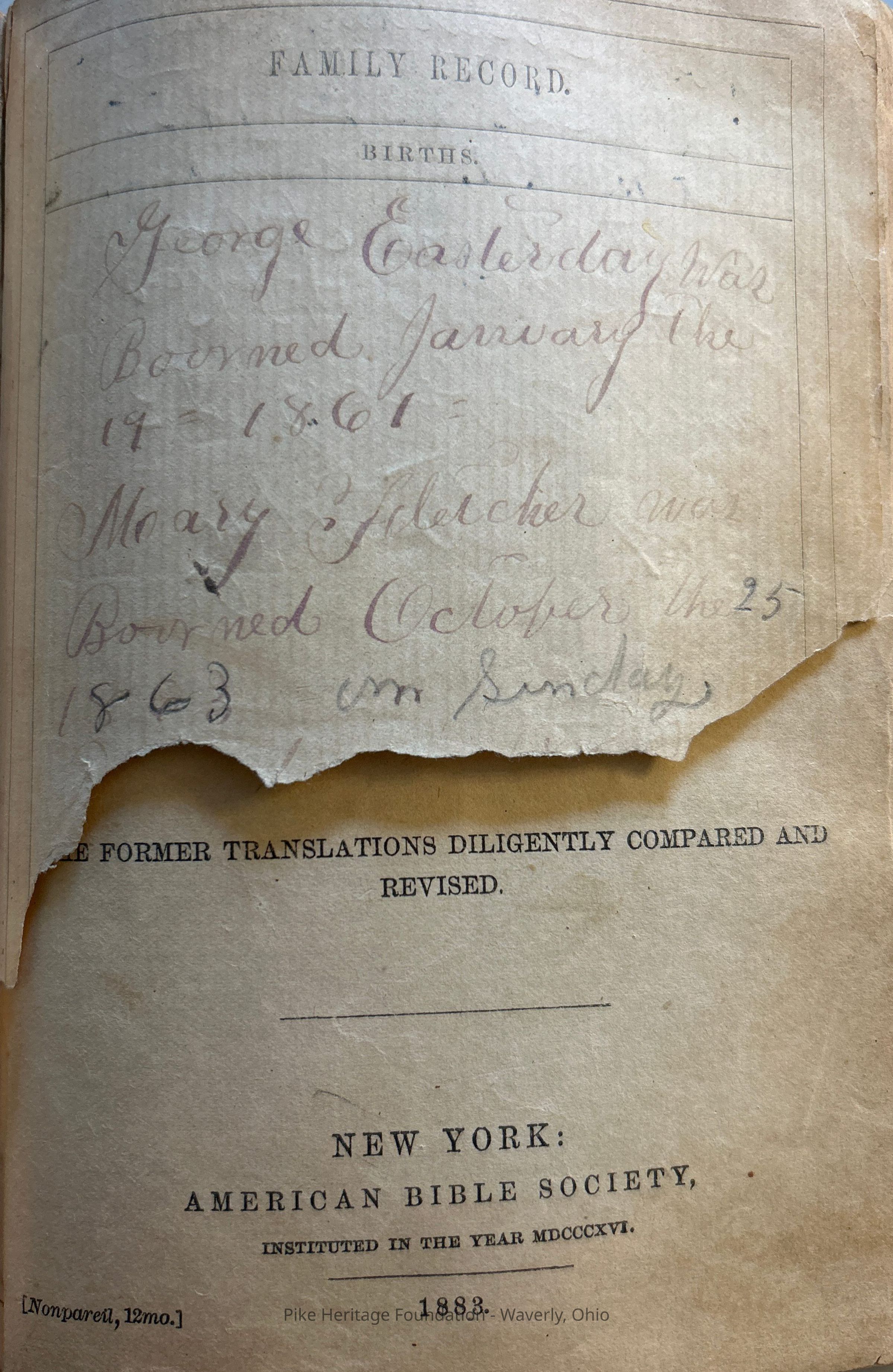1883 Holy Bible from the Summit Hill community near Waverly, Ohio. Believed to have been presented to George Easterday by his parents Albert and Barbara Easterday on Christmas Day 1883. George (1861-1919) married Mary Harriet Fletcher (1863-1955) in Pike County in 1883. Young George grew up in Huntington Township in Ross County where Summit Hill was located. In adulthood he moved to Waverly where he is buried at Evergreen Union Cemetery.Collection