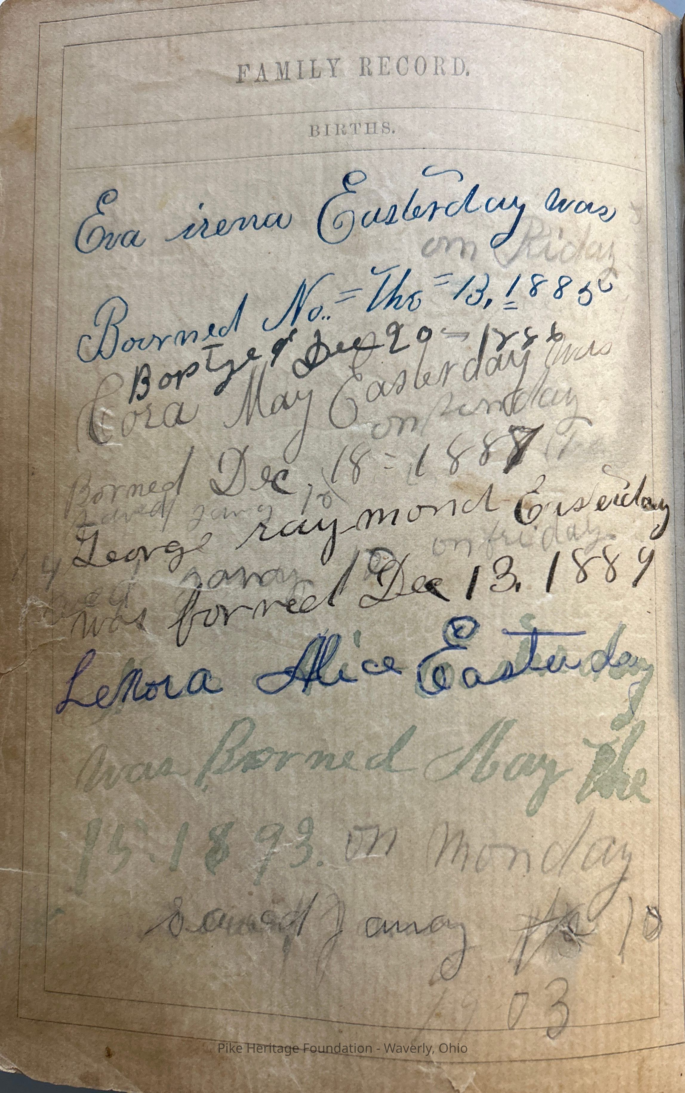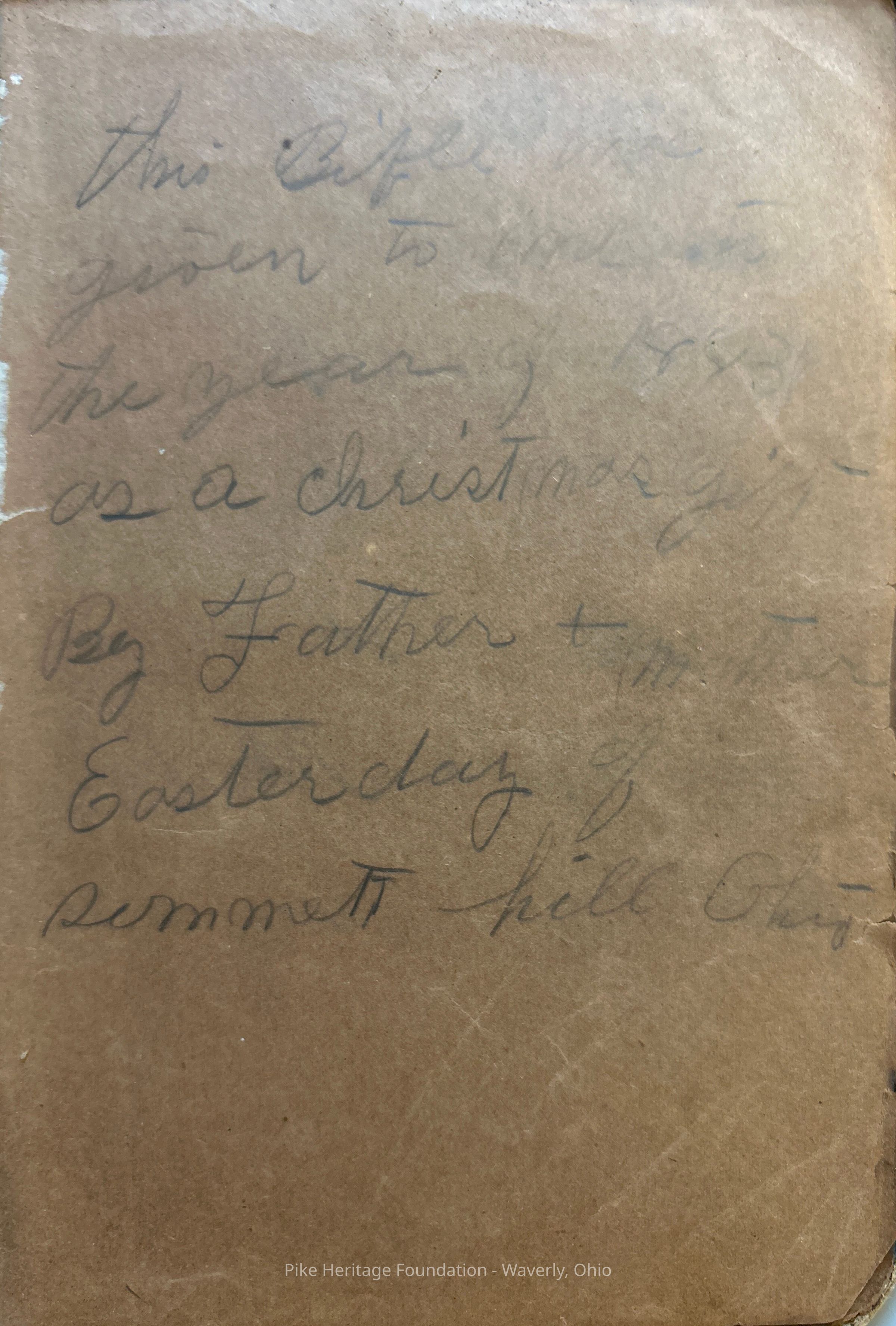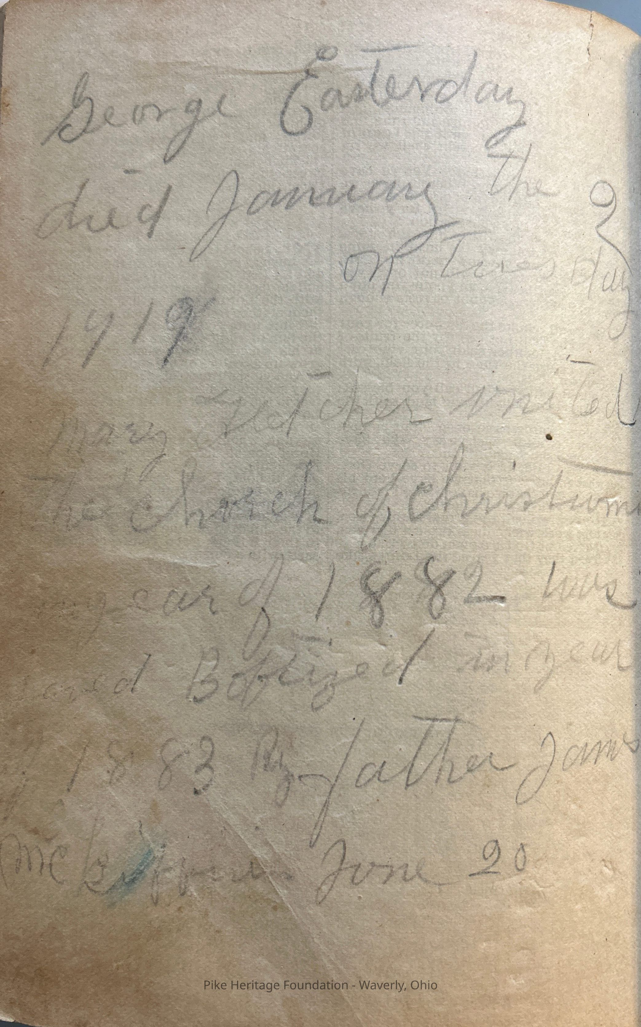 1883 Holy Bible from the Summit Hill community near Waverly, Ohio. Believed to have been presented to George Easterday by his parents Albert and Barbara Easterday on Christmas Day 1883. George (1861-1919) married Mary Harriet Fletcher (1863-1955) in Pike County in 1883. Young George grew up in Huntington Township in Ross County where Summit Hill was located. In adulthood he moved to Waverly where he is buried at Evergreen Union Cemetery.Collection