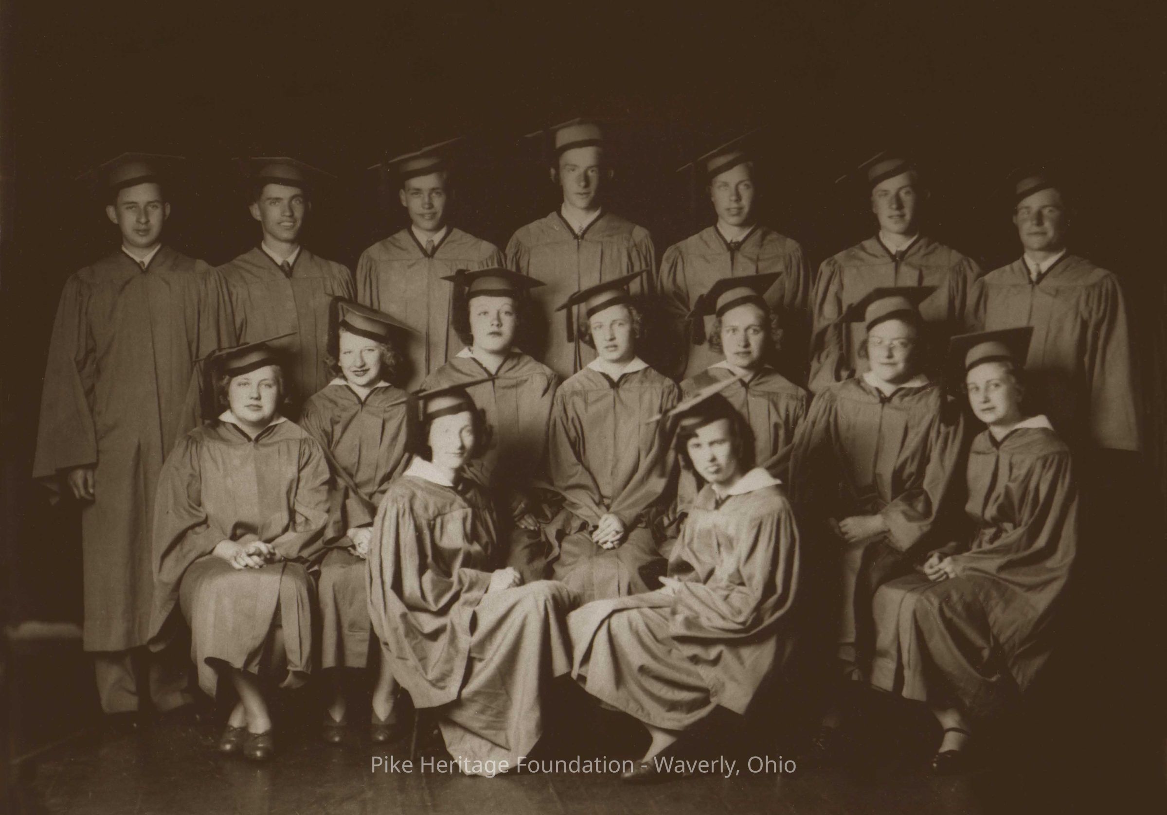 1940 Stockdale High School Graduating Class. Front Row (L to R): Vivian Creech and Josephine Thompson. Second Row (L to R): Anna Mary Wheeler, Cora Crabtree, Leitha Debo, Evelyn Staker, Gladys Creech, Viola Hohenstein, and Minnie Snyder. Standing (L to R): Hobert Baker, Paul Pollard, Vernon Colling, Ford Leake, Ova Lykins, Robert DeAtley, and Jennings Gordon.Photograph Details