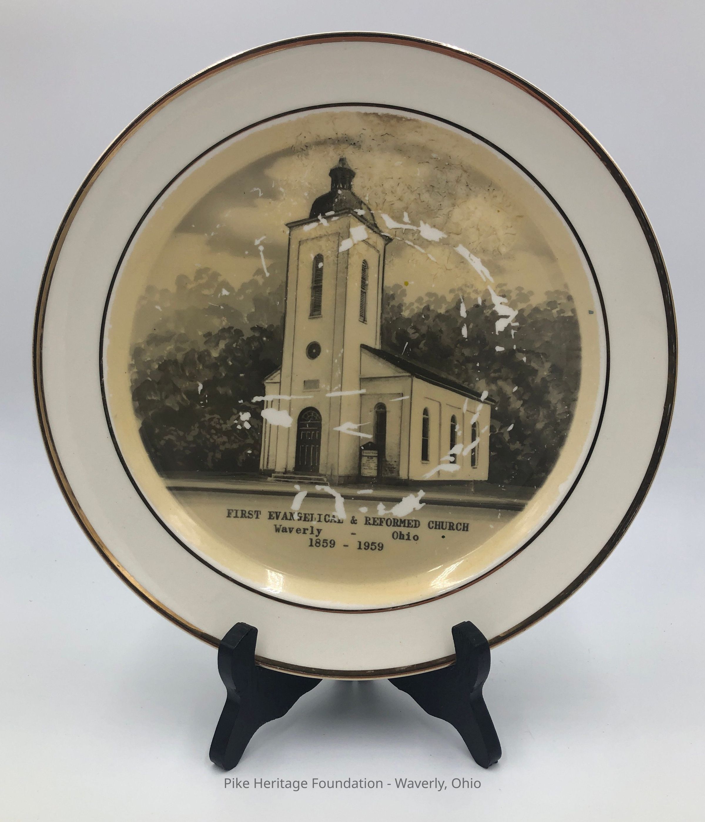 100th anniversary commemorative plate for the First Evangelical & Reformed Church located at 110 South Market Street in Waverly, Ohio. It now houses the Pike Heritage Museum.Acquisition