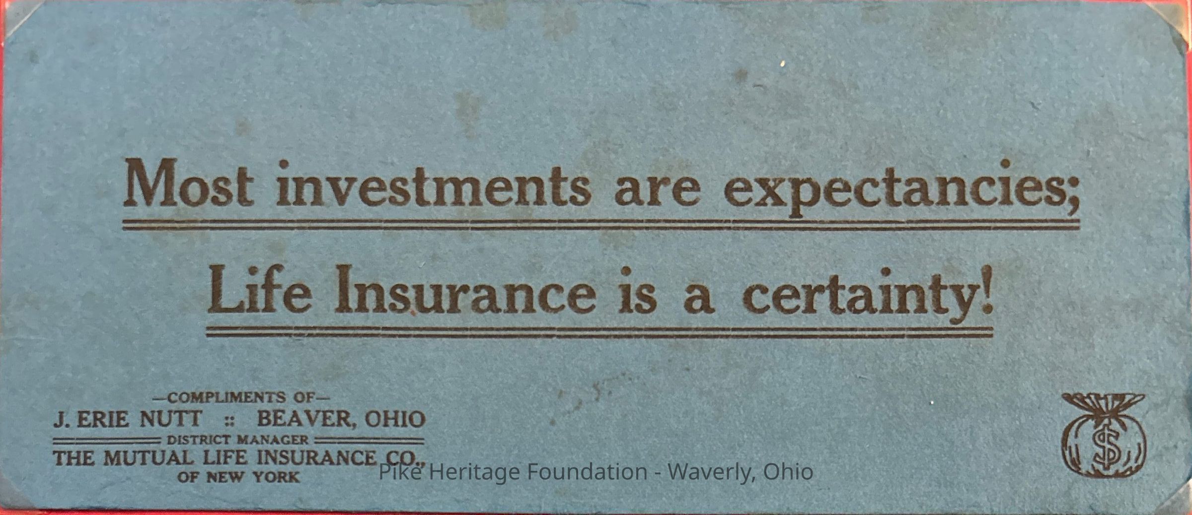 This ink blotter was used by Beaver insurance salesman, J. Erie Nutt. In addition to operating an insurance business in Beaver, he also served as the village postmaster. Mr. Nutt eventually moved his business to Chillicothe, Ohio.Collection