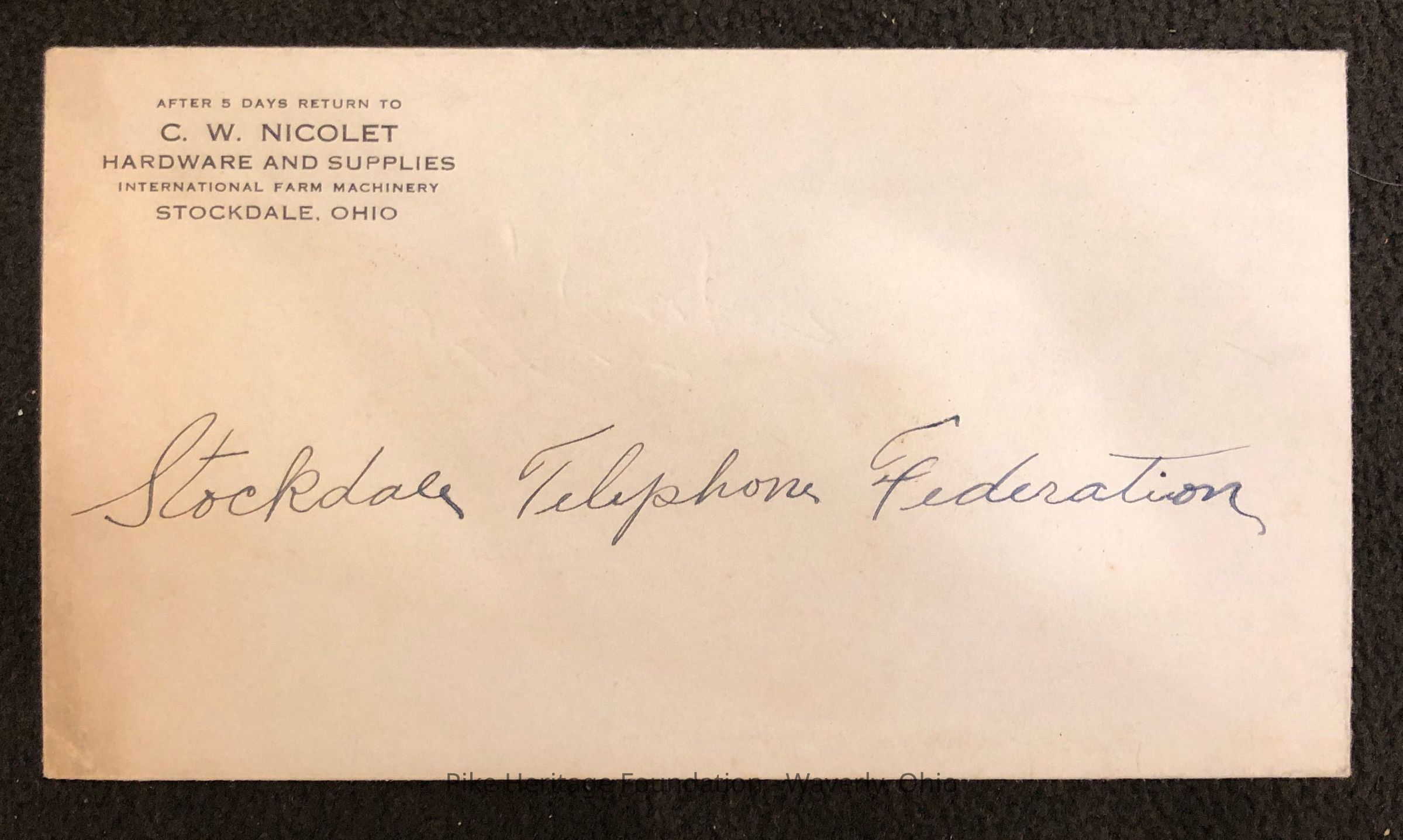 Envelope from the Charles W. Nicolet Hardware and Supplies Company at Stockdale, Ohio. Labeled to the Stockdale Telephone Federation. Charles W. Nicolet operated a hardware store in Stockdale, Ohio. He I nherited the business from his father F. J. Nicolet, who also operate a business in the village of Beaver, Ohio.Collection