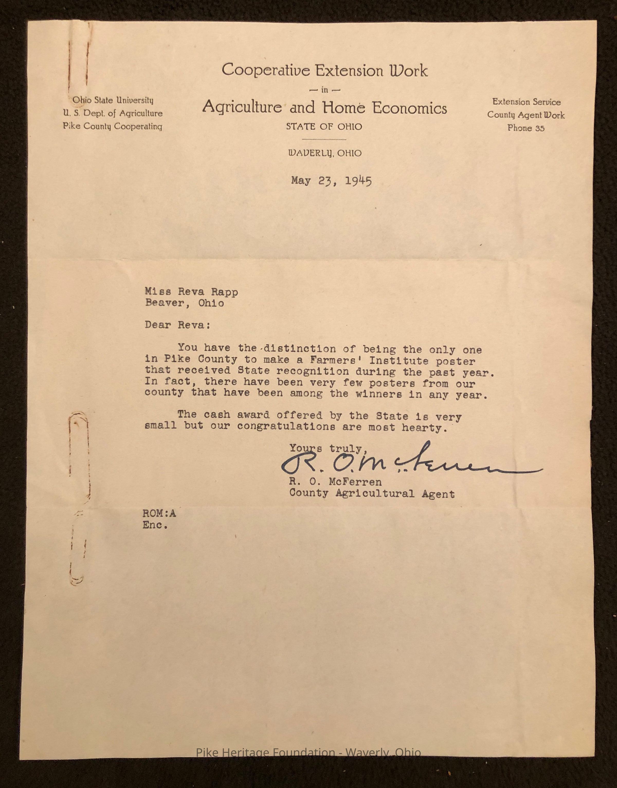 Pike County Agriculture and Economics Department Letter - 1945Entry/Object ID