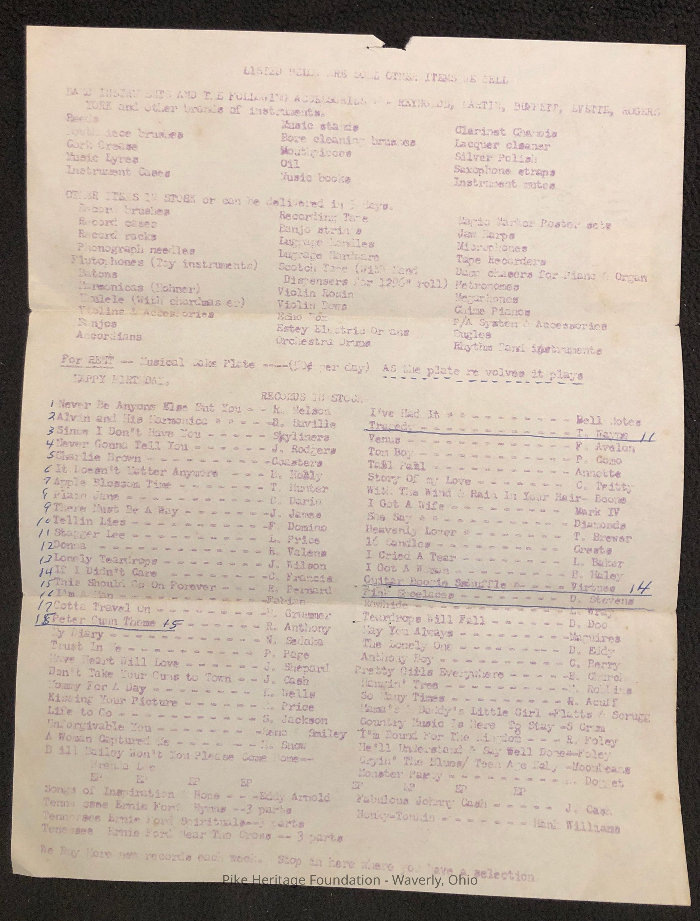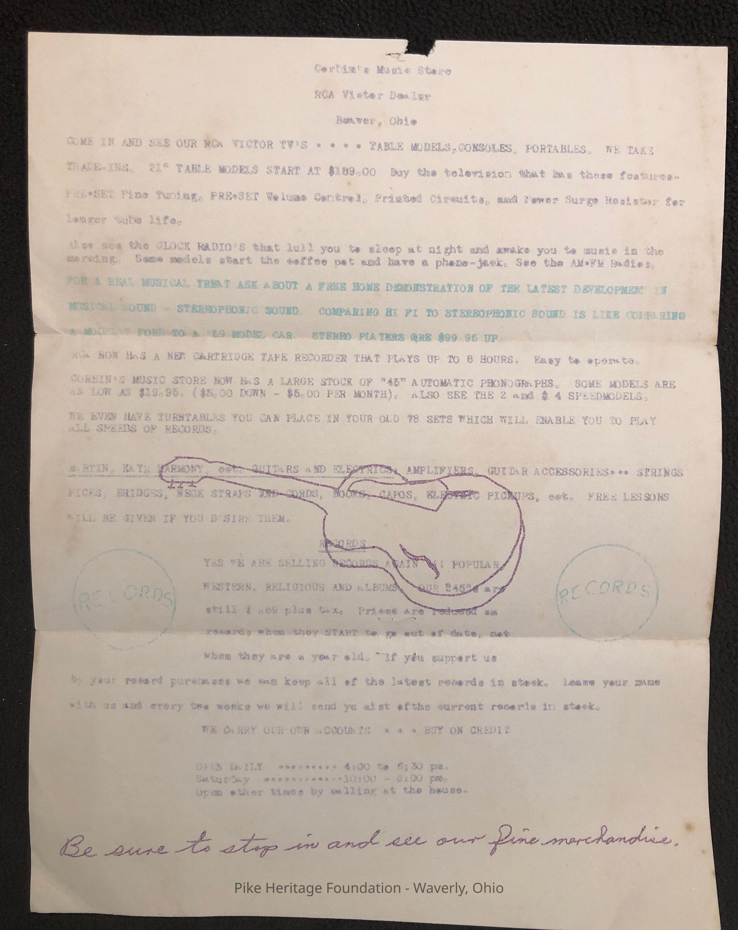 1959 advertisement for the Corbin Music Store located in Beaver, Ohio. Mr. Corbin was the music teacher for Beaver High School. He offered televisions, radios, records, musical instruments, and sheet music.Collection