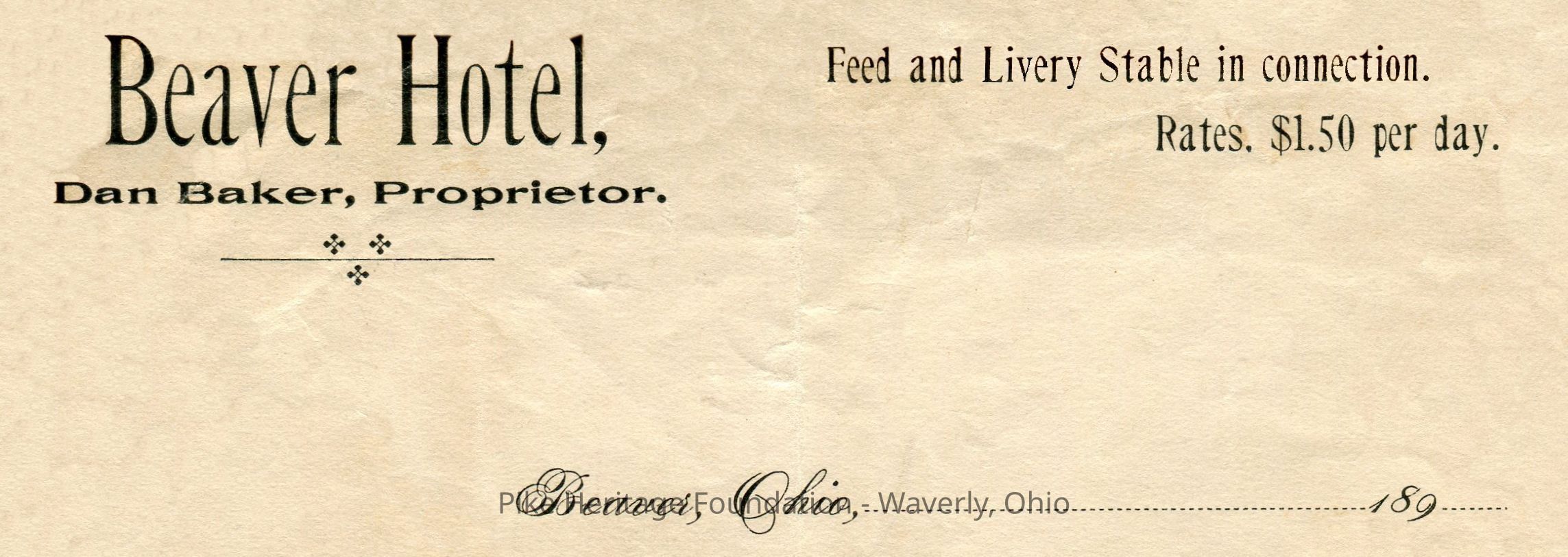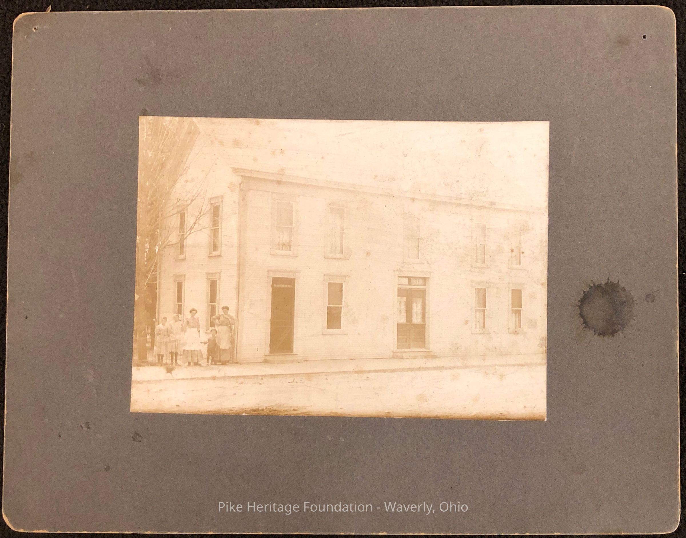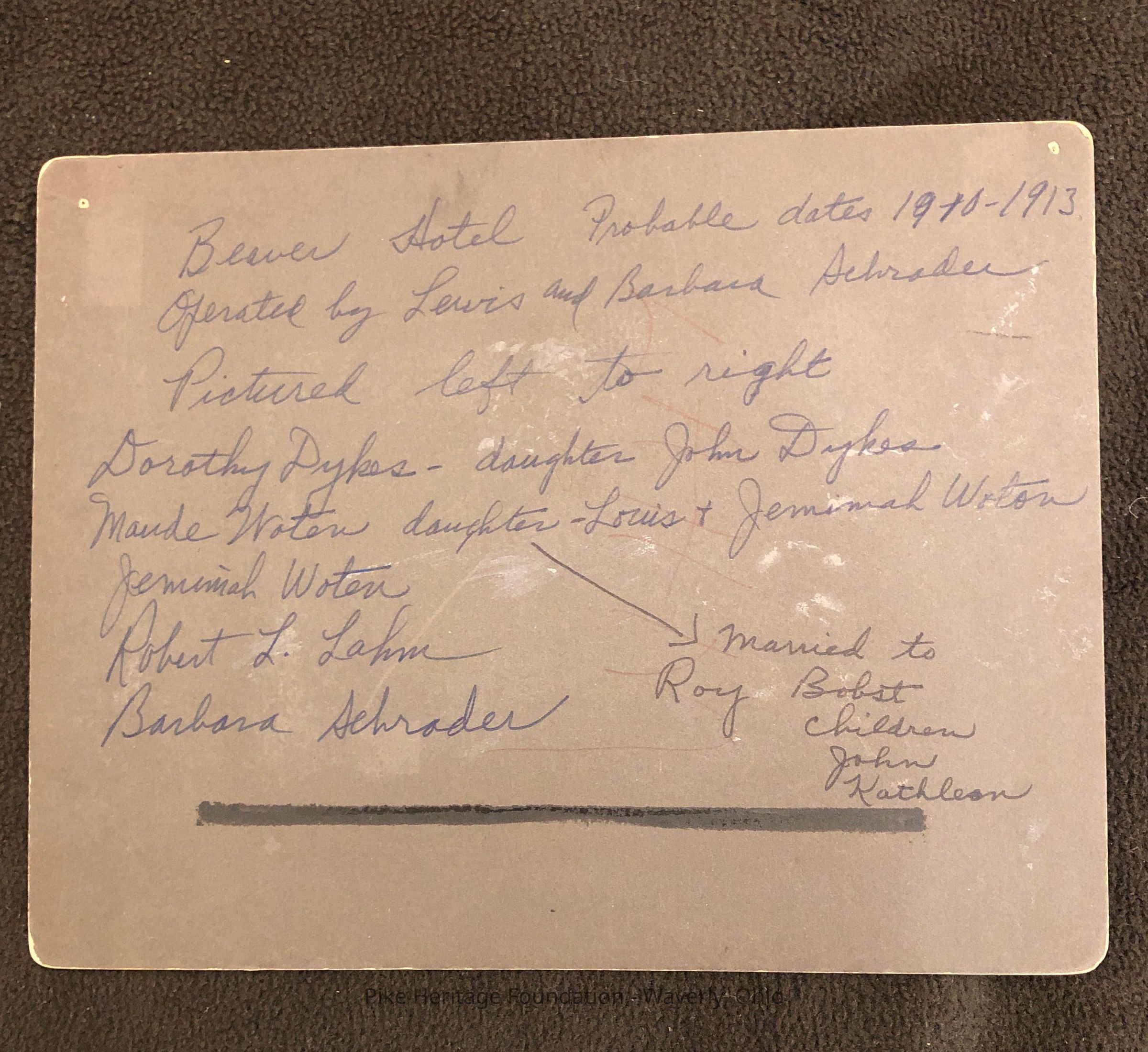Original photograph of The Hotel Beaver dating approximately 1910 to 1913. The hotel was operated by Lewis and Barbara Schrader. Pictured left to right: Dorothy Dykes(daughter of John Dykes), Maude Woten (daughter of Louis and Jemima Woten), Jeremiah Woten, Robert L Lahm, and Barbara Schrader. Handwritten notes by Robert L. Lahm.Photograph Details