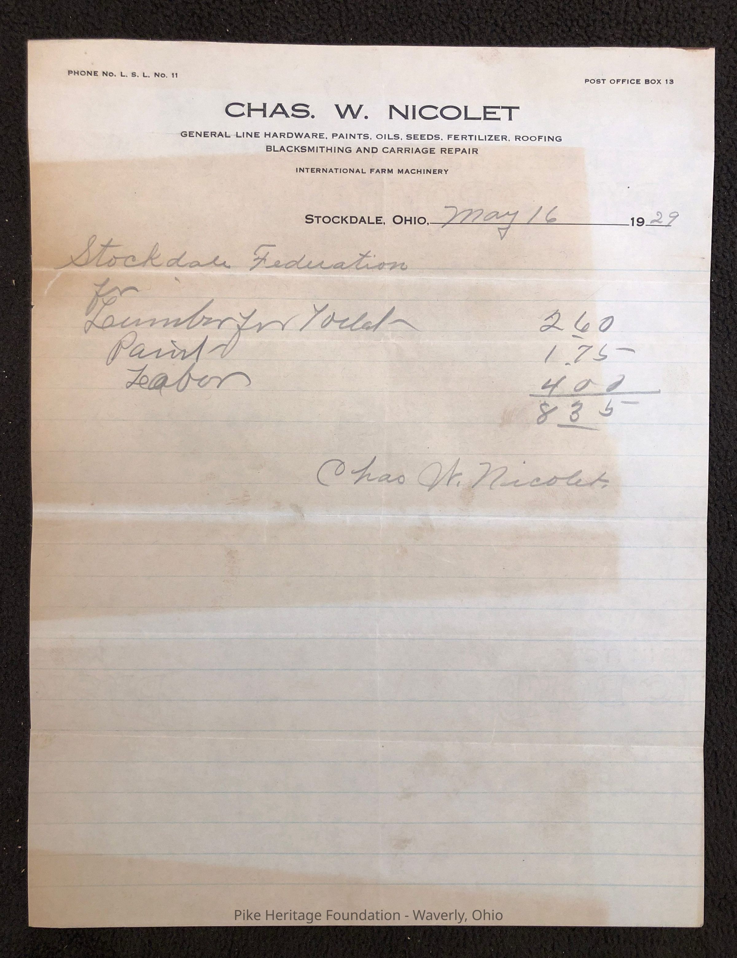 The Nicolet hardware had been in business in Stockdale, Ohio, for nearly 30 years when this receipt was filled out for the local telephone company. Charles inherited the business from his father, Frank J., who also had a business In Beaver, Ohio, in the late 1890’s.Collection