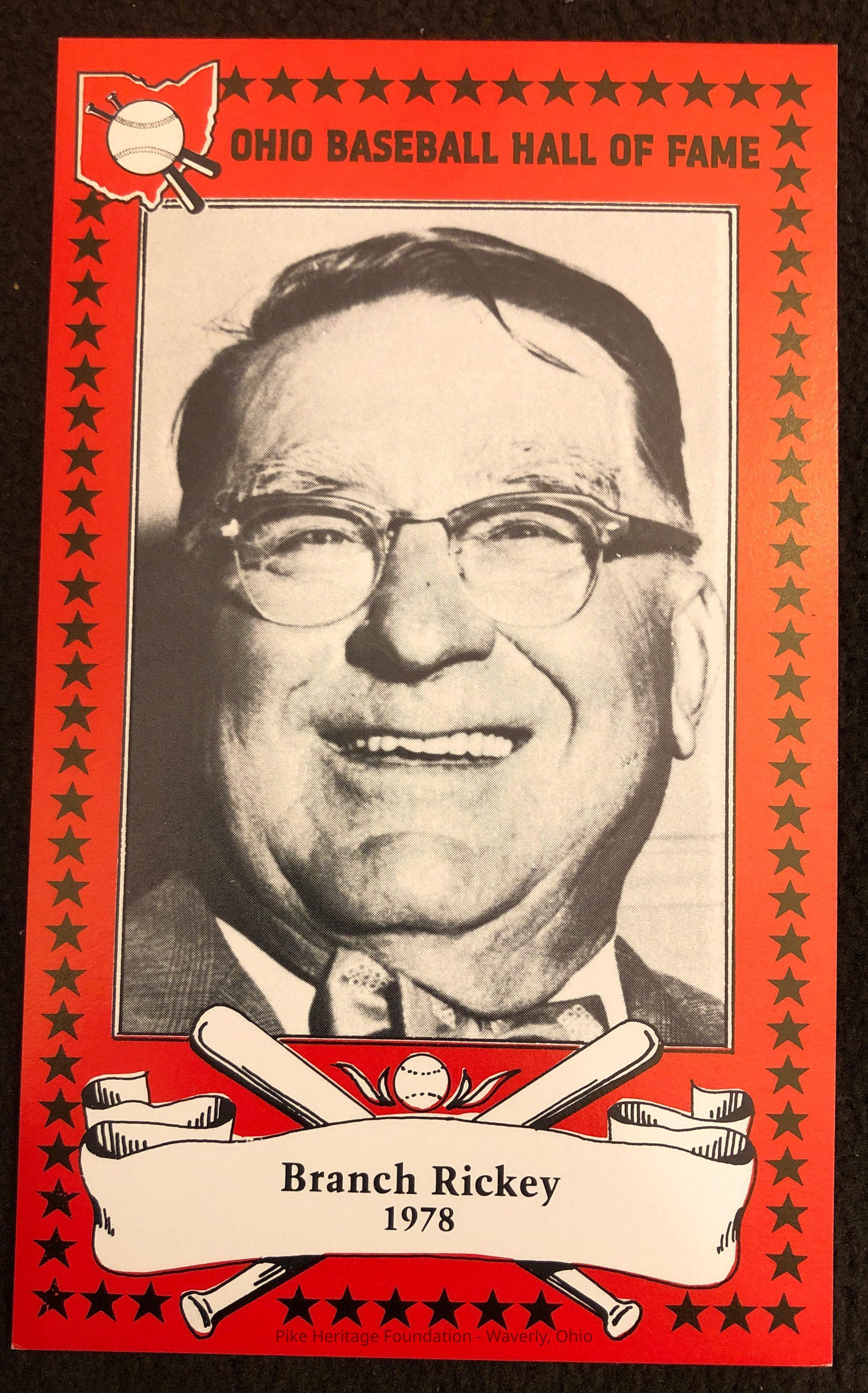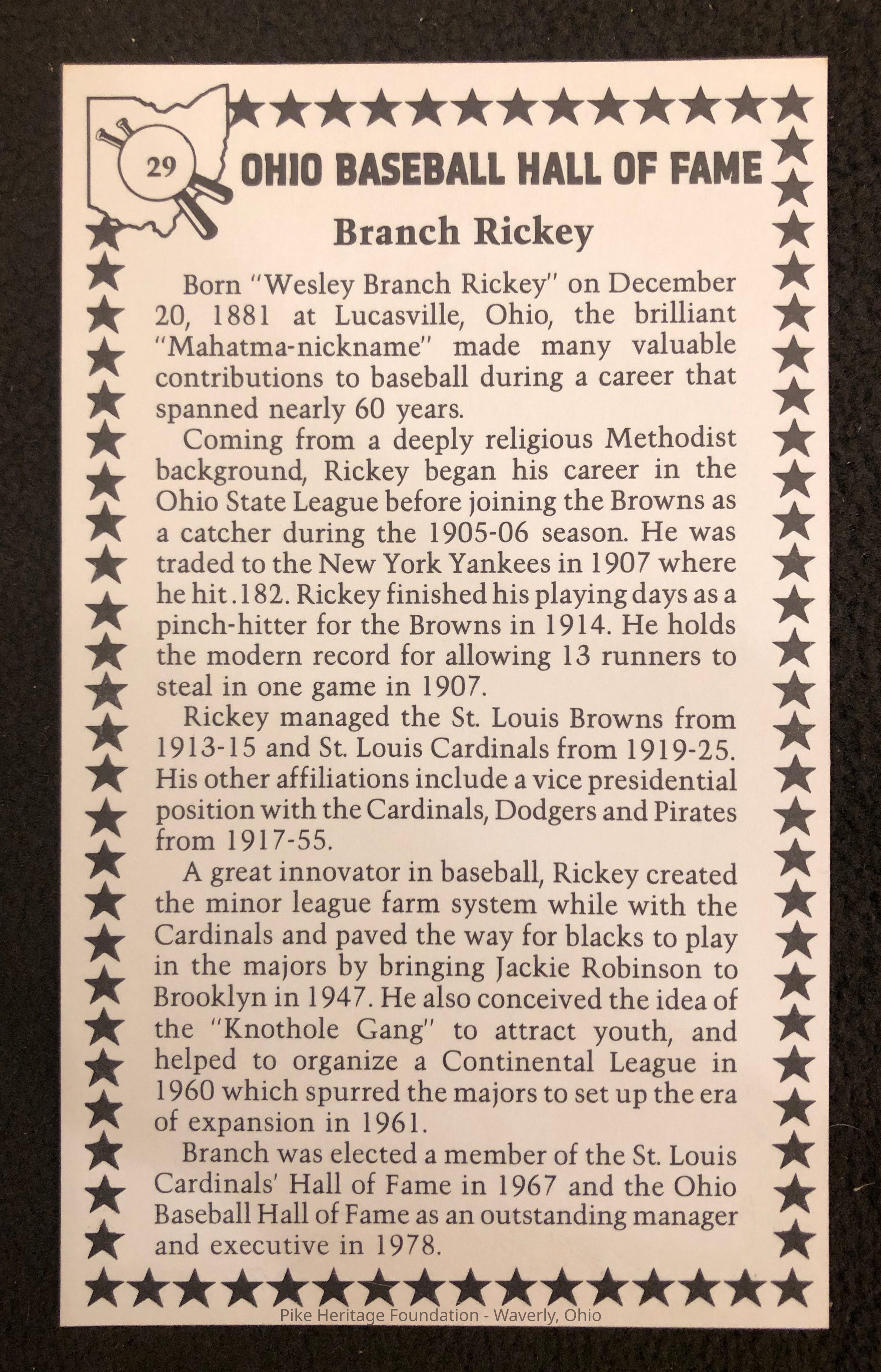 Ohio Baseball Hall of Fame Card honoring Branch Rickey. Mr. Rickey was born in Scioto County just south of Stockdale, Ohio.Collection