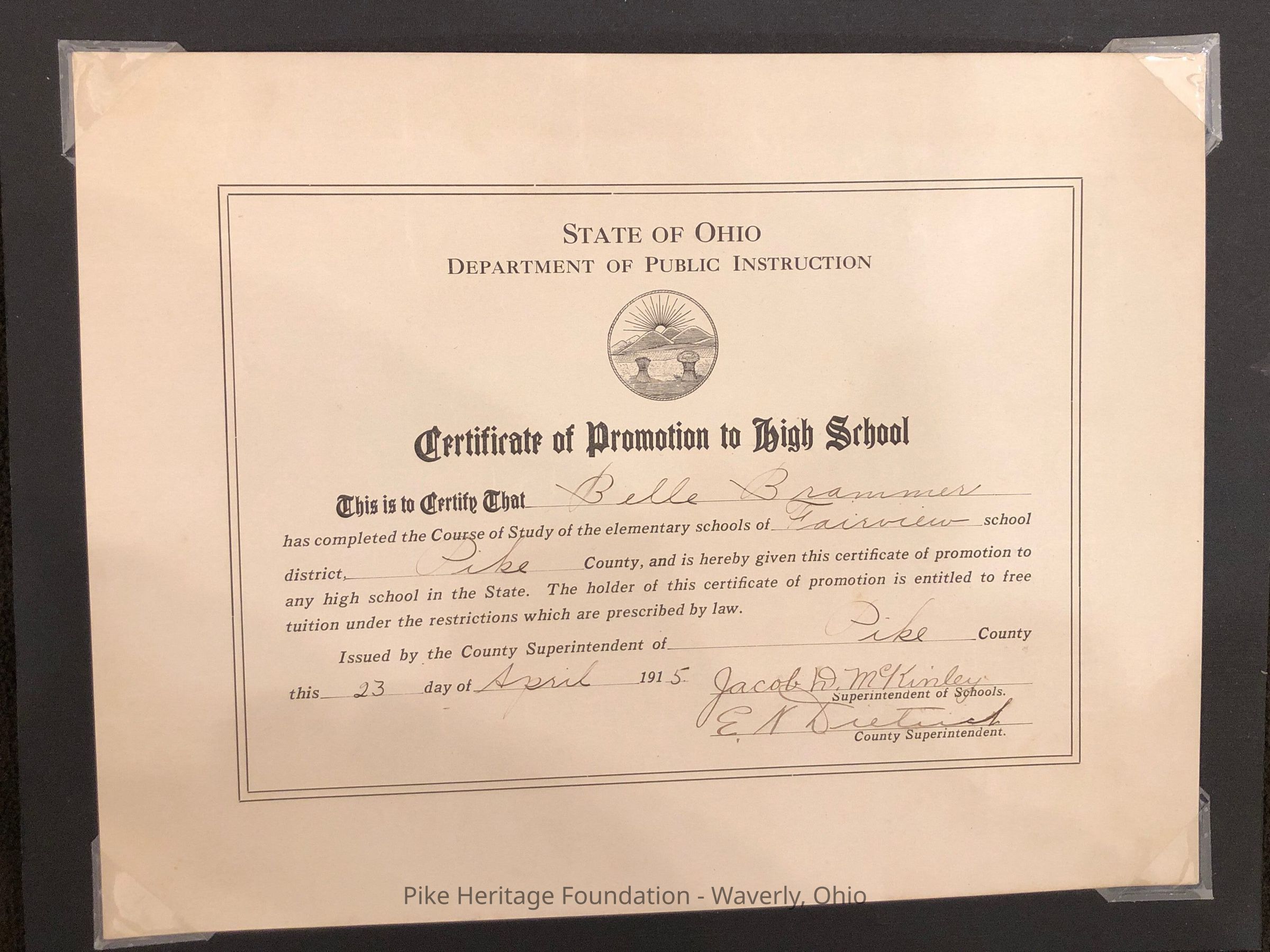 1915 Fairview School Graduation Certificate awarded to Belle Brammer. Fairview was a one-room school located in Beaver Township in Pike County, Ohio.Collection
