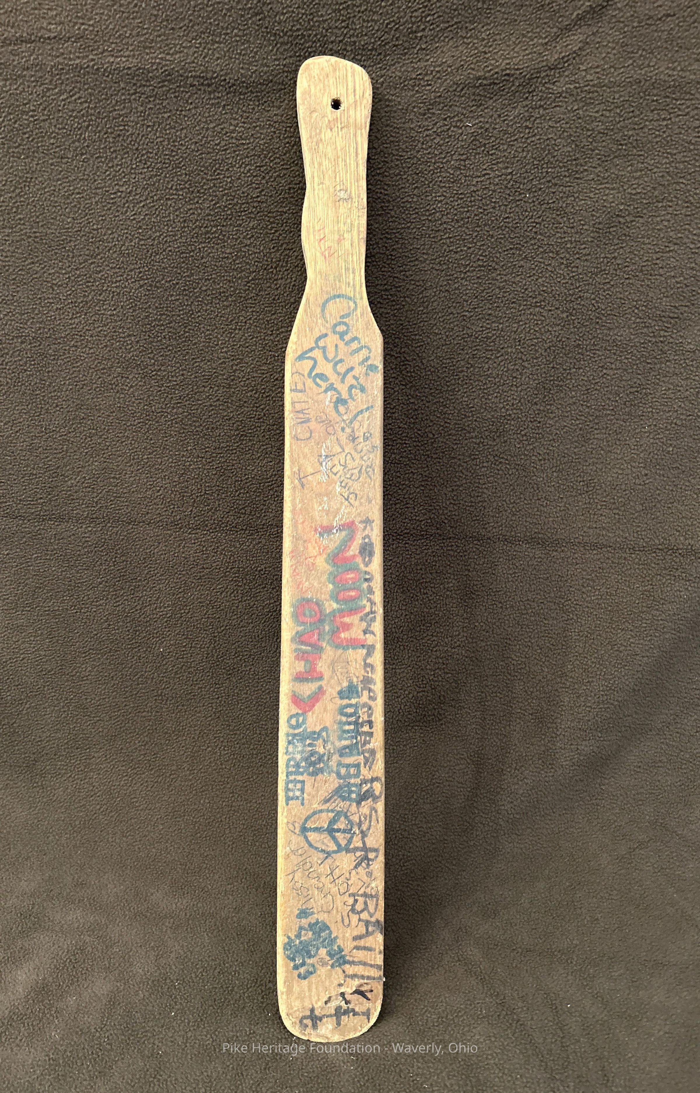 Wooden paddle used at Beaver Elementary in the latter 1900’s. Adorned with student graffiti.Collection