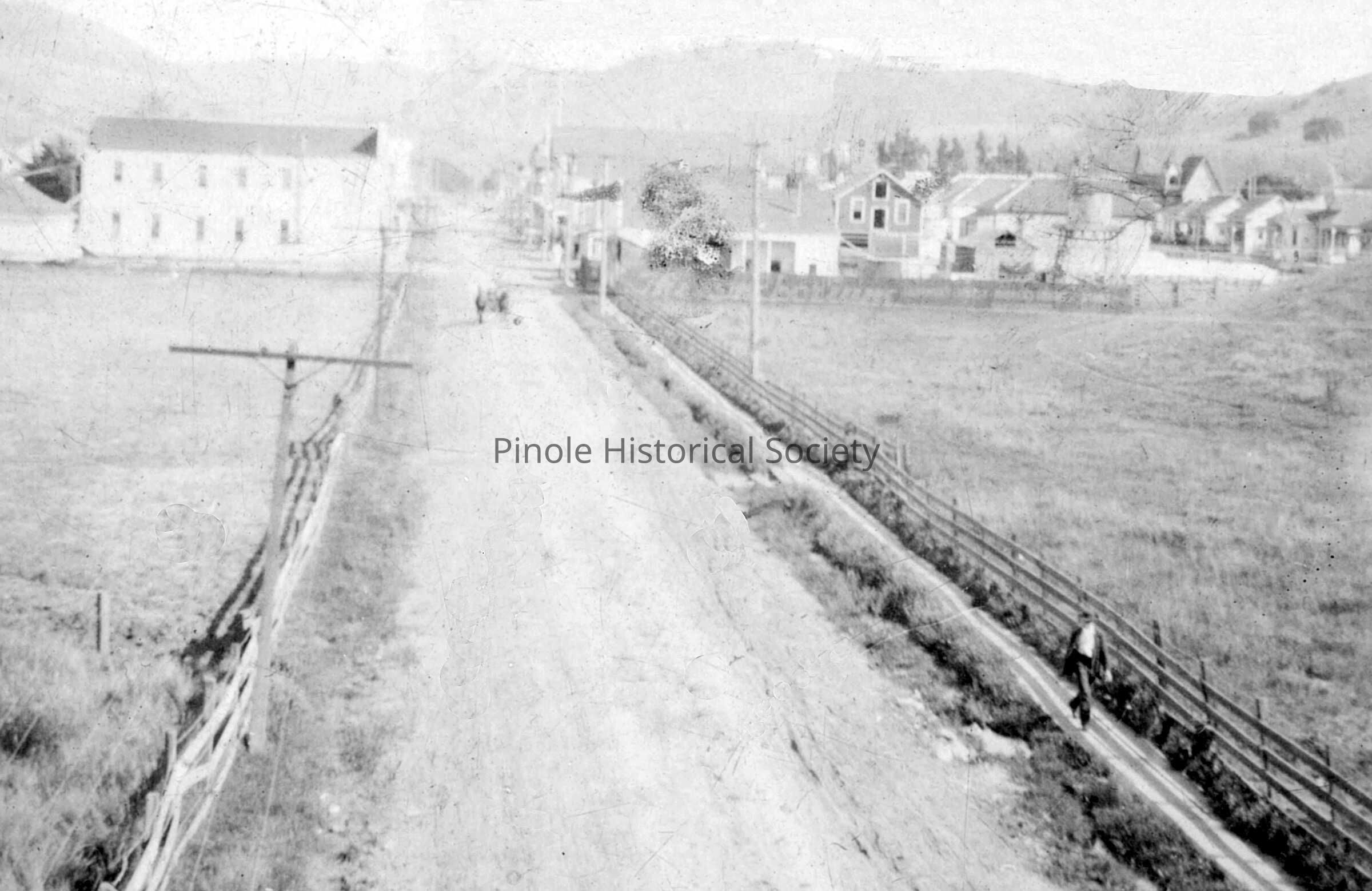 Tennent Avenue looking south, taken from approximately where the Santa Fe train trestle is today, the Commercial Hotel, owned by Manuel Marcos, is visible on the left. Notice a horse and carriage in the middle of the road, and a lone person walking toward the bay.Copyright
