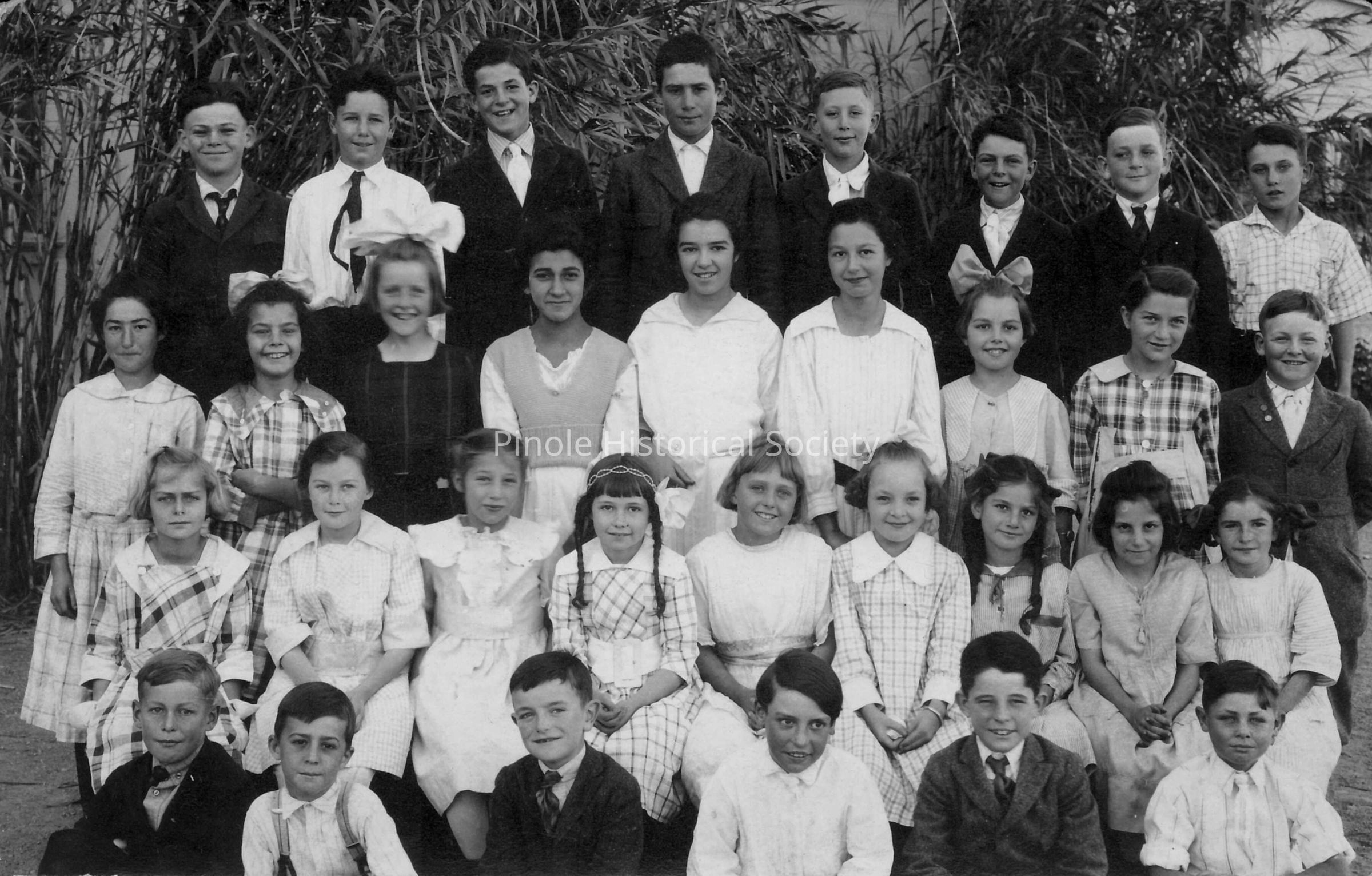 PINOLE-HERCULES SCHOOL #1: Class reunions are still held for graduates of this school, the “School on the Hill” or the “Old School,” which served the Pinole and Hercules communities for 60 years, beginning in 1906. Several of Pinole’s most-beloved teachers taught at this school, including Frances Ellerhorst, Elizabeth Stewart, and Margaret Collins, all of whom have schools named after them in the city. It was razed in 1968 to make way for the Pinole Grove Apartments, a residence for senior citizens, which incorporated some of the architectural elements of the school in its facade. This photo shows a 1922 class photo of elementary school children, including Tessie Curran from Pinole-Hercules School.Copyright