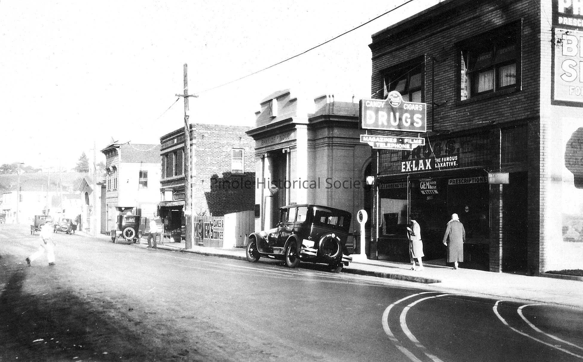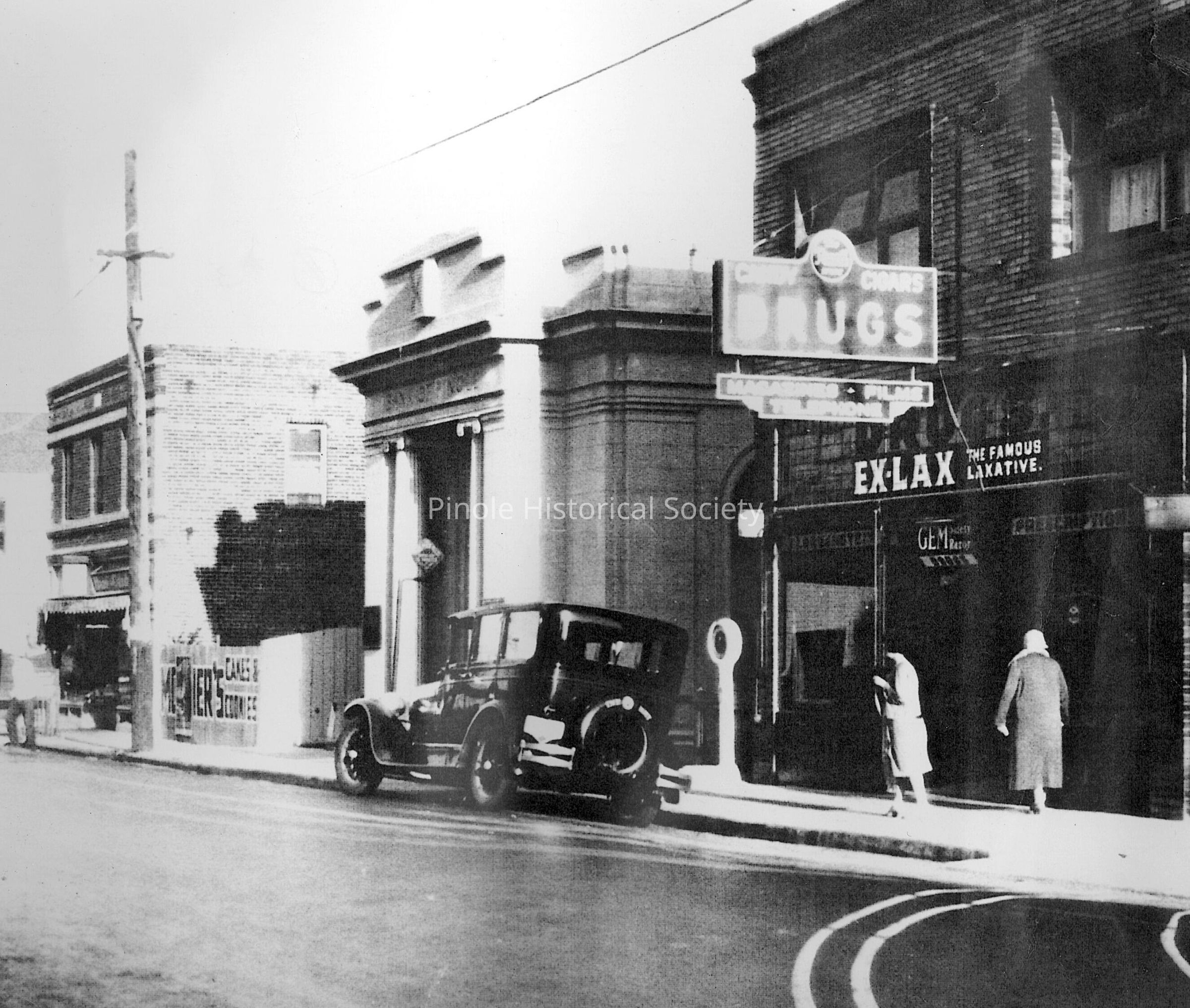 SOUTH SIDE OF SAN PABLO AVENUE LOOKING EAST: Downtown Pinole in the 1920s and 1930s was the place where people ventured to do their banking, shopping, and take care of their medical needs. All of these services existed in this one block between Tennent and Fernandez Avenues, with Greenstein’s Pharmacy and Dr. Manuel Fernandez sharing space in the Downer Building (far right), the Bank of Pinole (middle) and Louis Ruff’s grocery store (the brick building on the left). On west side of the brick Downer Building was a large mural featuring the city’s slogan, “The Sun-Kissed Gem by the Bay,” painted over a background of the bay. Residential and commercial buildings replaced many historic buildings of Old Pinole. The two brick edifices were severely damaged in the 1989 Loma Prieta earthquake and were torn down.Copyright