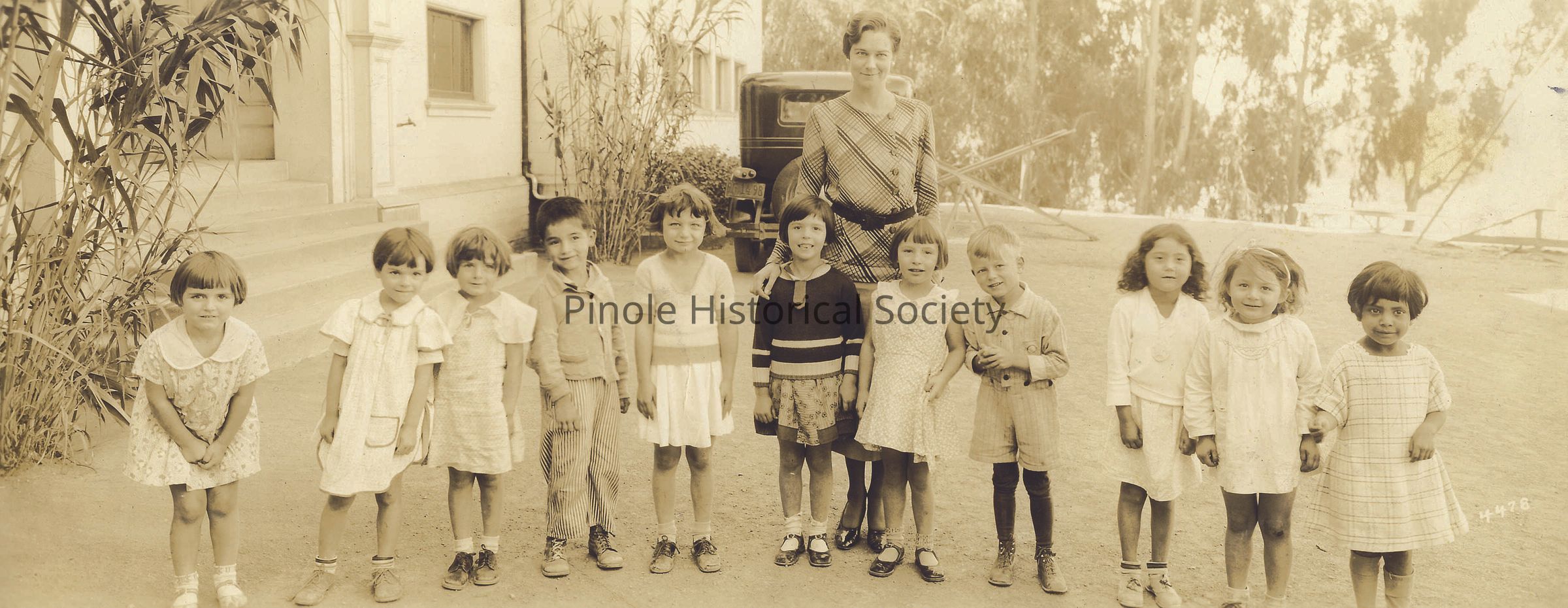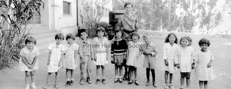 PINOLE-HERCULES SCHOOL #1: Class reunions are still held for graduates of this school, the “School on the Hill” or the “Old School,” which served the Pinole and Hercules communities for 60 years, beginning in 1906. Several of Pinole’s most-beloved teachers taught at this school, including Frances Ellerhorst, Elizabeth Stewart, and Margaret Collins, all of whom have schools named after them in the city. It was razed in 1968 to make way for the Pinole Grove Apartments, a residence for senior citizens, which incorporated some of the architectural elements of the school in its facade. This is the 1932 kindergarten class photo.Inscription/Signature/Marks