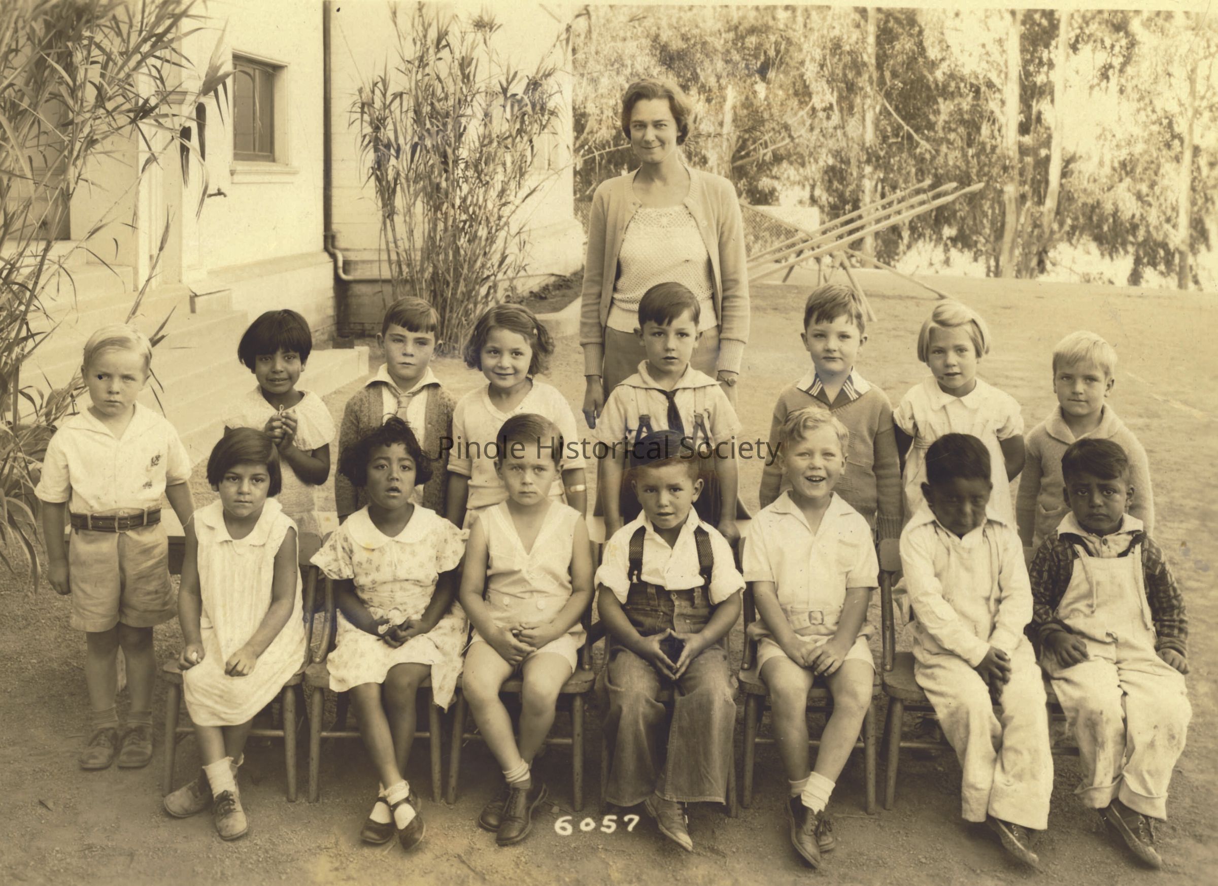PINOLE-HERCULES SCHOOL #1: Class reunions are still held for graduates of this school, the “School on the Hill” or the “Old School,” which served the Pinole and Hercules communities for 60 years, beginning in 1906. Several of Pinole’s most-beloved teachers taught at this school, including Frances Ellerhorst, Elizabeth Stewart, and Margaret Collins, all of whom have schools named after them in the city. It was razed in 1968 to make way for the Pinole Grove Apartments, a residence for senior citizens, which incorporated some of the architectural elements of the school in its facade. This is the 1933 kindergarten class photo.Inscription/Signature/Marks