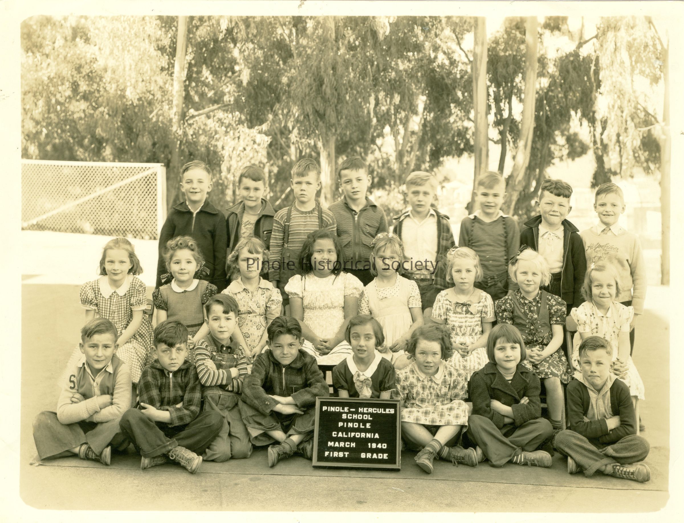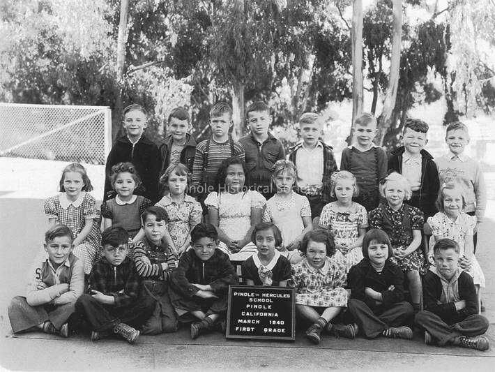 PINOLE-HERCULES SCHOOL #1: Class reunions are still held for graduates of this school, the “School on the Hill” or the “Old School,” which served the Pinole and Hercules communities for 60 years, beginning in 1906. Several of Pinole’s most-beloved teachers taught at this school, including Frances Ellerhorst, Elizabeth Stewart, and Margaret Collins, all of whom have schools named after them in the city. It was razed in 1968 to make way for the Pinole Grove Apartments, a residence for senior citizens, which incorporated some of the architectural elements of the school in its facade. This photo shows the 1940 class photo of the 1st grade class.Copyright