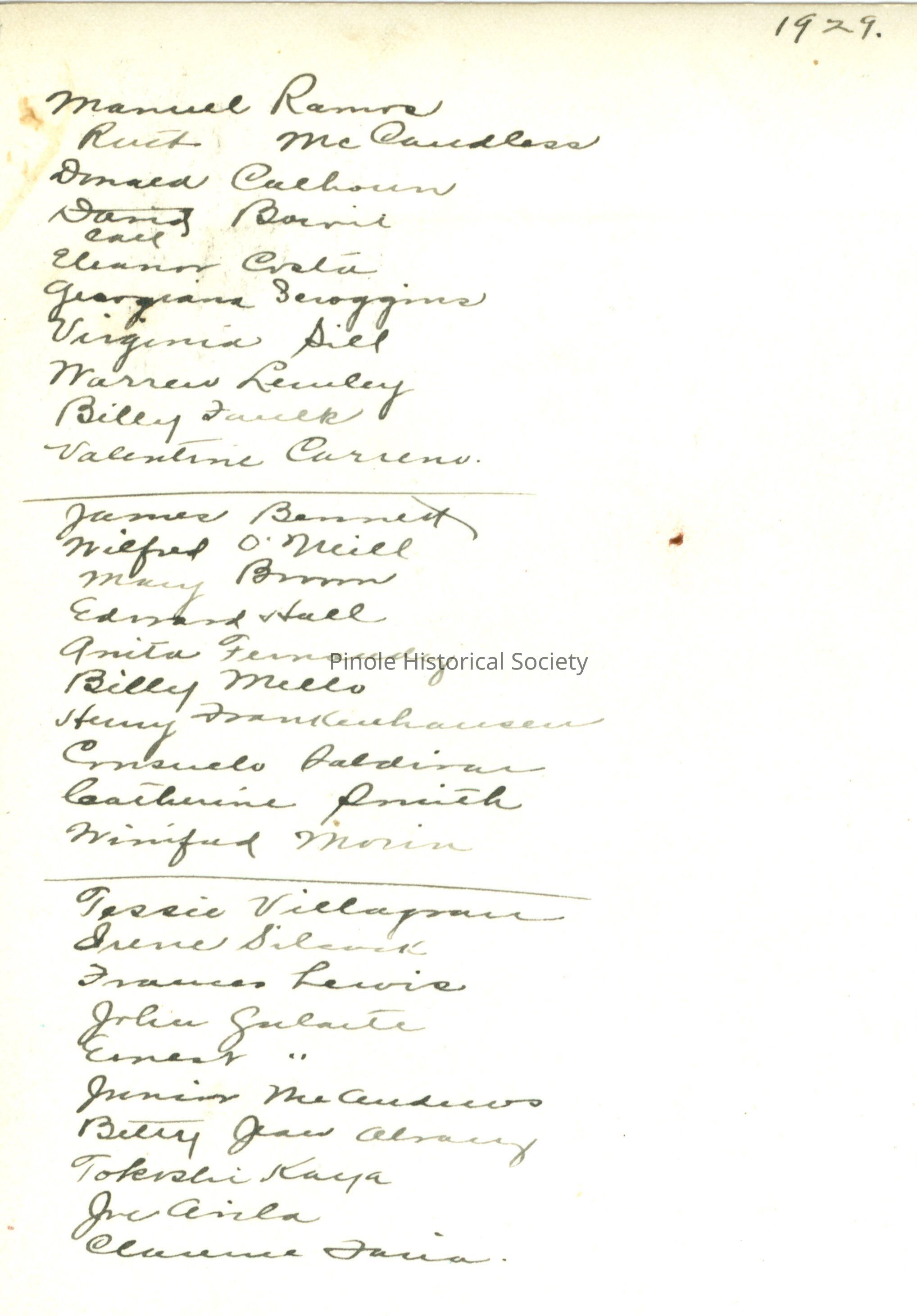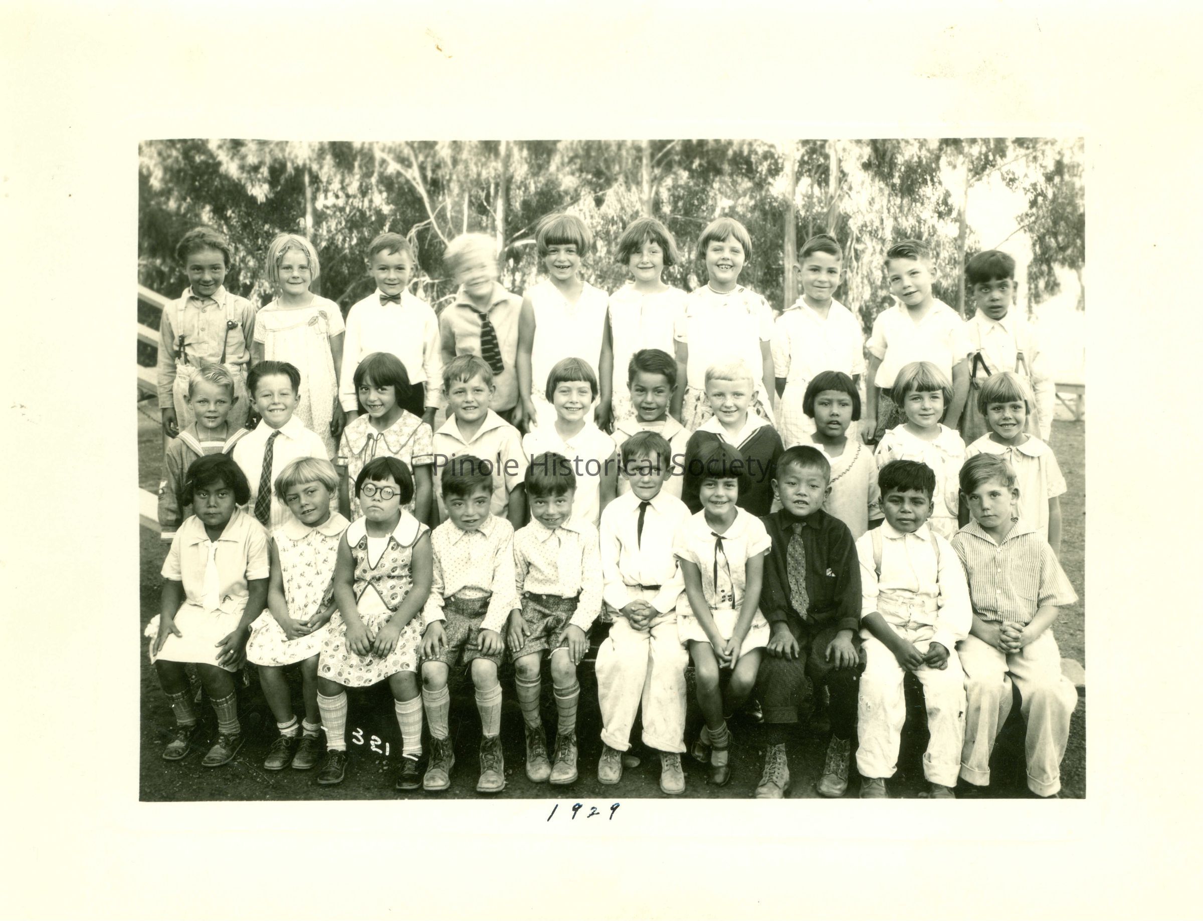 PINOLE-HERCULES SCHOOL #1: Class reunions are still held for graduates of this school, the “School on the Hill” or the “Old School,” which served the Pinole and Hercules communities for 60 years, beginning in 1906. Several of Pinole’s most-beloved teachers taught at this school, including Frances Ellerhorst, Elizabeth Stewart, and Margaret Collins, all of whom have schools named after them in the city. It was razed in 1968 to make way for the Pinole Grove Apartments, a residence for senior citizens, which incorporated some of the architectural elements of the school in its facade. This 1929 class photo includes student's names written on the back.Copyright