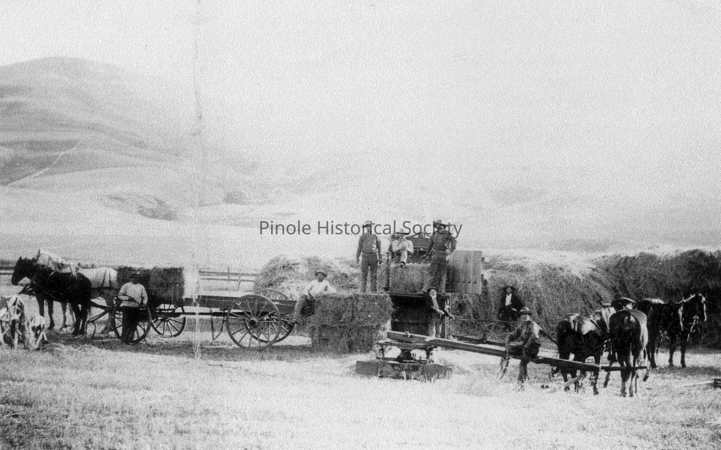 This photo shows an Amend Hay Press crew at work. Ranchers in the Pinole Valley would press hay into 250-pound bales by horse-powered presses and store them during the winter in Bernardo Fernandez’s large warehouses near San Pablo Bay. They hoped to sell the hay for a profit the following winter, as it took many tons of hay to feed the horses used by farmers and construction companies.Copyright