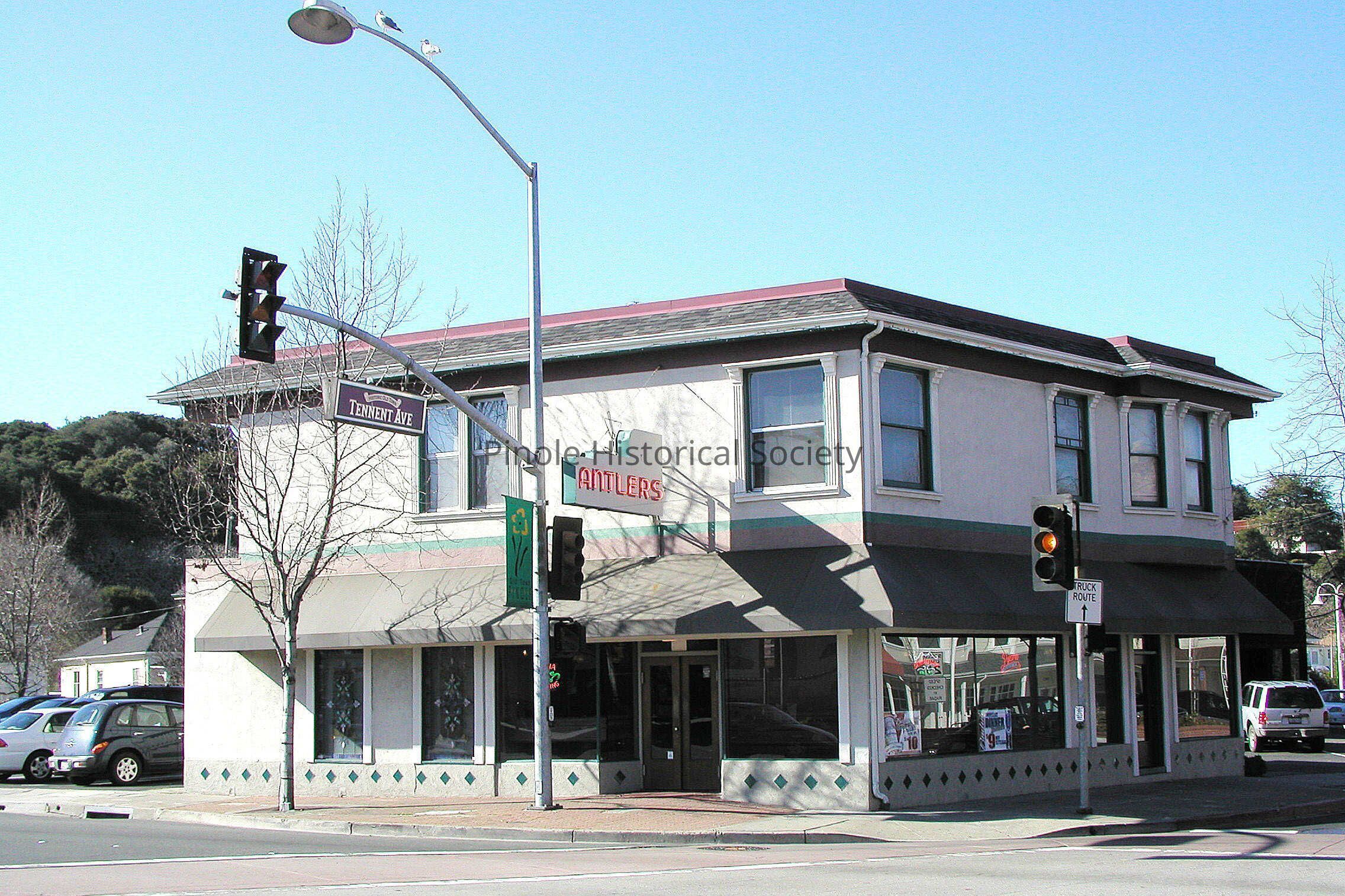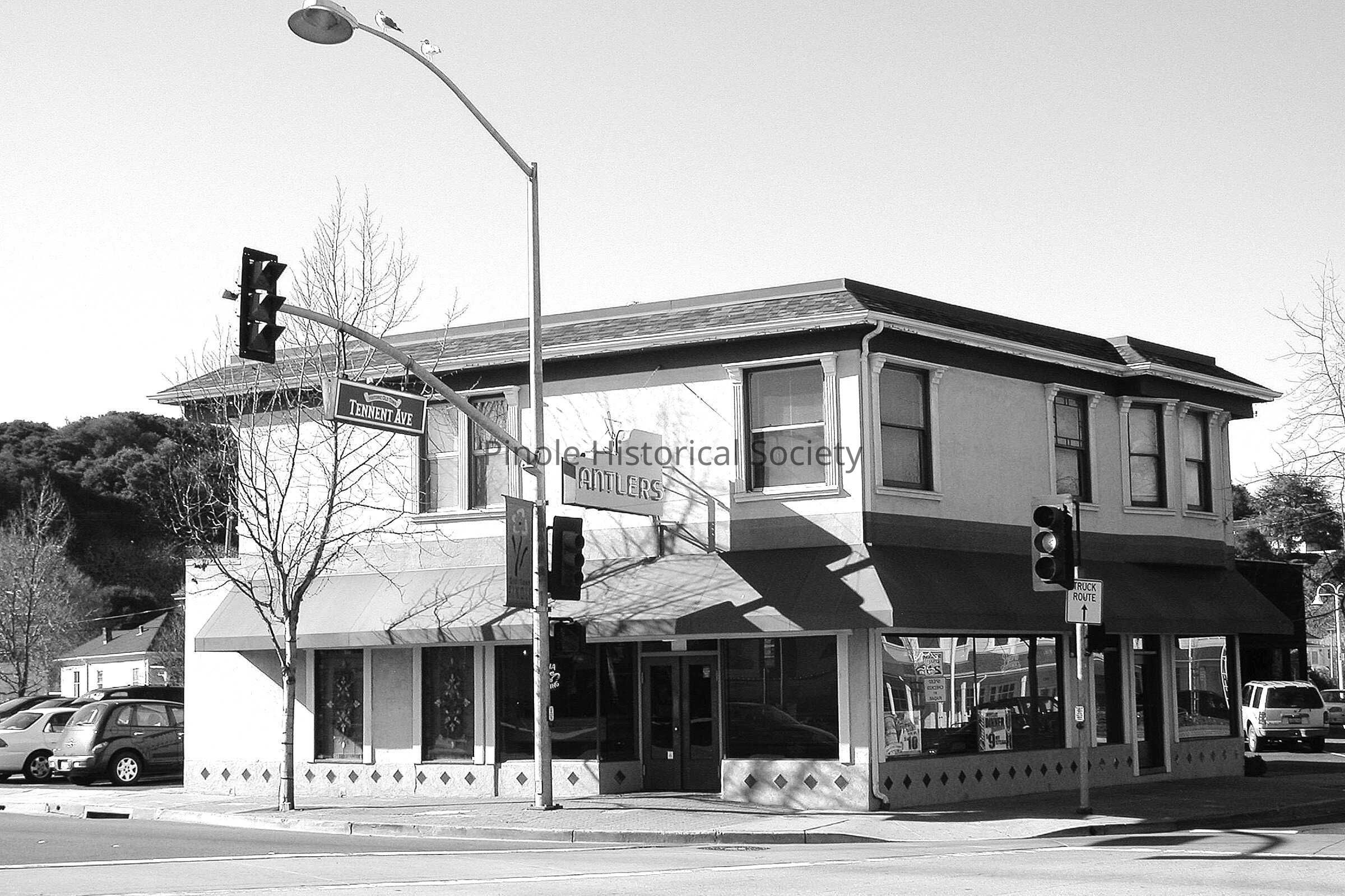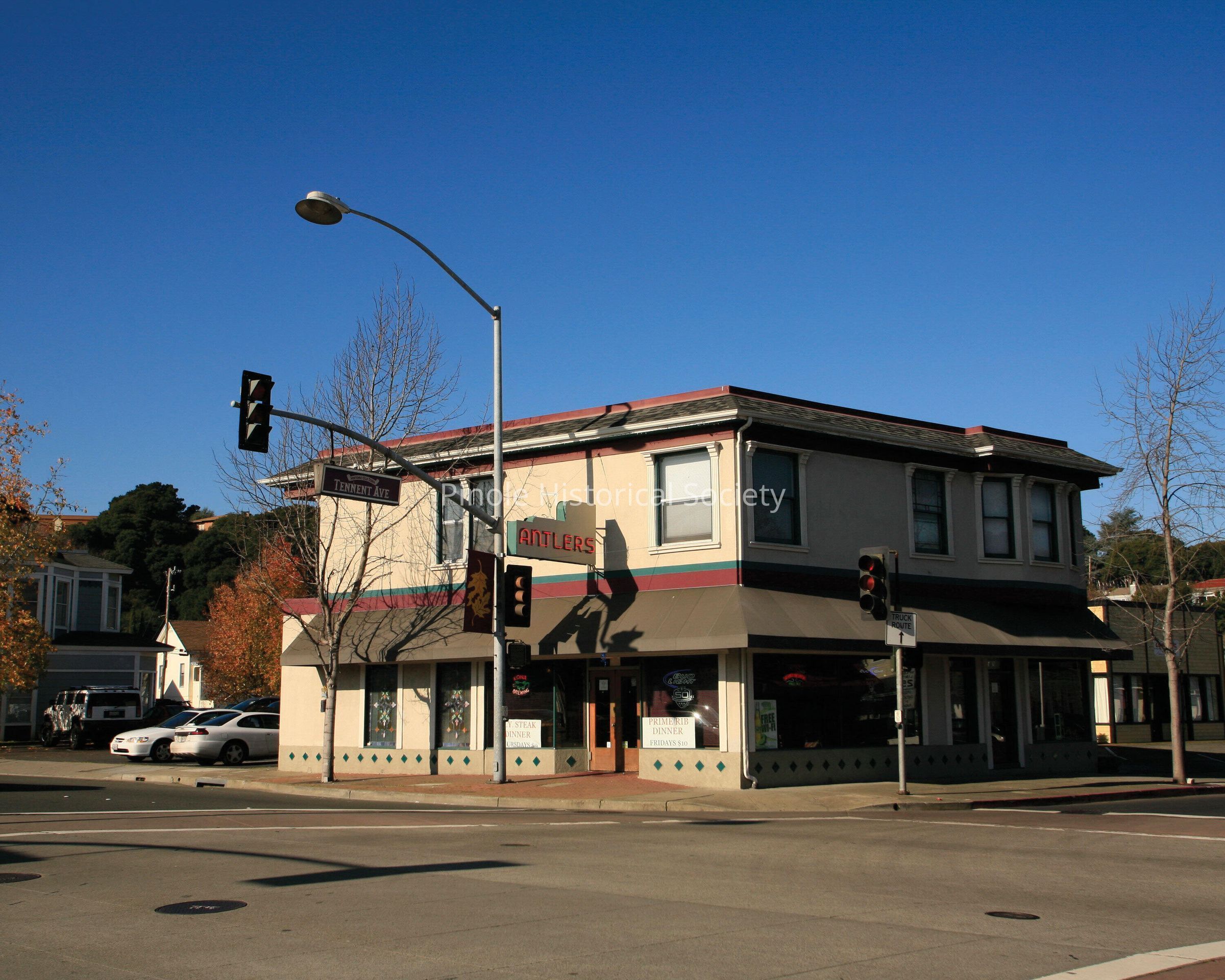 Antlers, the most famous of Pinole’s bars began its life in 1910 as the Swenson and Lewis Saloon, owned by Jack Silva. Jack “Squeaker” Silva lived upstairs in the early 1900s. He was an avid collector of animal trophy heads. He had a bear head, a moose head, a mountain lion on display, and a full-length deer in the tavern window facing San Pablo Avenue. It was owned by several people in the ensuing years, most notably Frank Lunghi (1950-76). Frank took over the Trovatore Café from his parents, then closed it when he bought Antlers, which was across the street. The Torretta family has owned Antlers since patriarch Al Torretta bought it from Lunghi in 1976.Made/Created