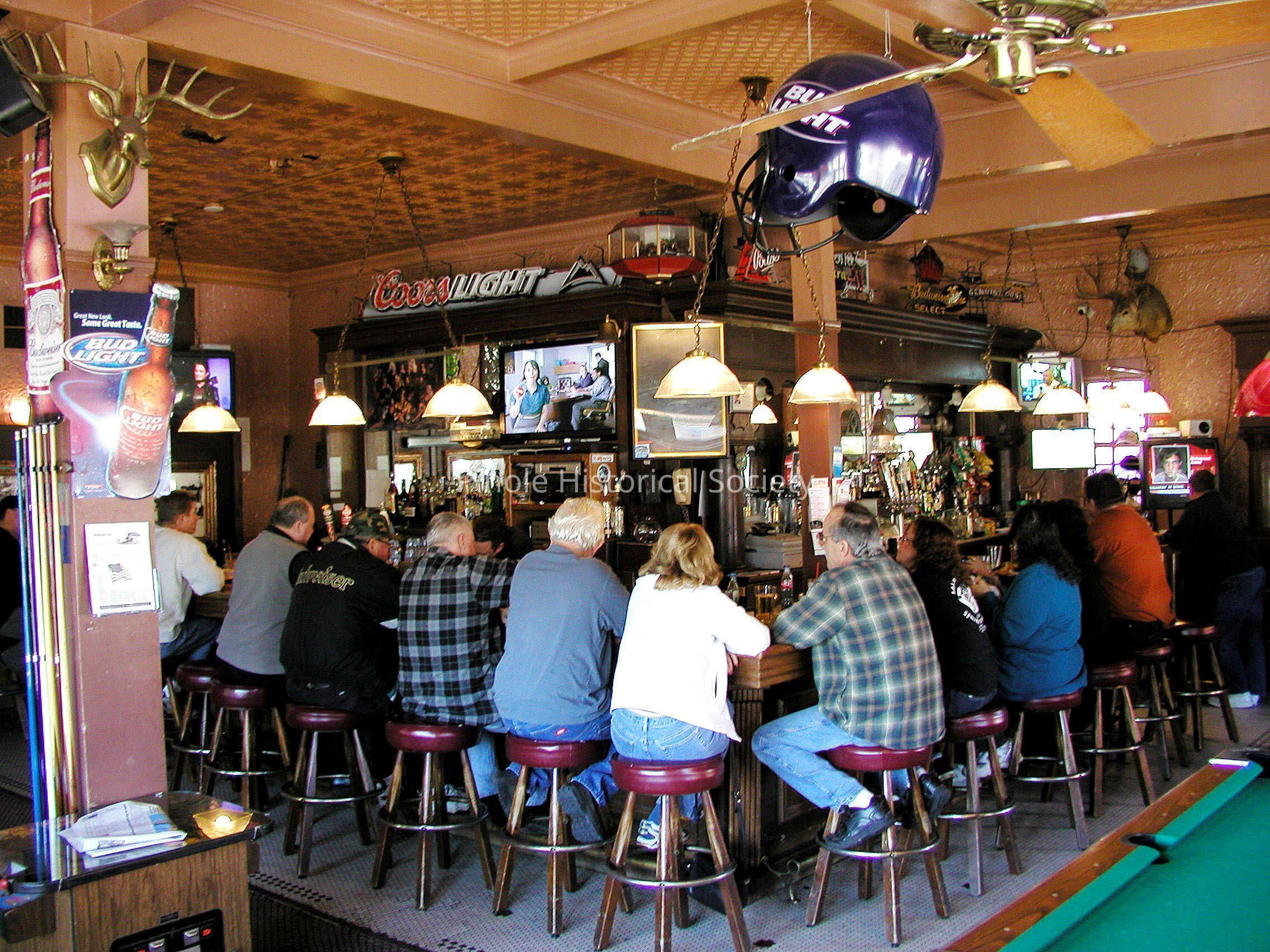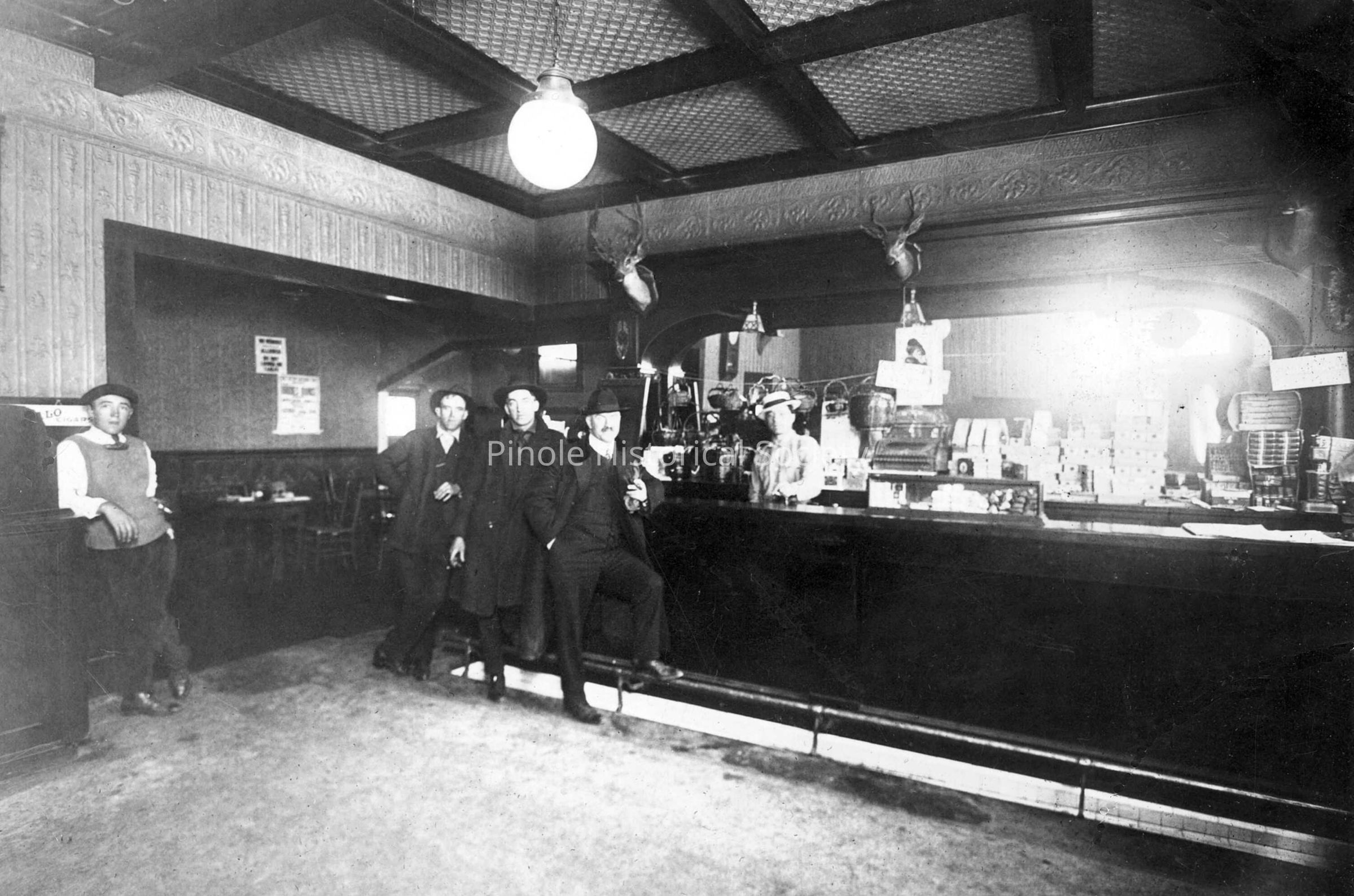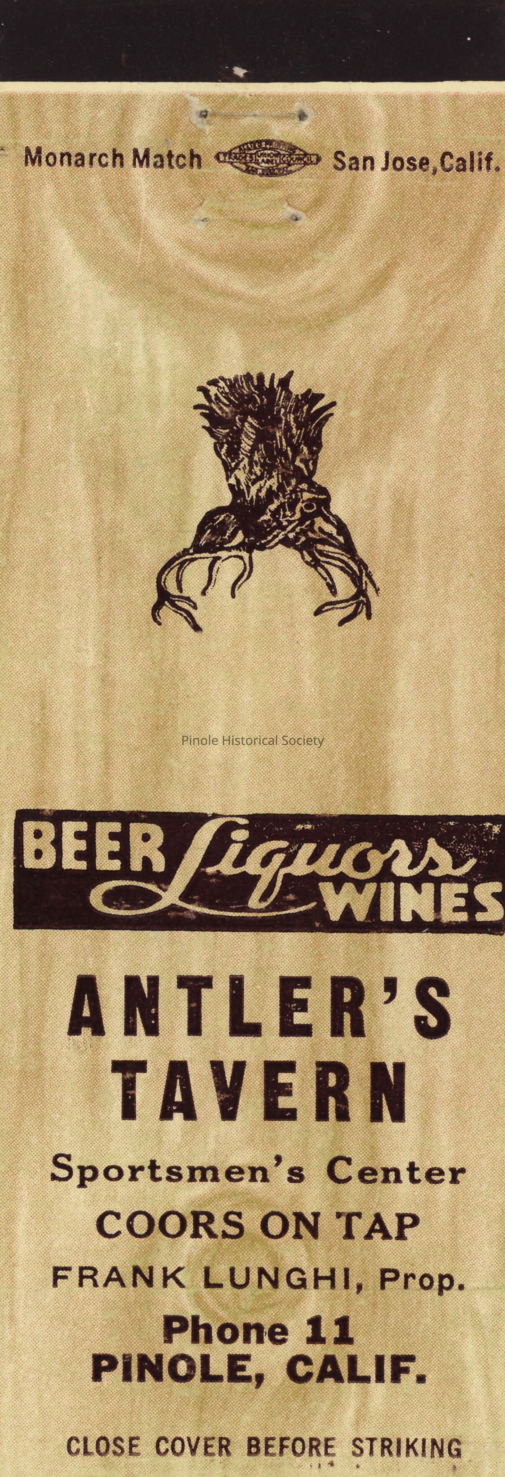 Antlers, the most famous of Pinole’s bars began its life in 1910 as the Swenson and Lewis Saloon, owned by Jack Silva. Jack “Squeaker” Silva lived upstairs in the early 1900s. He was an avid collector of animal trophy heads. He had a bear head, a moose head, a mountain lion on display, and a full-length deer in the tavern window facing San Pablo Avenue. It was owned by several people in the ensuing years, most notably Frank Lunghi (1950-76). Frank took over the Trovatore Café from his parents, then closed it when he bought Antlers, which was across the street. The Torretta family has owned Antlers since patriarch Al Torretta bought it from Lunghi in 1976.Made/Created
