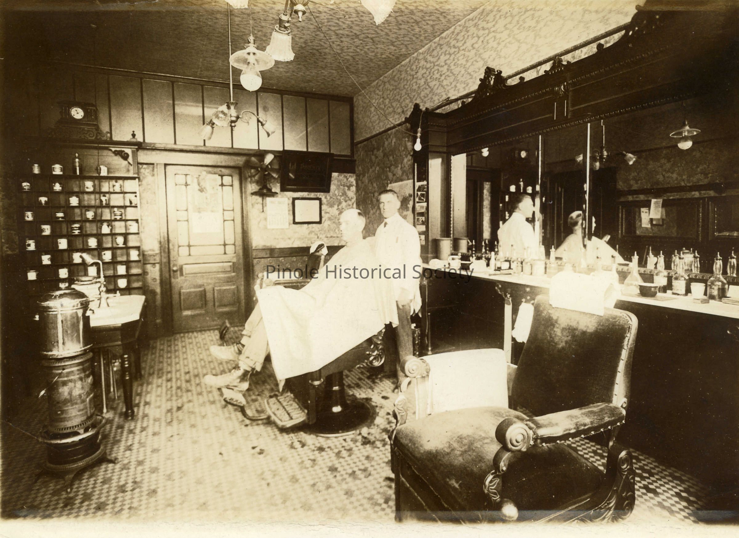 The barber is Benjamin Christian. Benjamin's daughter was Mildred Christian. She married William Neylan. They lived in Plum Street, near St. Joseph's Church. Their son, Elmer P. Neylan, age 94 as of November 2013, gave us this photo. He lives at 1125 Arlington Boulevard, El Cerrito, CA 94530. As a child he lived across from the church.