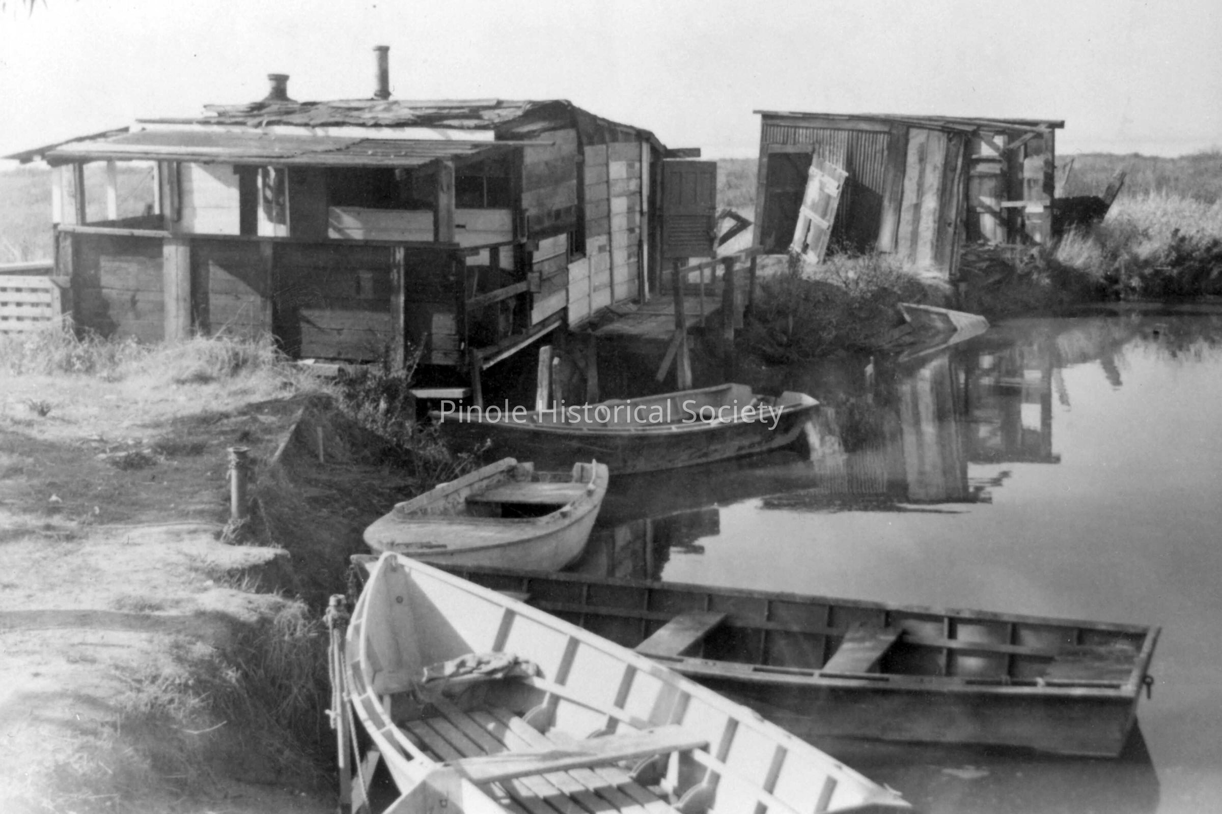 BILL SEXTON HOME: The William Sexton home lay across the Southern Pacific Railroad tracks, northwest of the mouth of Pinole Creek. Sexton rented from the Fernandez family. William Sexton was born in Ireland in 1861. He immigrated to the U.S. in 1868 and became a naturalized citizen. His son, Bill, was born in 1898. In 1930, father and son were living in this bay-front home. Bill attended Pinole-Hercules School #1 and worked as a carpenter and truck driver for the Selby Smelting Company. By 1940, Bill and his wife, Vera, had moved to a home on San Pablo Avenue. The 1958 Pinole flood washed away what was left of the Sexton home, seen here in 1955.Copyright