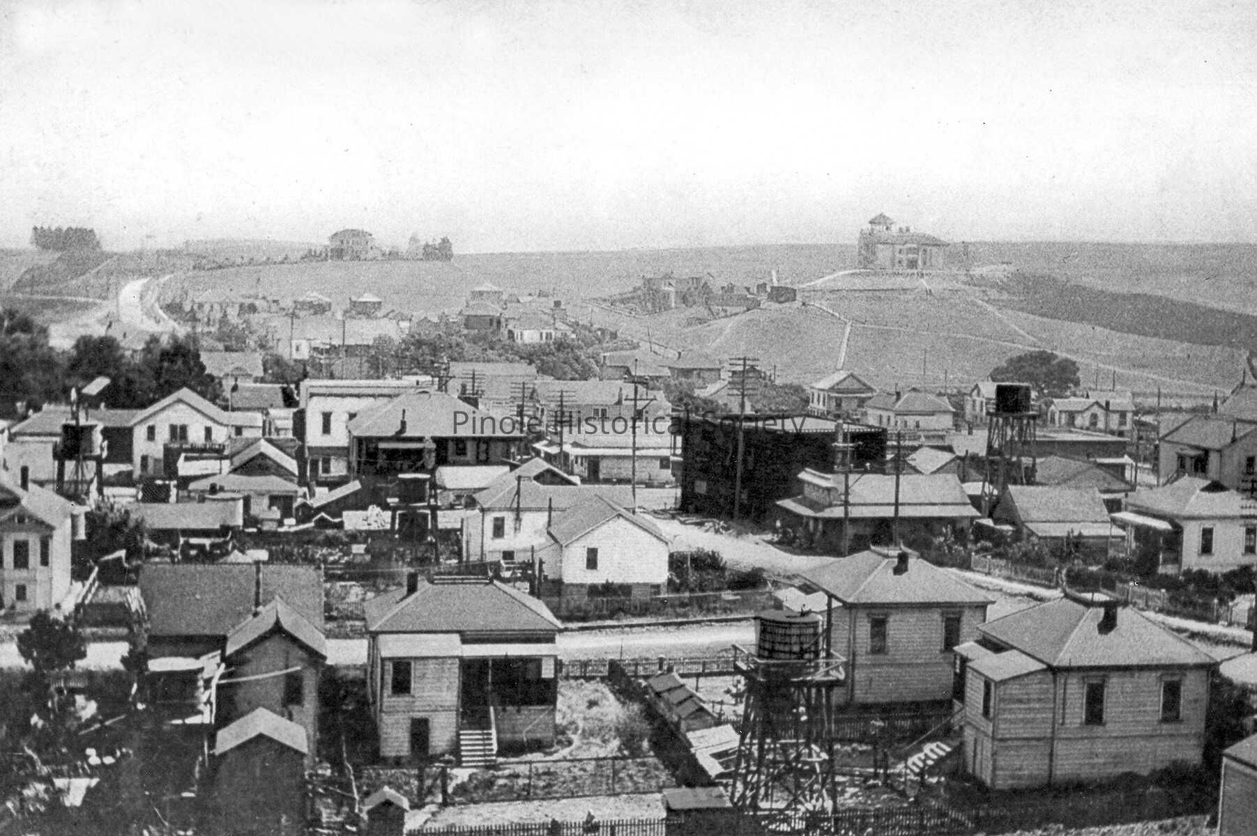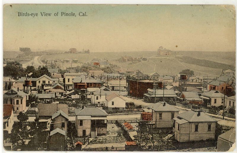 Downtown Pinole, c. 1900-1910. The Pinole-Hercules School #1 is visible at the top right, and the Downer Mansion is at the top left in the distance on the Hercules border. The school opened in 1906. The intersection in the foreground is Quinan Street and Main Street. In 1906, Edward M. Downer Sr. and other businessmen of Pinole developed the Pinole Light and Power Company. With the help of the Hercules Powder Company, electric lights were brought to Pinole. Water was supplied to the city, again with the help of the powder company. Water was piped to residents of Pinole and Hercules from a reservoir built in Pinole.Copyright