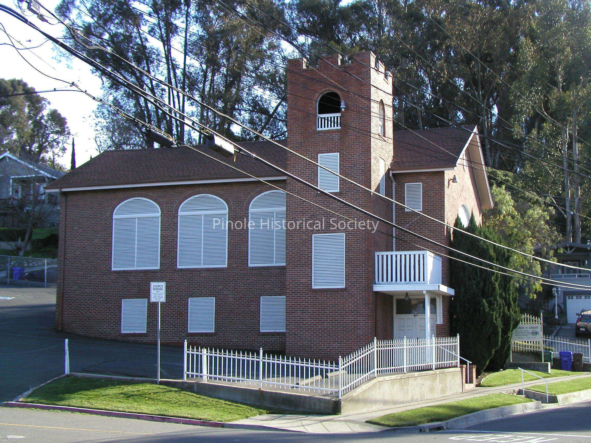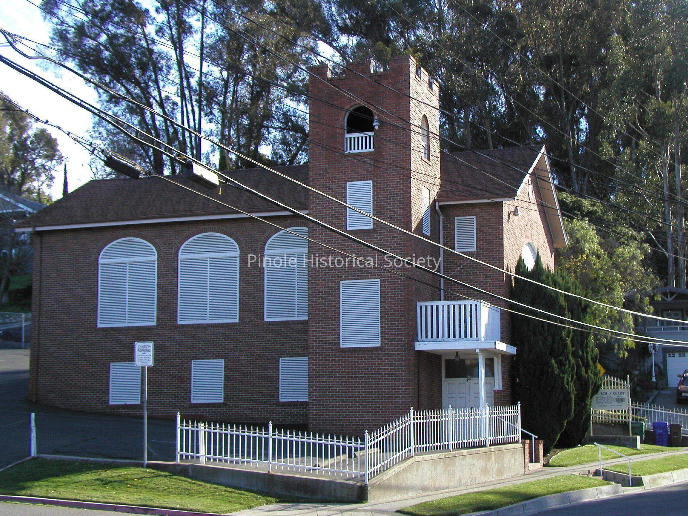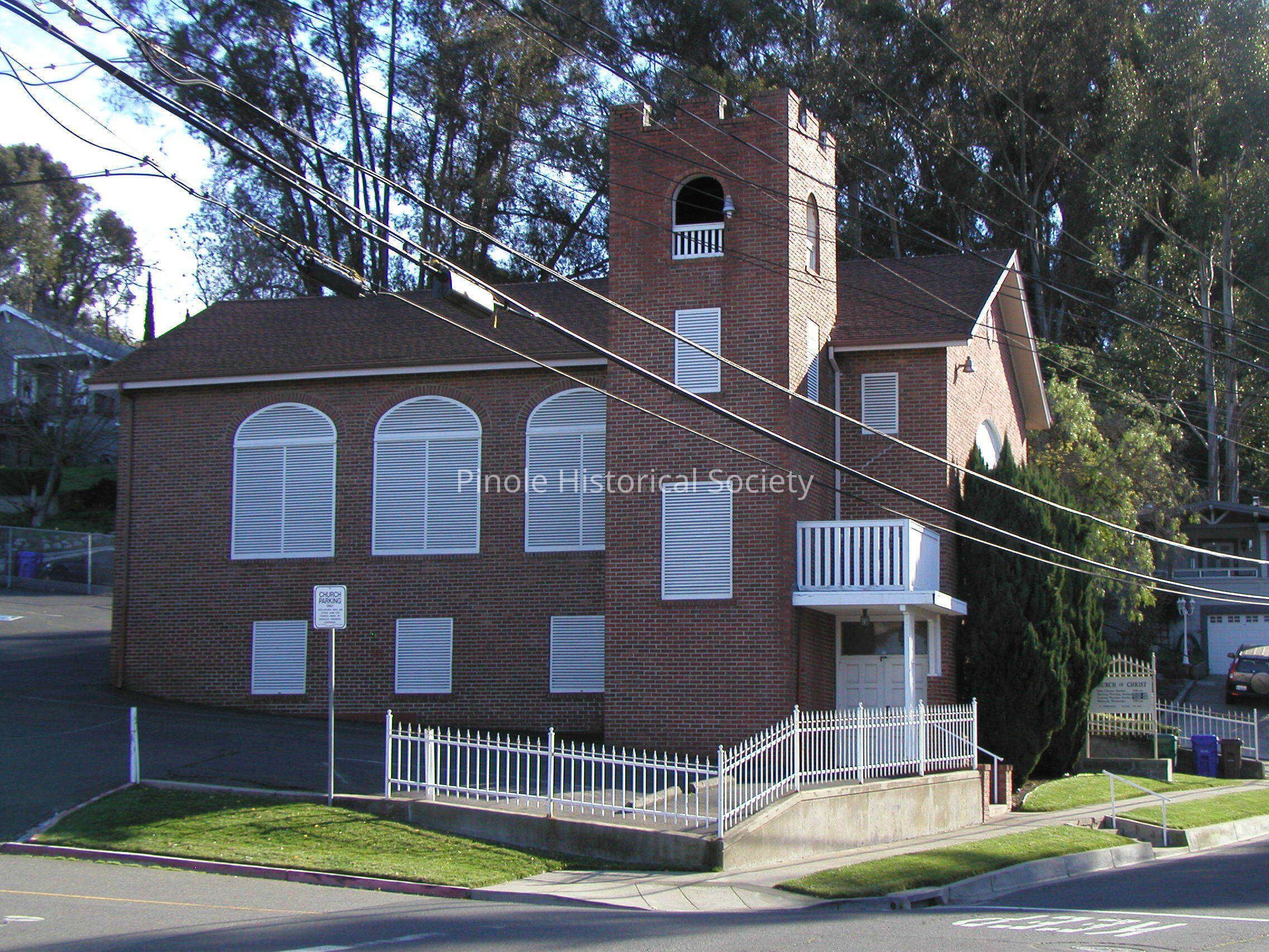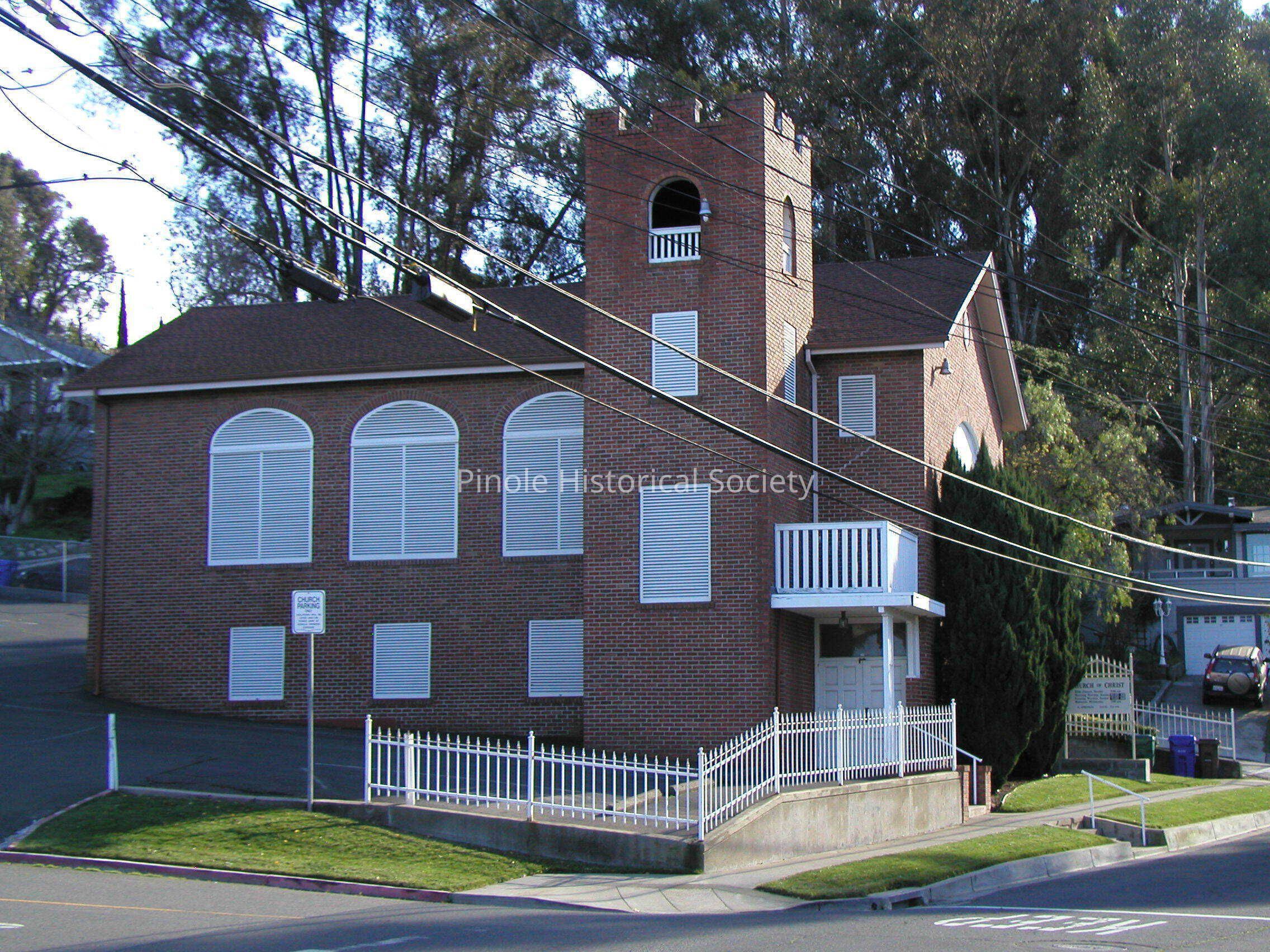 CHURCH OF CHRIST: Meetings of the Pinole-Hercules Methodist Episcopal Church were held in Pinole’s schoolhouse on the city plaza when it was organized in 1890. The church built its own building on San Pablo Avenue, near School Street, in 1898, an A-frame structure that is still in use. The second Methodist Episcopal Church on Valley Avenue, a modern brick building, was built in 1925, and dedicated to the memory of Elizabeth Downer, an impassioned volunteer in the church for many years and the wife of Bank of Pinole founder E.M. Downer Sr. This Valley Avenue church is now the home of the Church of Christ.Copyright