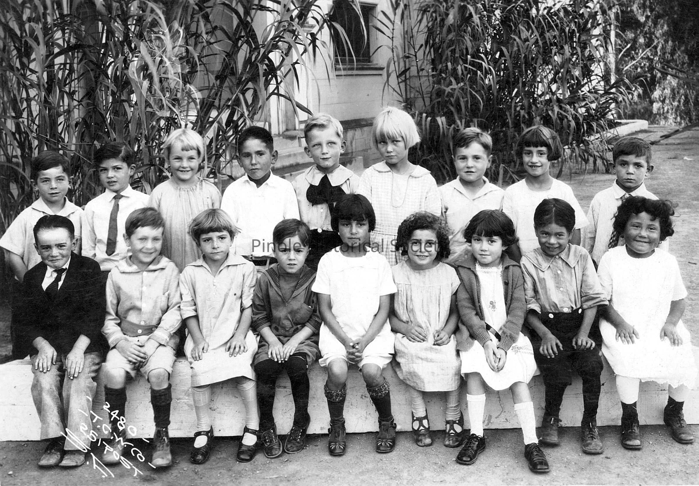 PINOLE-HERCULES SCHOOL #1: Class reunions are still held for graduates of this school, the “School on the Hill” or the “Old School,” which served the Pinole and Hercules communities for 60 years, beginning in 1906. Several of Pinole’s most-beloved teachers taught at this school, including Frances Ellerhorst, Elizabeth Stewart, and Margaret Collins, all of whom have schools named after them in the city. It was razed in 1968 to make way for the Pinole Grove Apartments, a residence for senior citizens, which incorporated some of the architectural elements of the school in its facade. This is a 1st grade class photo from the 1920s.Inscription/Signature/Marks