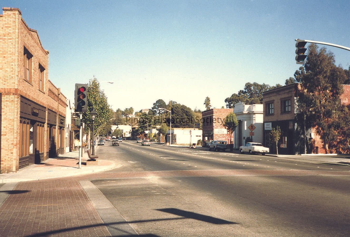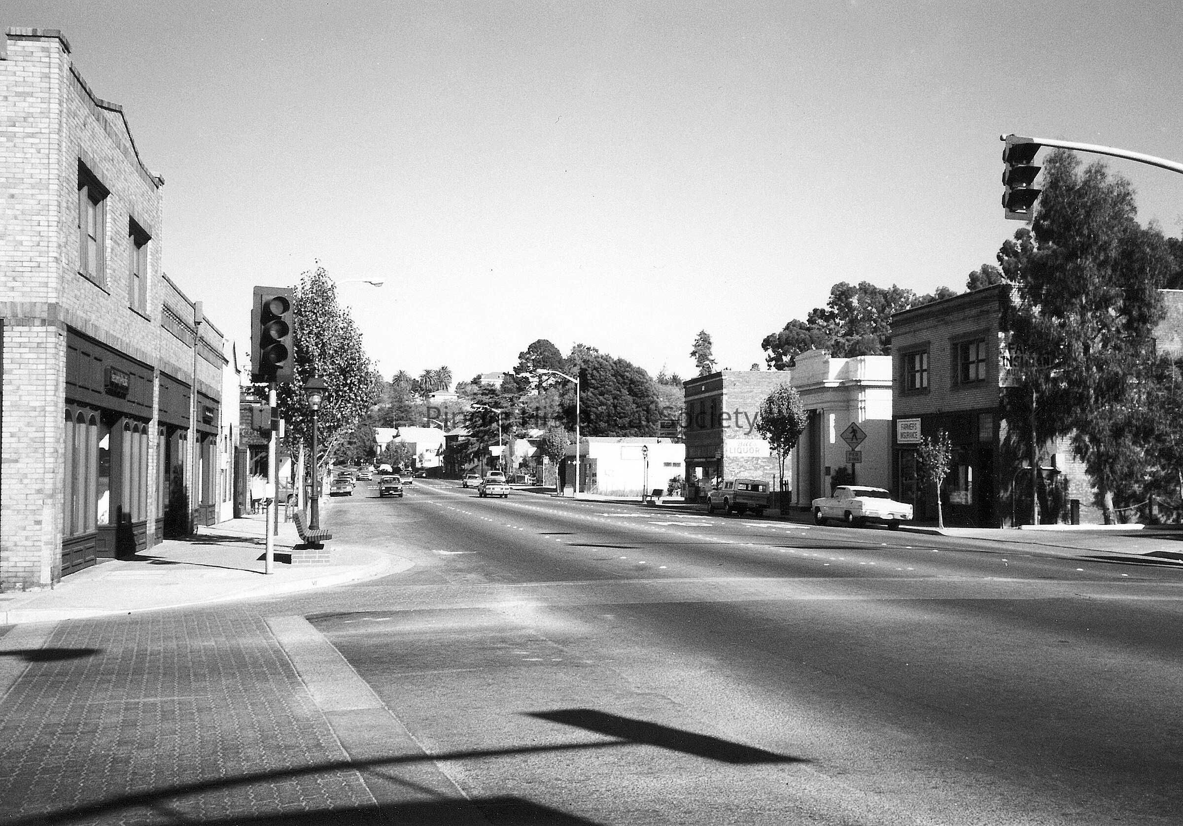 SAN PABLO AVENUE LOOKING EAST: By the middle of the 20th century Pinole had a modern downtown business district. Wooden structures gave way to brick buildings that were less likely to burn down. San Pablo Avenue had been widened to allow for two traffic lanes in each direction, and many of the bars that had been a major part in much of the city’s early history were gone, giving way to restaurants and retail stores. Louis Ruff’s store (later Bill’s Liquor), and the Downer Building that housed the offices of Dr. Manuel Fernandez and Greenstein’s Pharmacy (later Snyder’s Pharmacy) and a Farmer’s insurance agency, were damaged in the 1989 Loma Prieta earthquake and later demolished.Copyright