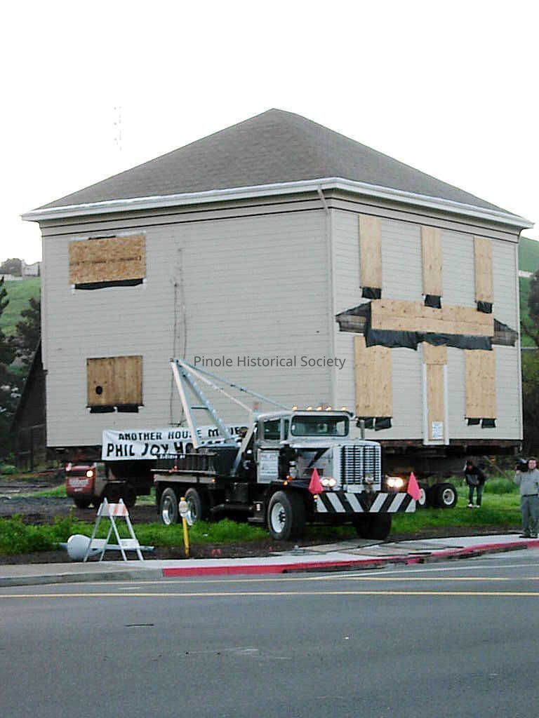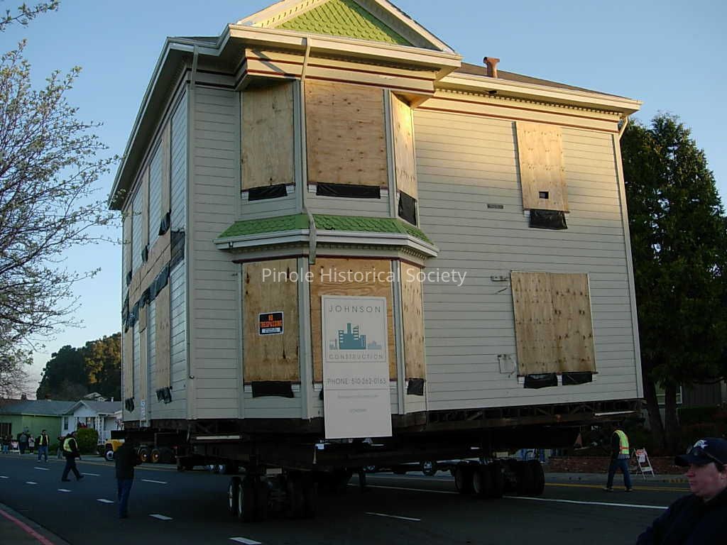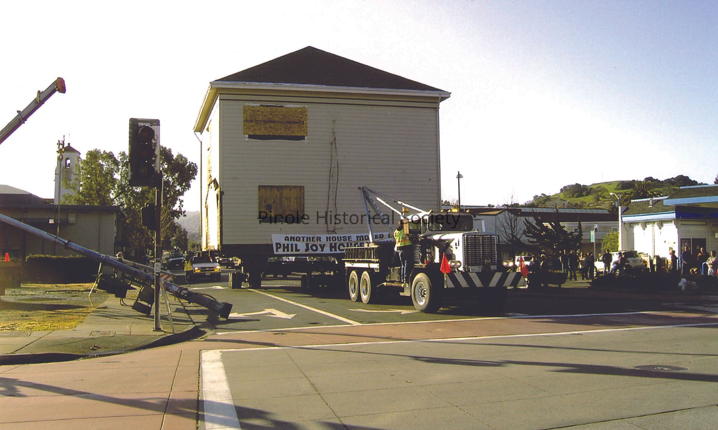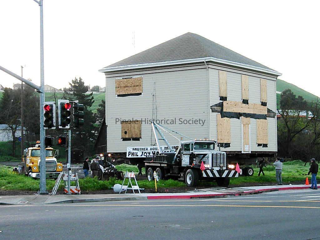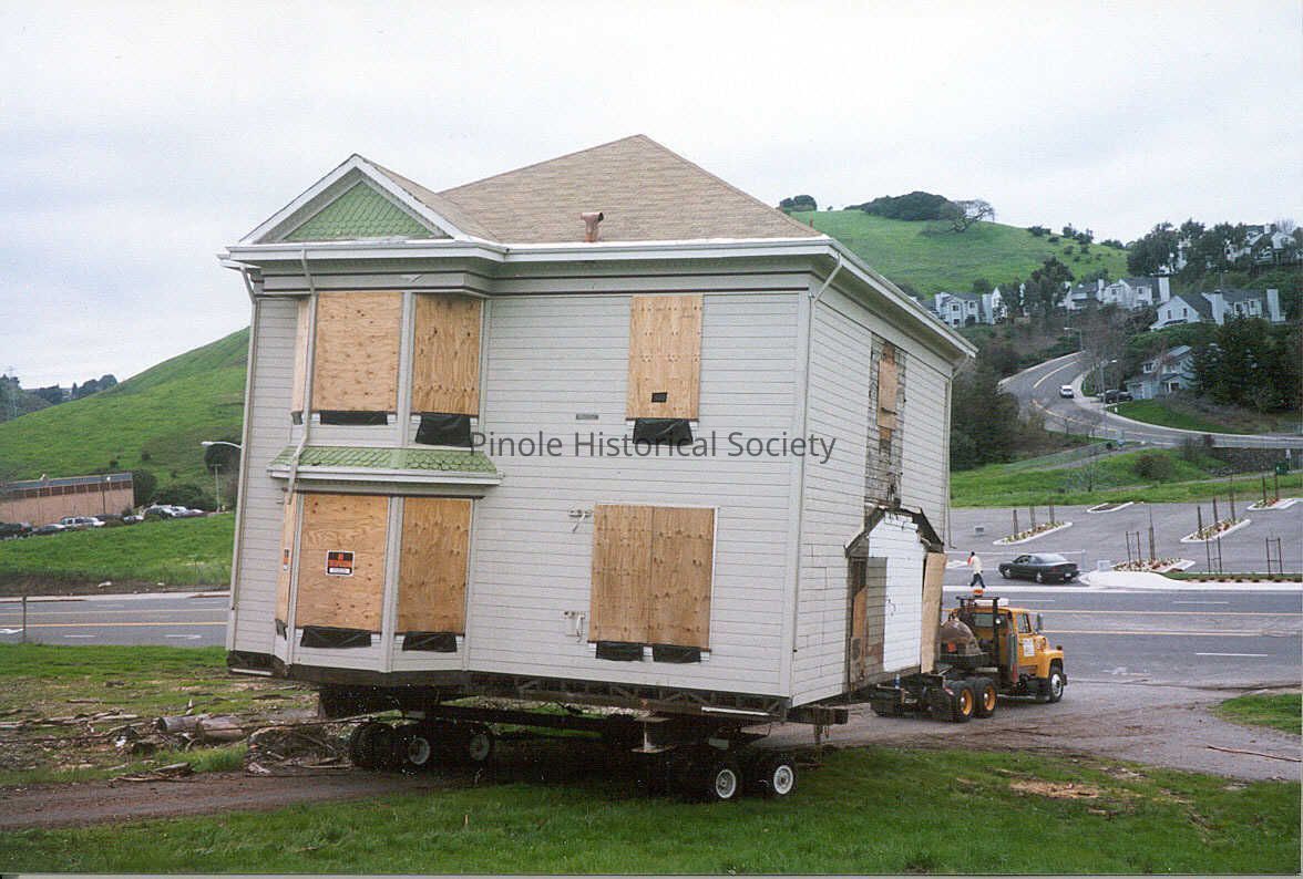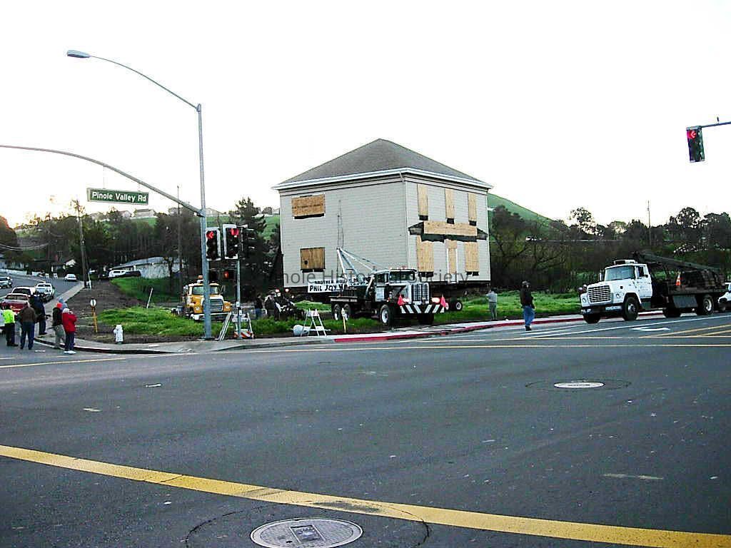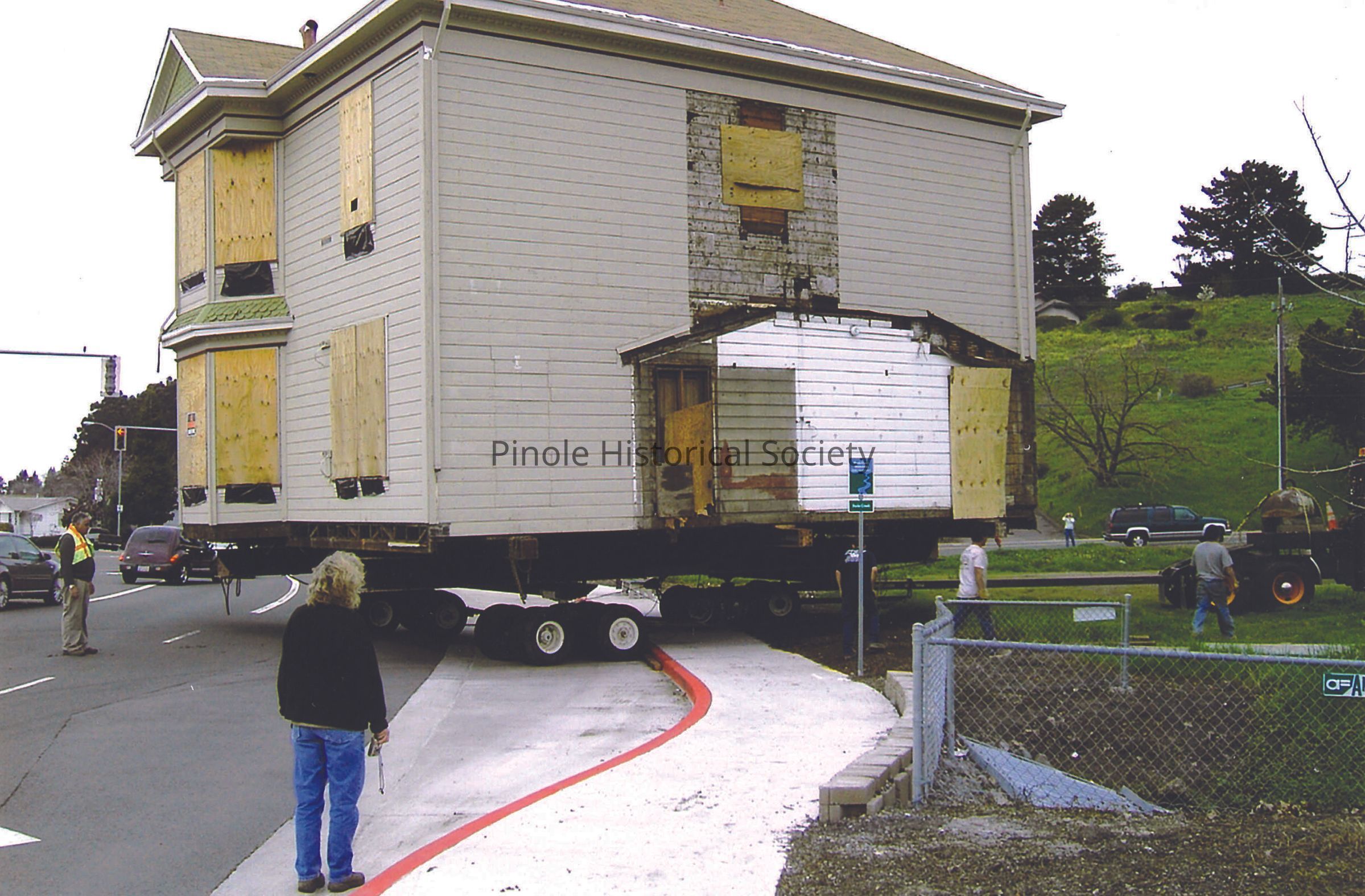 The move of the Faria House to downtown Pinole in 2005 was a citywide event that attracted numerous onlookers along its one-mile journey. Hoisted onto a flatbed truck, the 1880 home built for the son and daughter-in-law of Dr. Samuel J. Tennent inched its way north down Tennent Avenue before turning west on San Pablo Avenue, on the way to its new residence in Heritage Park. The vacant building, photographed by Larry Neptune, was recently painted, and the Pinole Garden Club tends to its rose bushes.Copyright