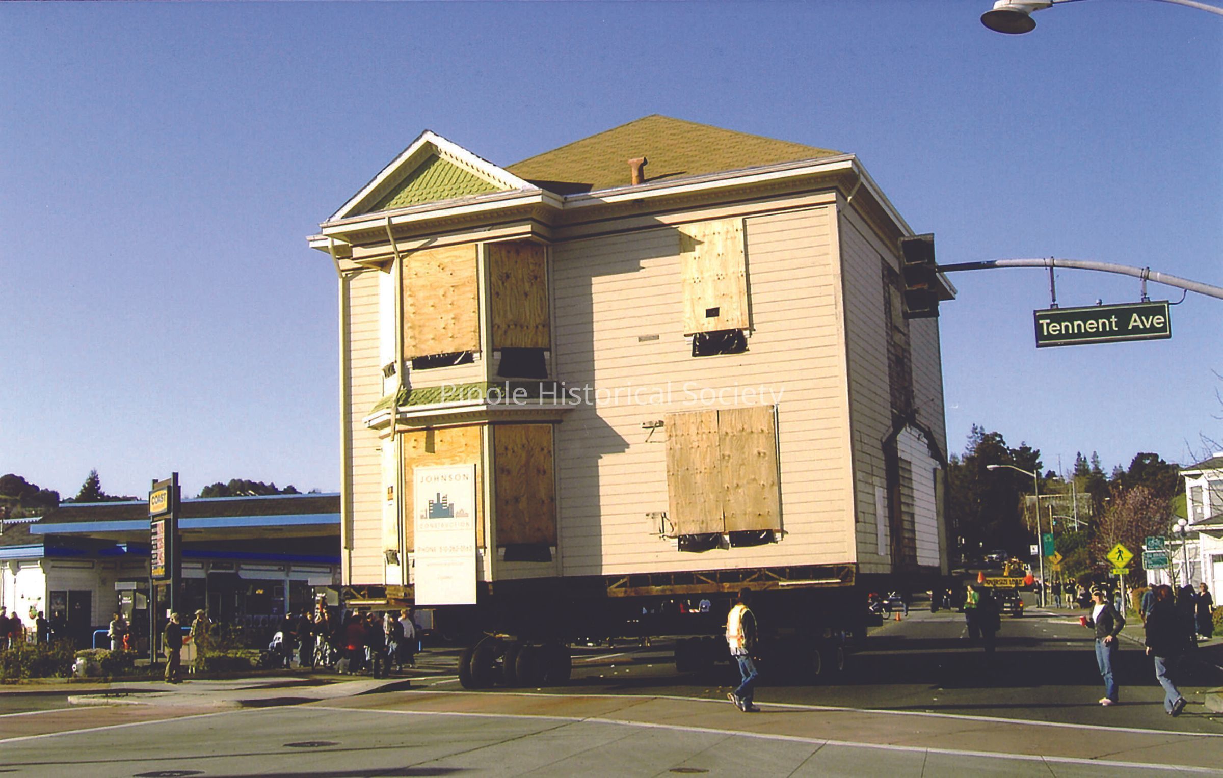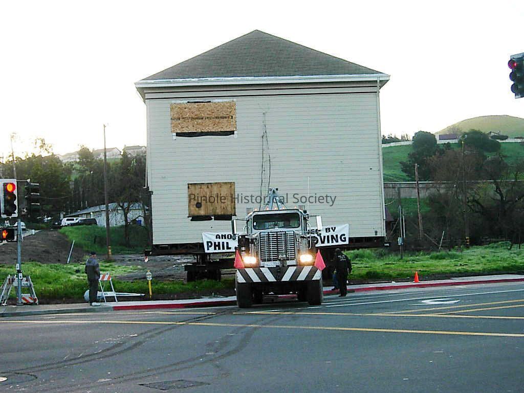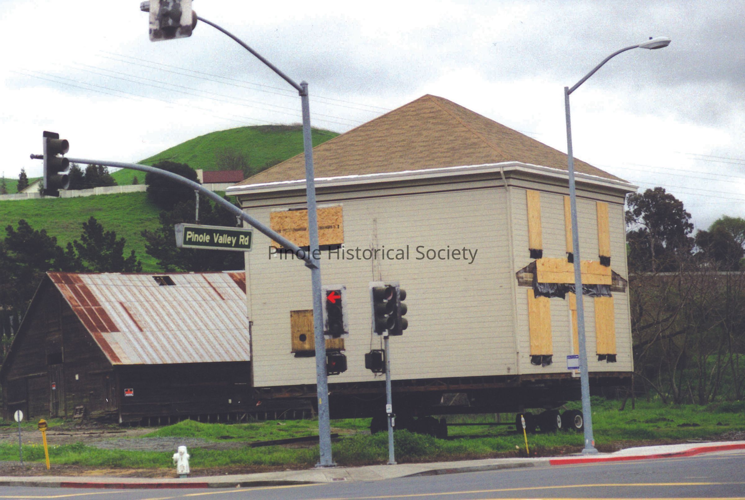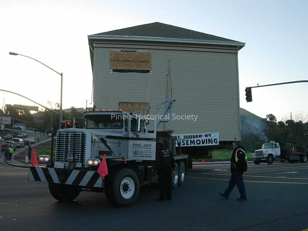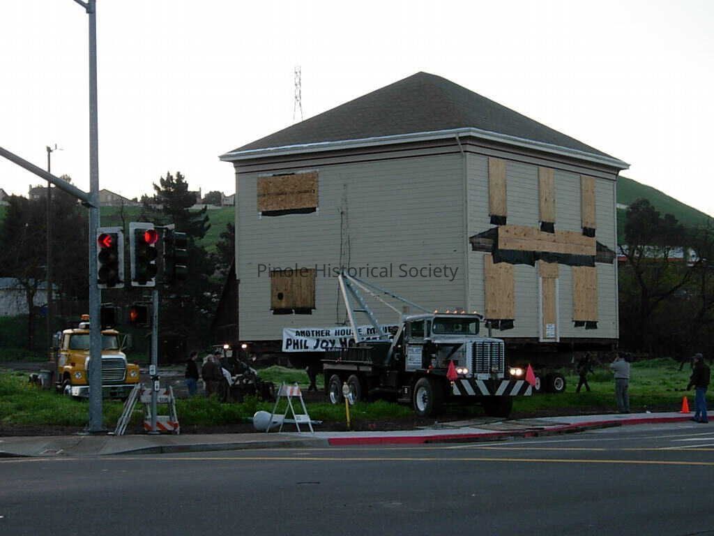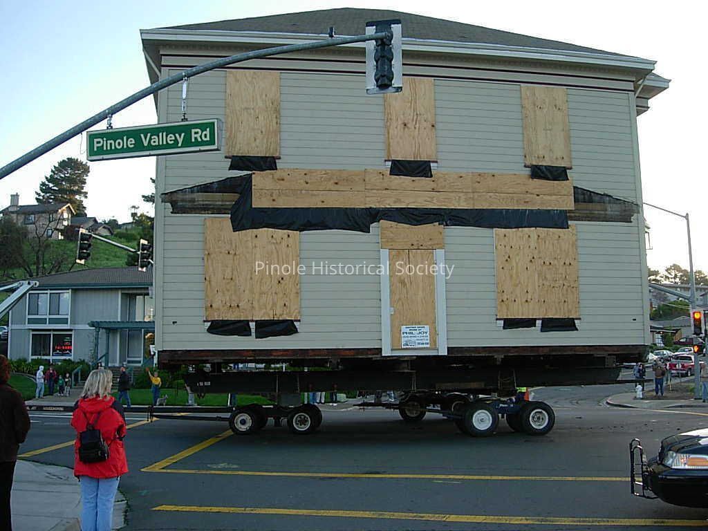 The move of the Faria House to downtown Pinole in 2005 was a citywide event that attracted numerous onlookers along its one-mile journey. Hoisted onto a flatbed truck, the 1880 home built for the son and daughter-in-law of Dr. Samuel J. Tennent inched its way north down Tennent Avenue before turning west on San Pablo Avenue, on the way to its new residence in Heritage Park. The vacant building, photographed by Larry Neptune, was recently painted, and the Pinole Garden Club tends to its rose bushes.Copyright