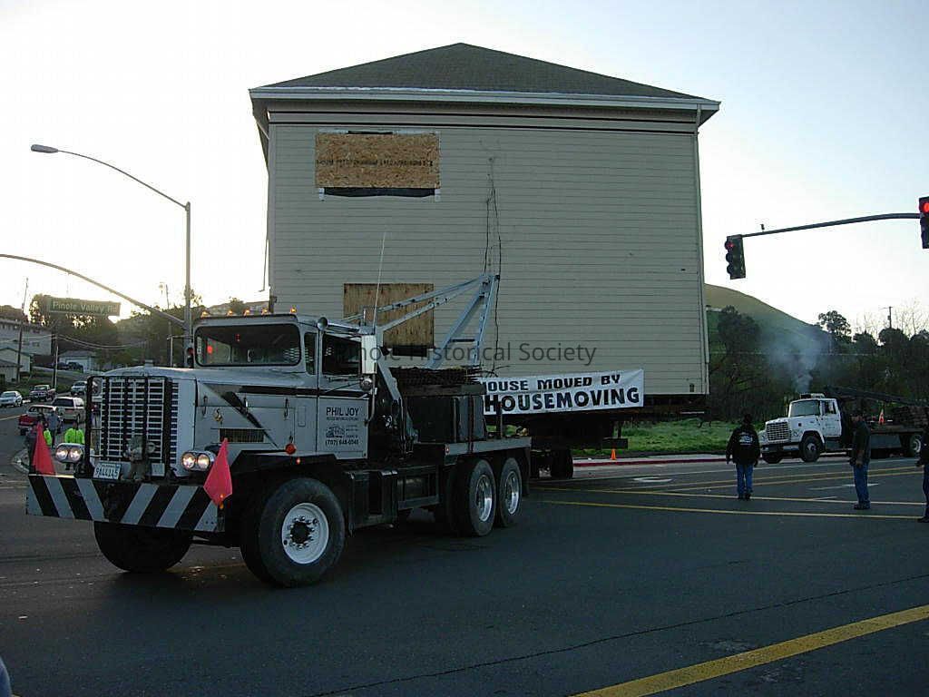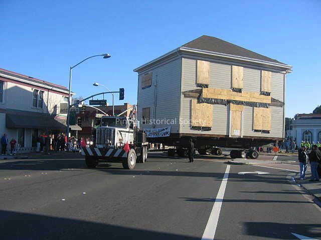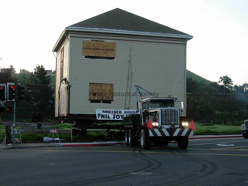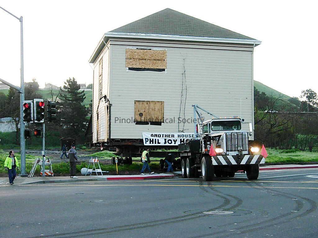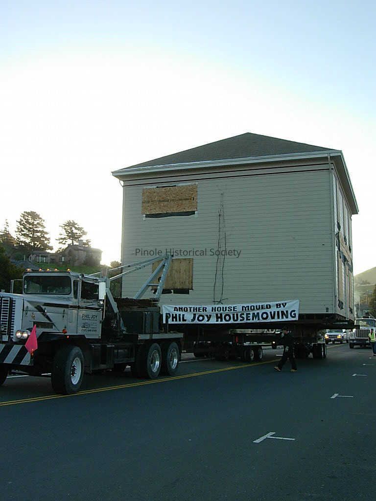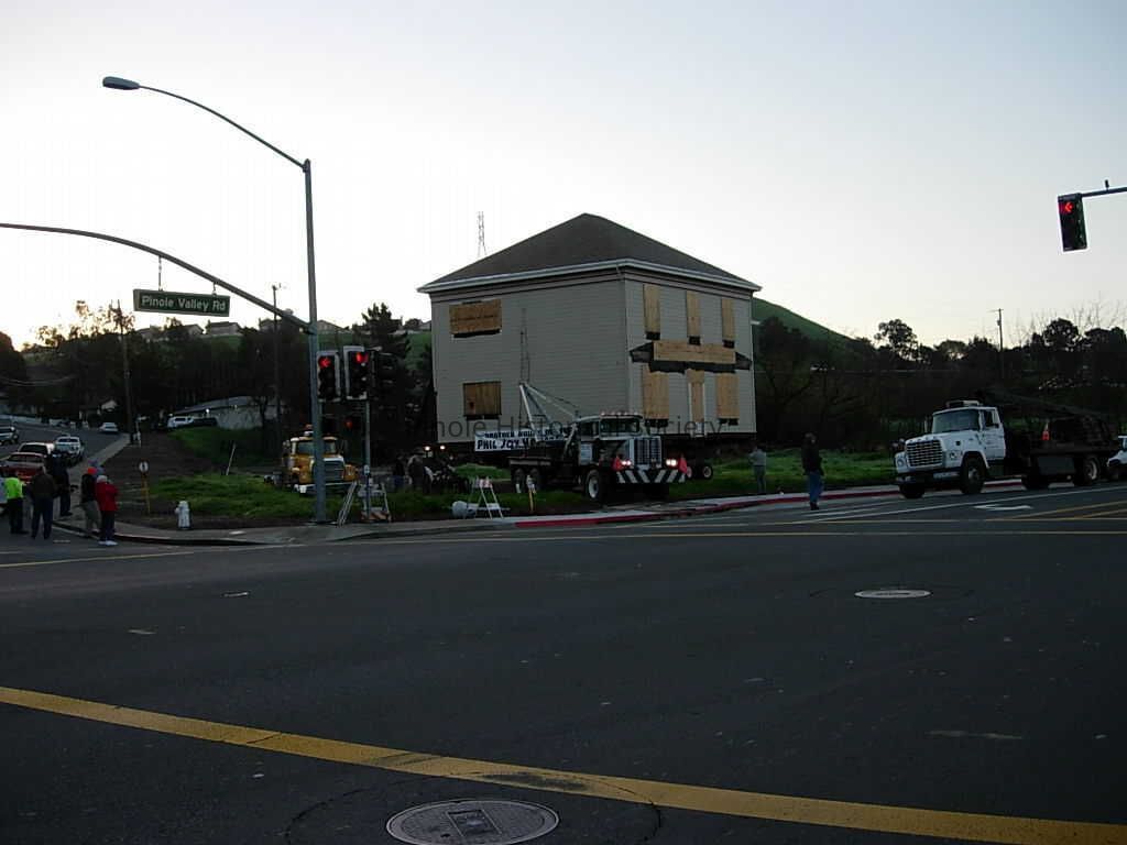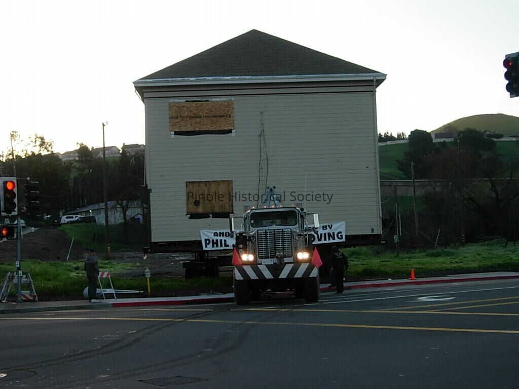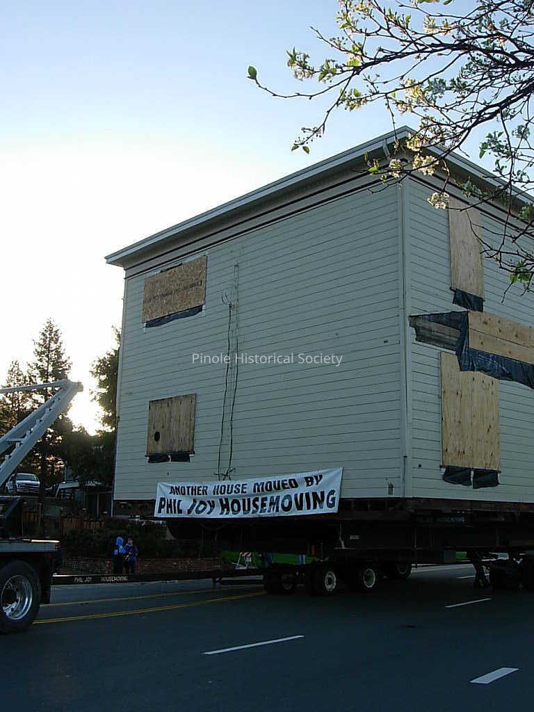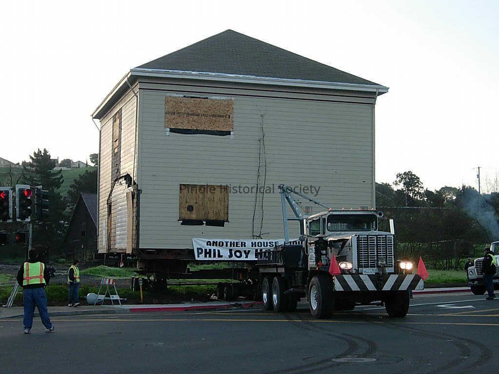 The move of the Faria House to downtown Pinole in 2005 was a citywide event that attracted numerous onlookers along its one-mile journey. Hoisted onto a flatbed truck, the 1880 home built for the son and daughter-in-law of Dr. Samuel J. Tennent inched its way north down Tennent Avenue before turning west on San Pablo Avenue, on the way to its new residence in Heritage Park. The vacant building, photographed by Larry Neptune, was recently painted, and the Pinole Garden Club tends to its rose bushes.Copyright